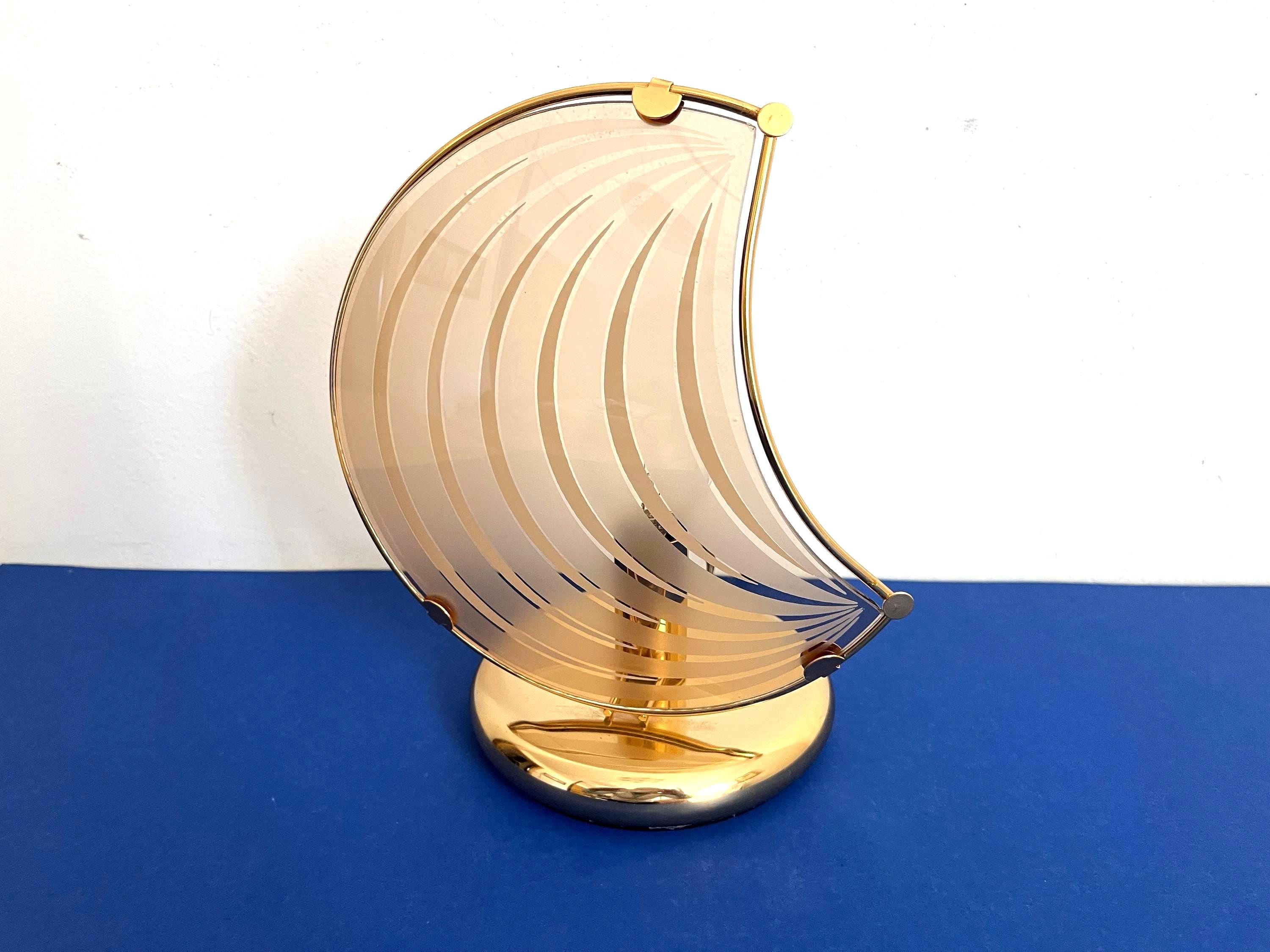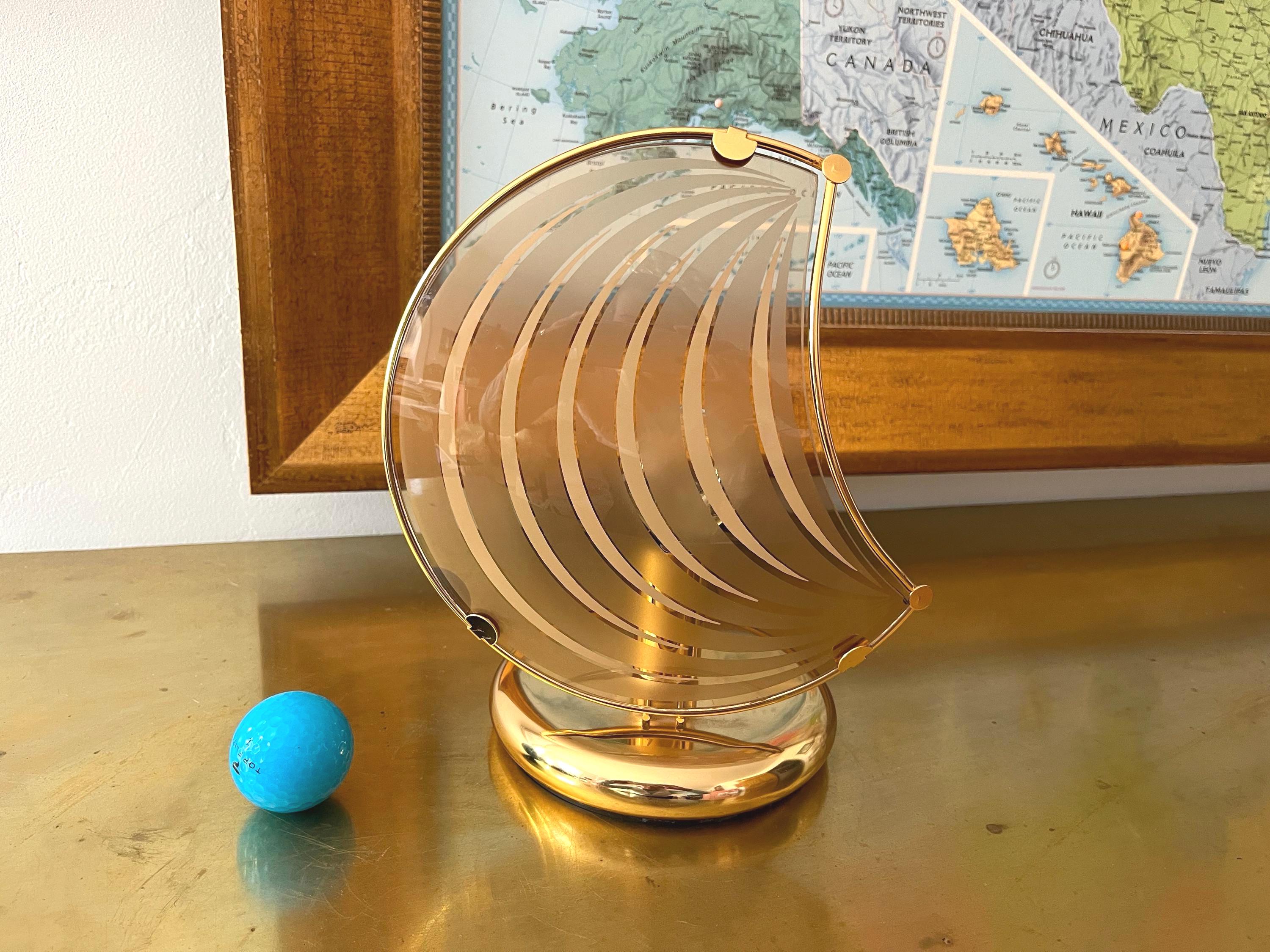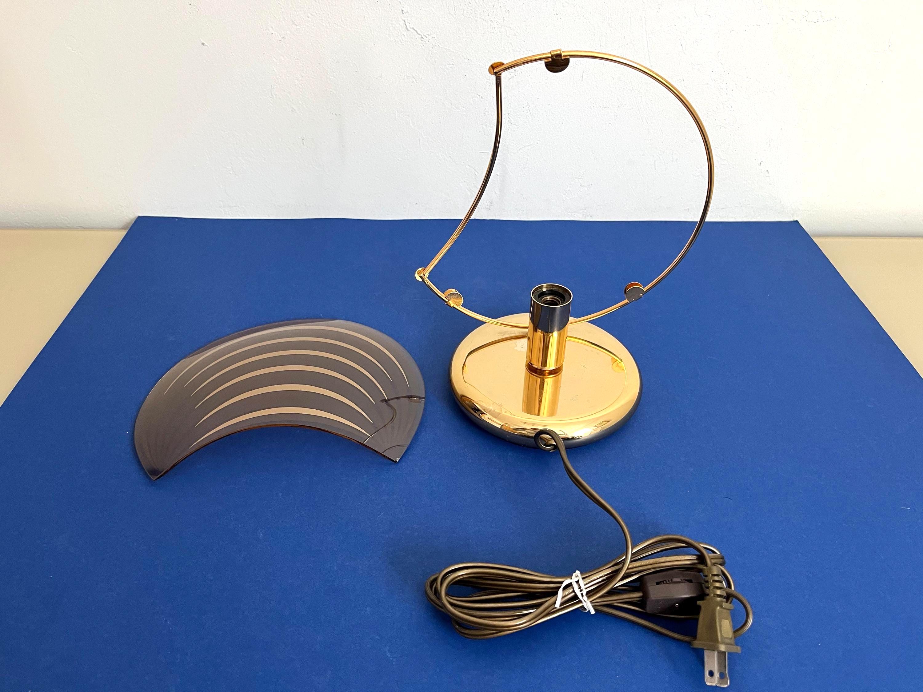 Chic modern Italian accent lamp in the style of Panton with sleek curved crescent moon-shaped glass shade accented by radiating rings clipped into a gold metal frame on a gold metal base.