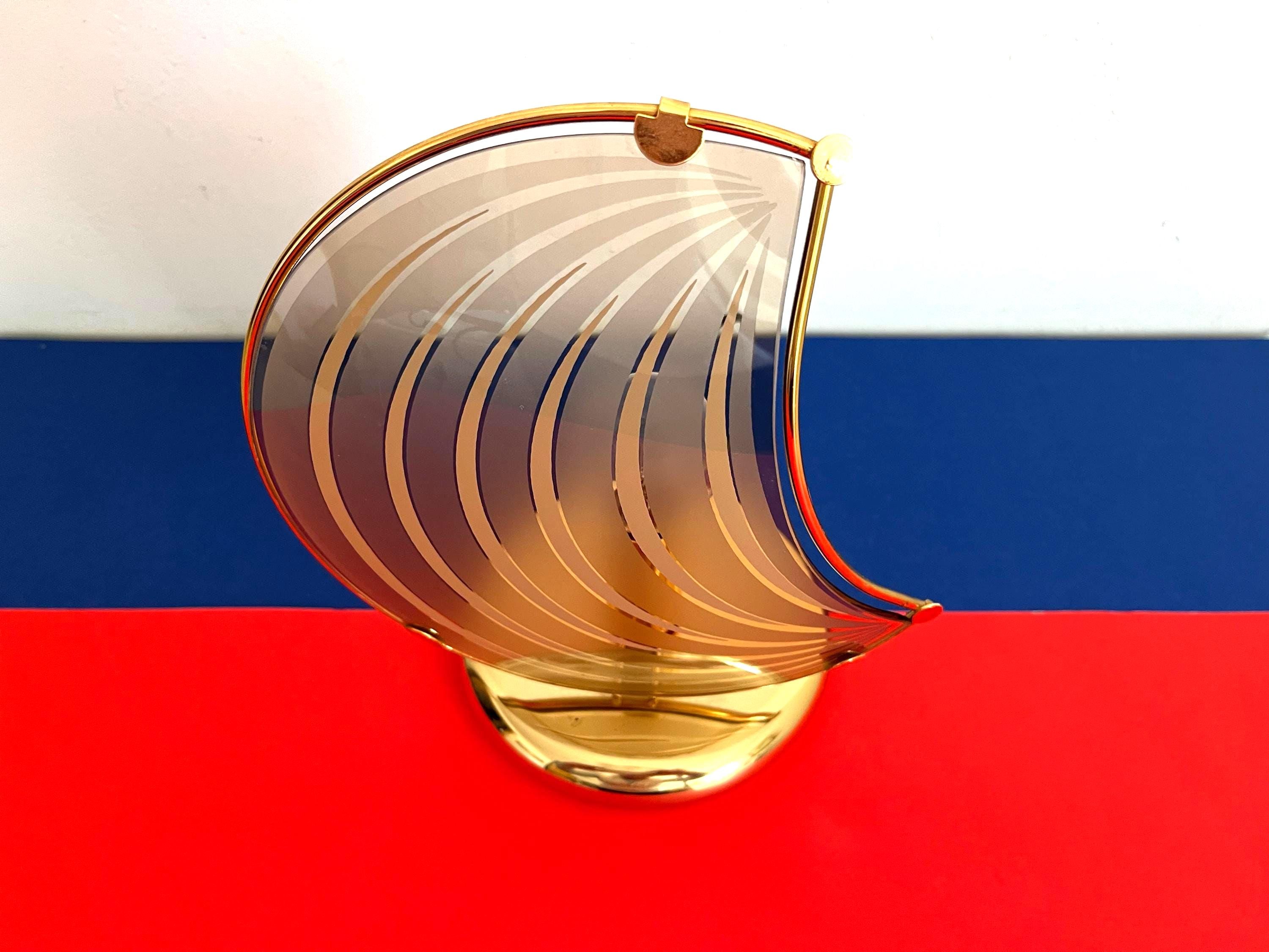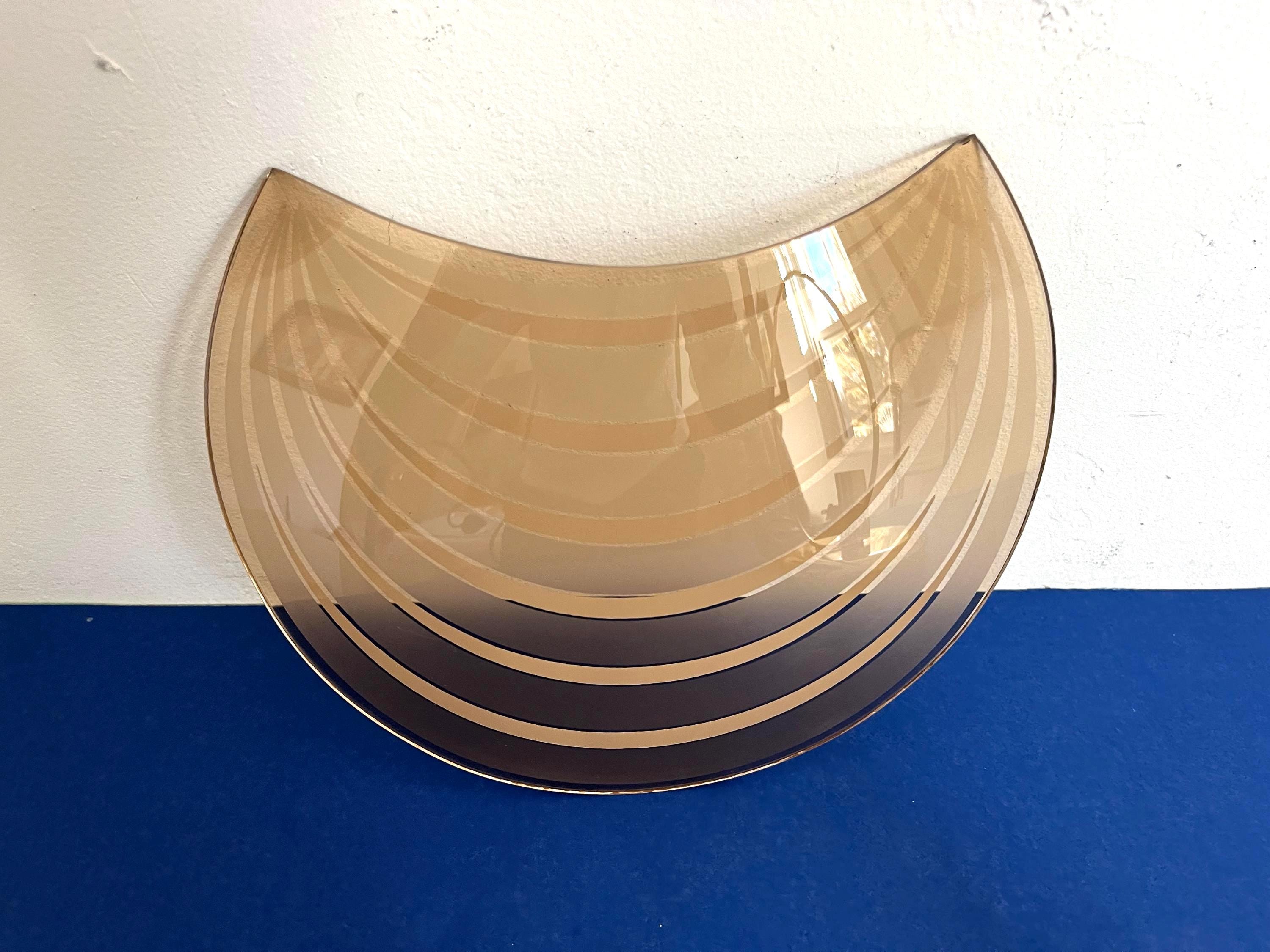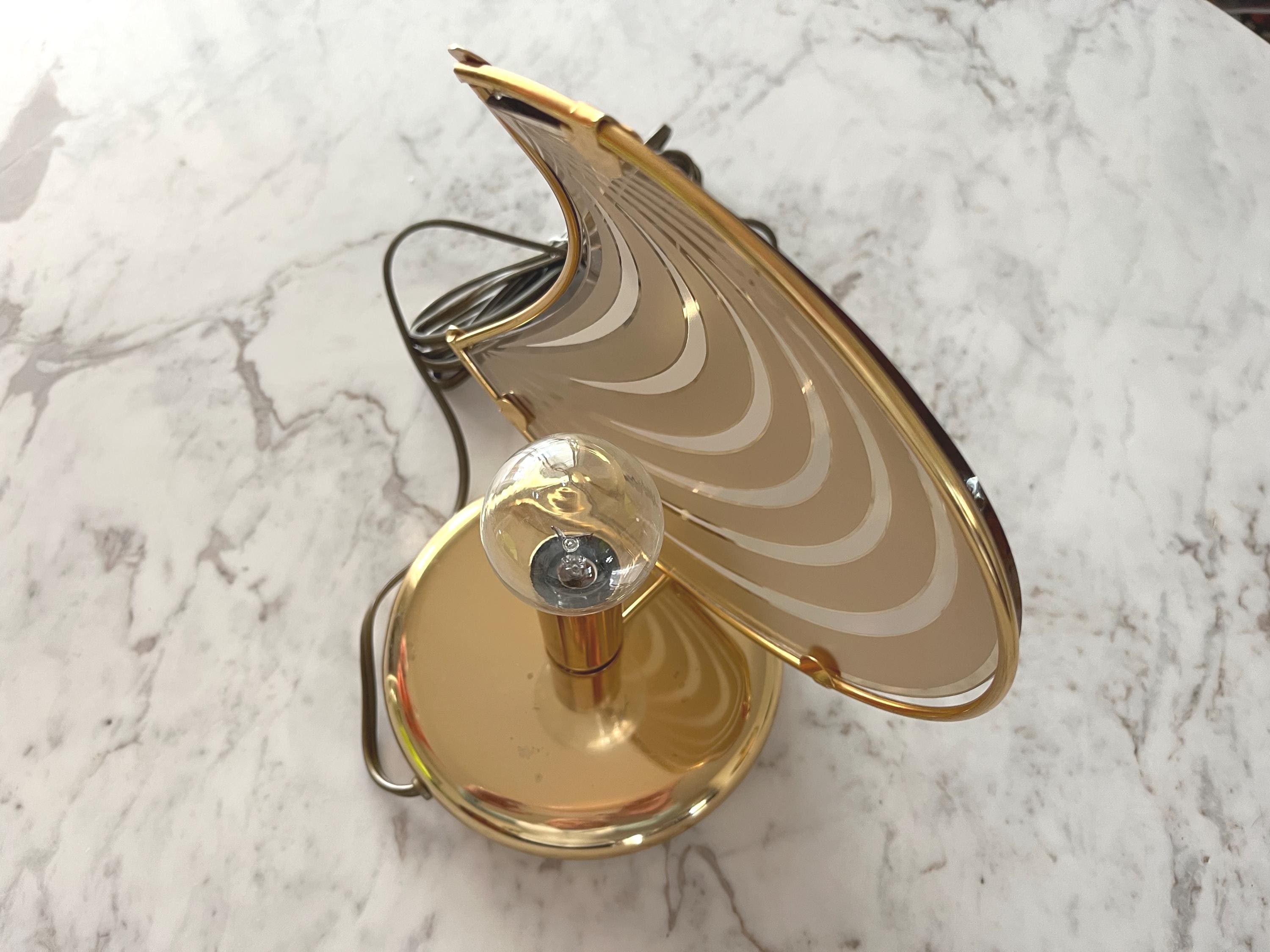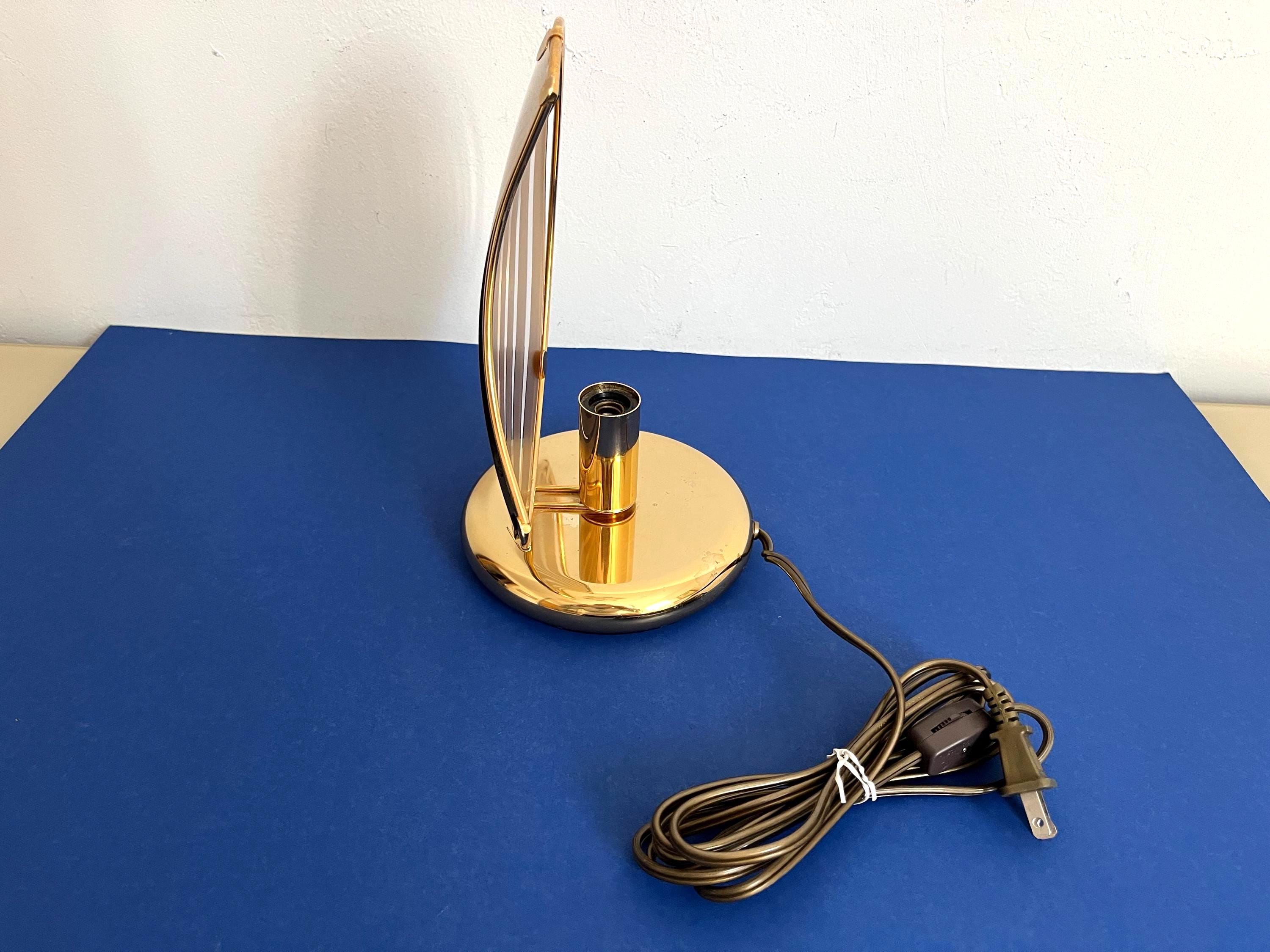 Chic modern Italian accent lamp in the style of Panton with sleek curved crescent moon-shaped glass shade accented by radiating rings clipped into a gold metal frame on a gold metal base.