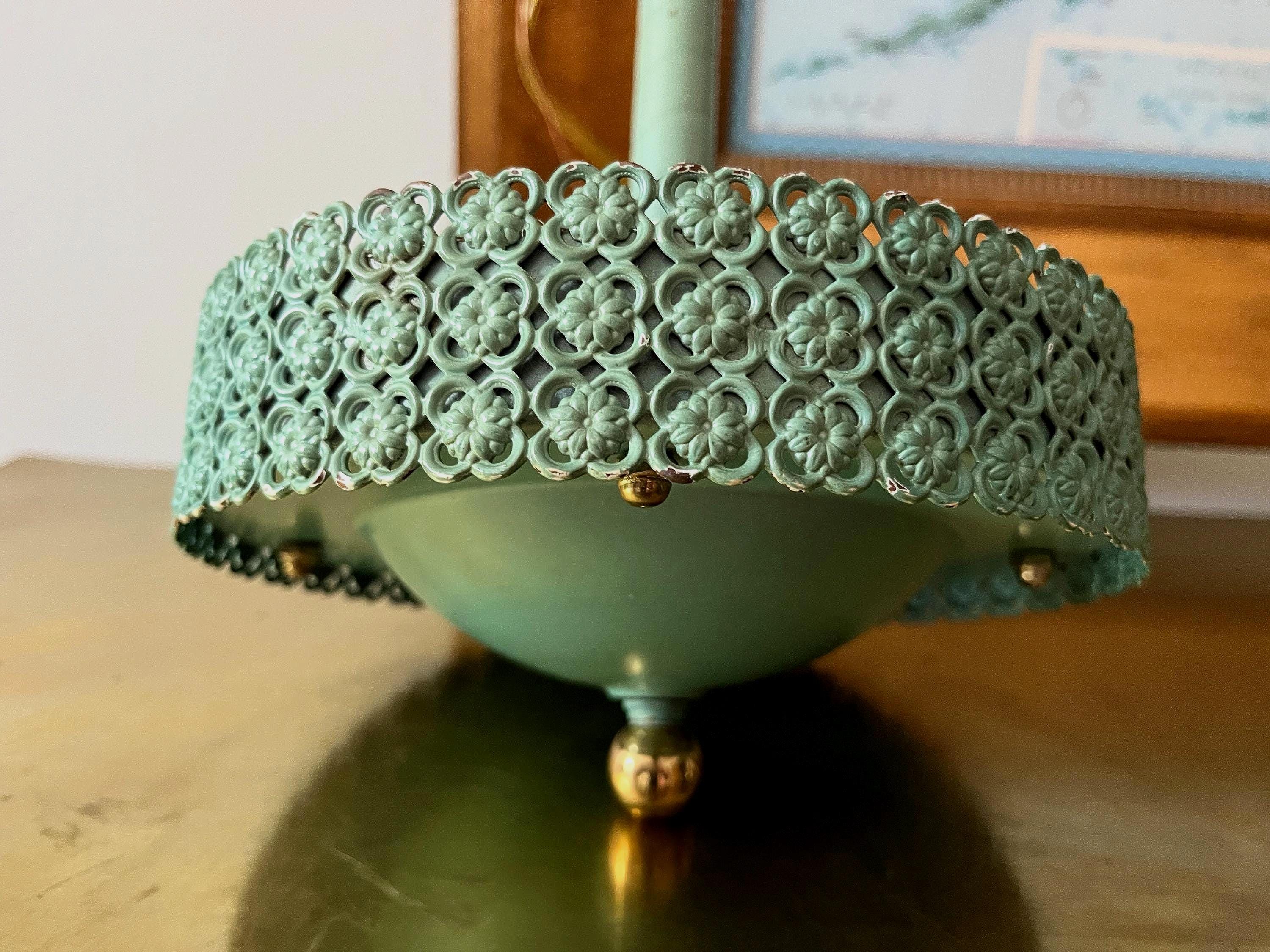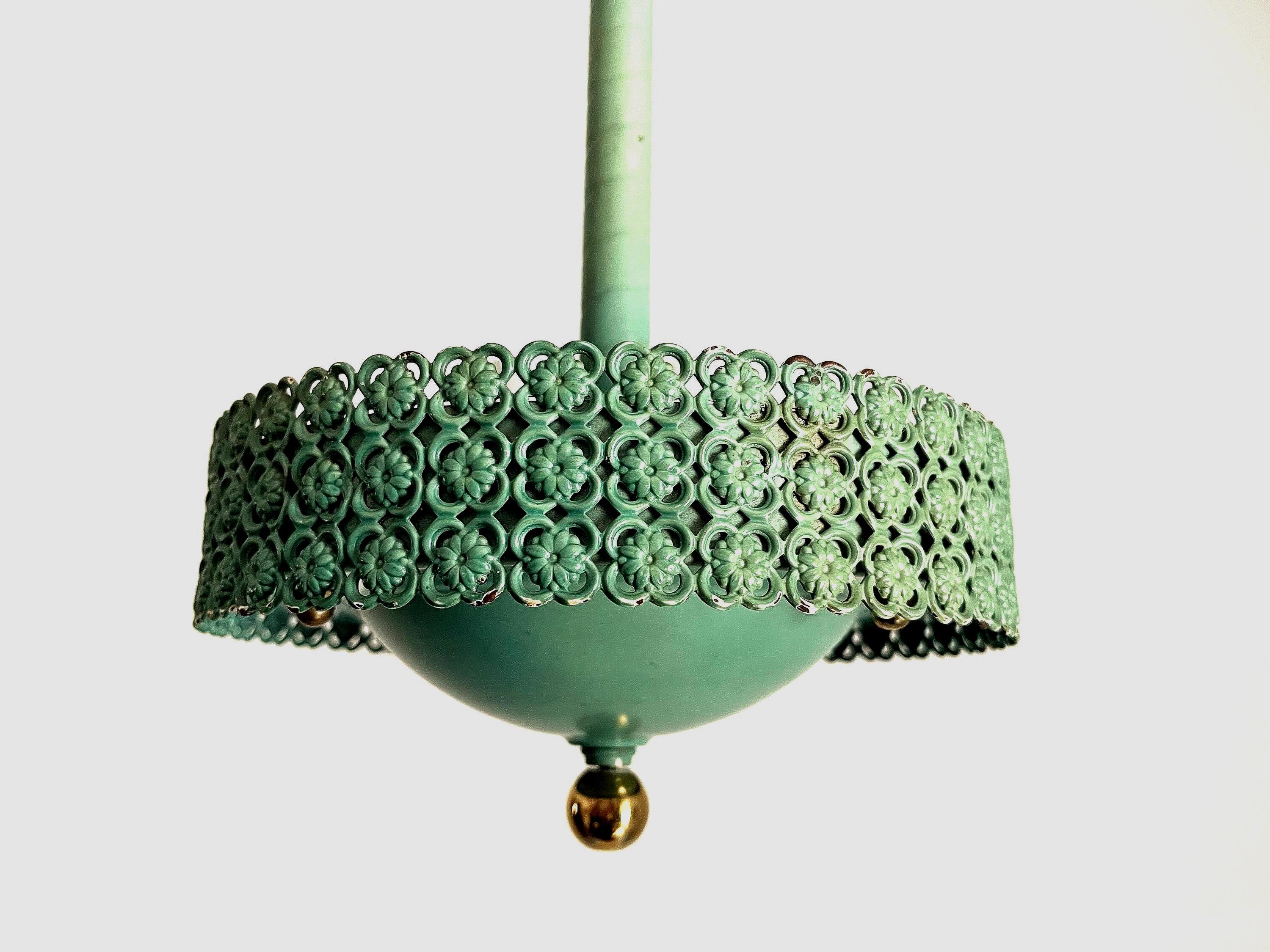Lovely petite 1950s garden style pendant light in a soft turquoise blue enameled metal with rope style neck, filigreed bands of flower blossoms in clovers, and a round basin with brass ball switch and four lights.