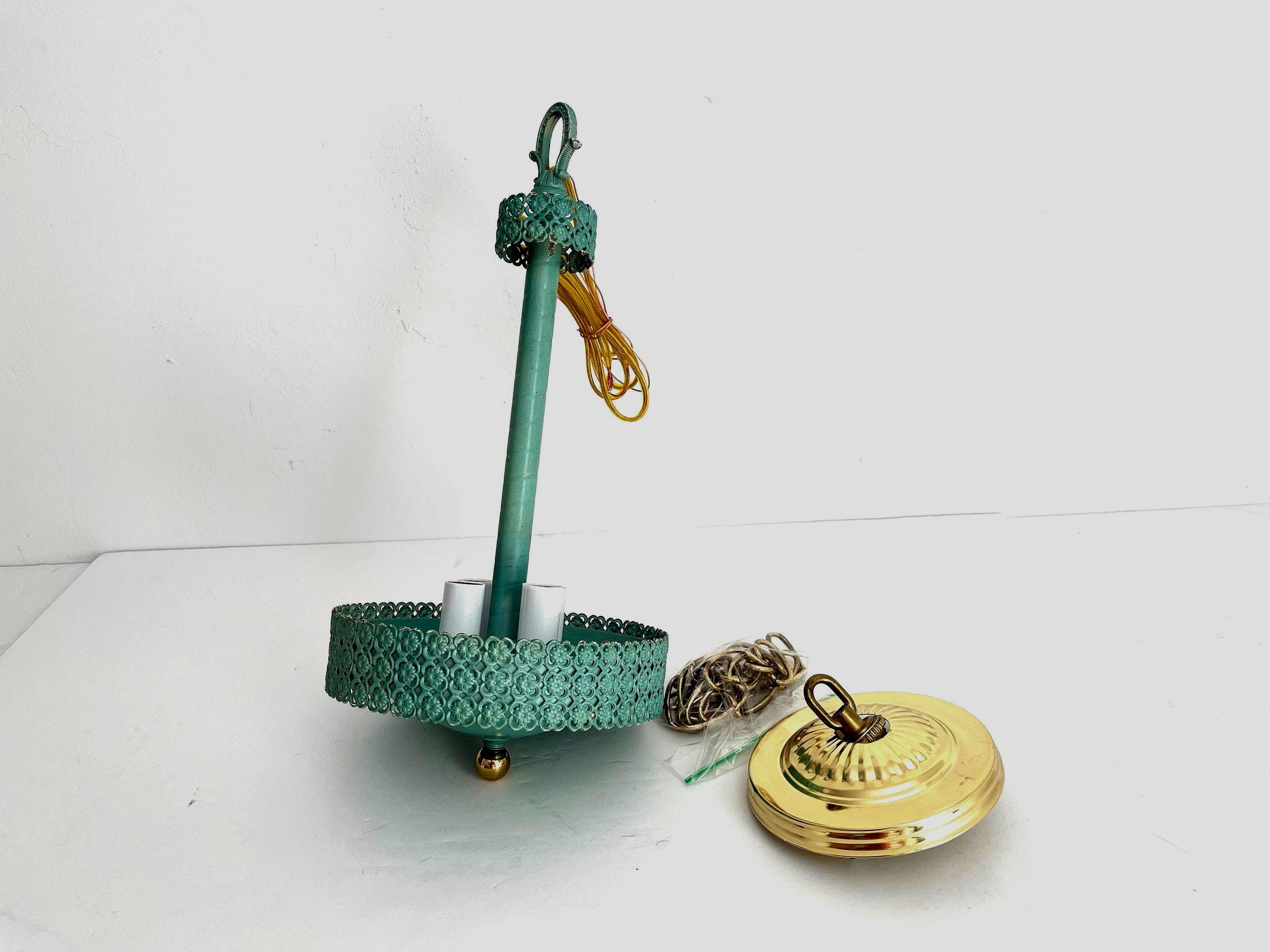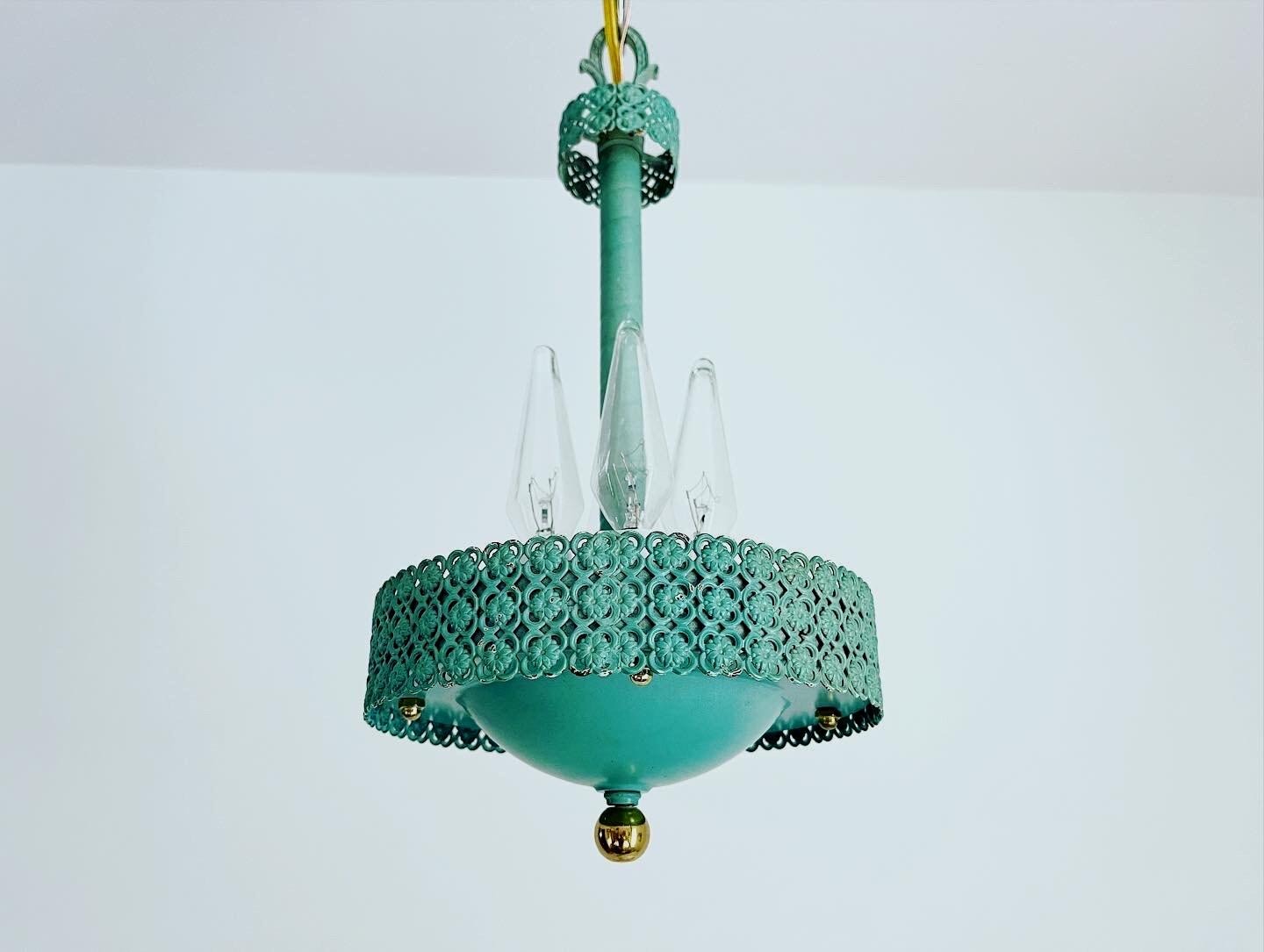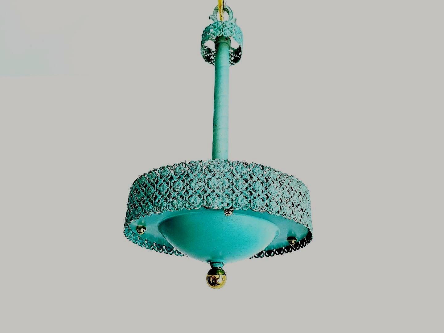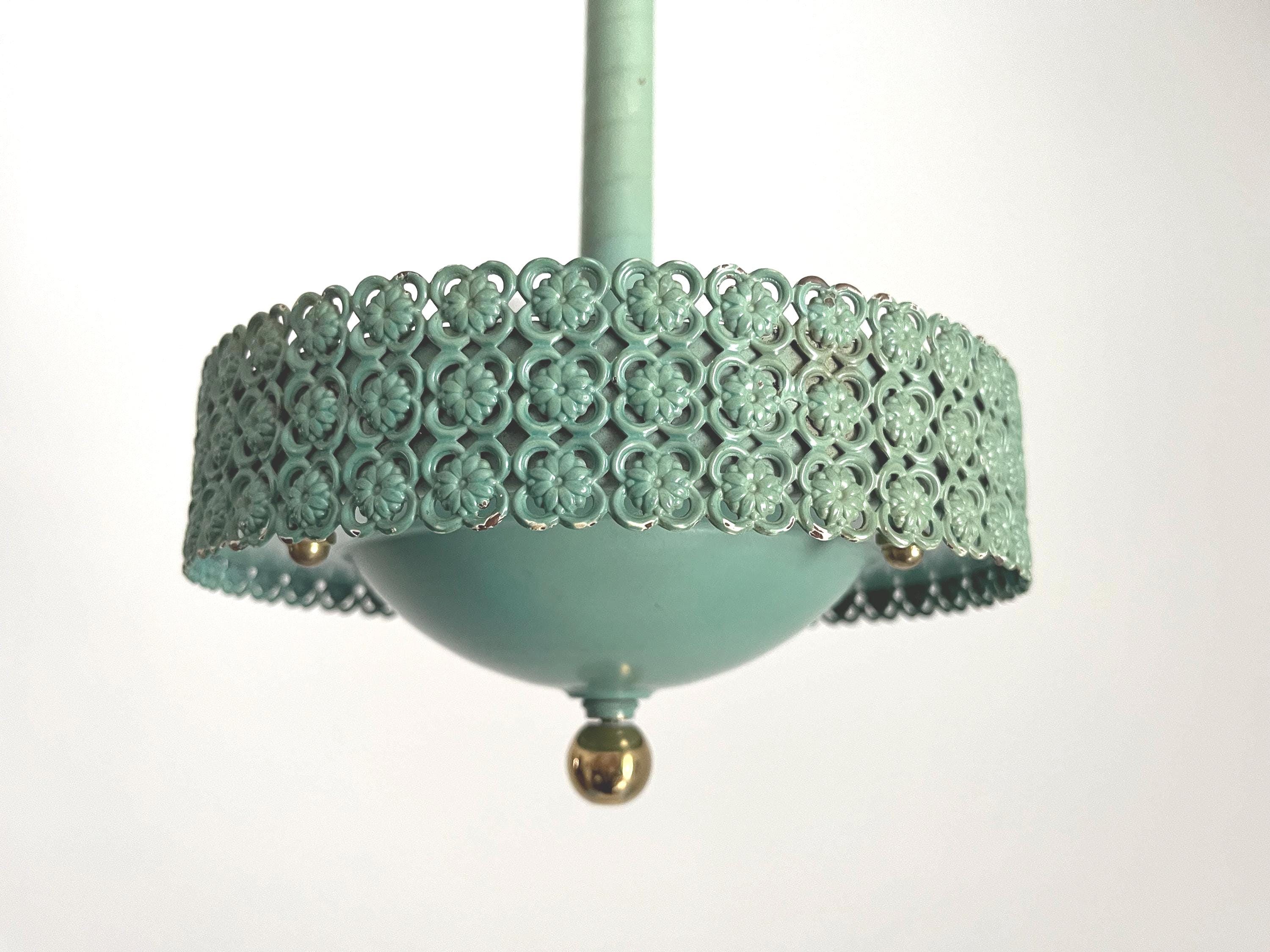 Lovely petite 1950s garden style pendant light in a soft turquoise blue metal with rope style neck, filigreed bands of flower blossoms in clovers, and a round basin with brass ball switch and four lights.
