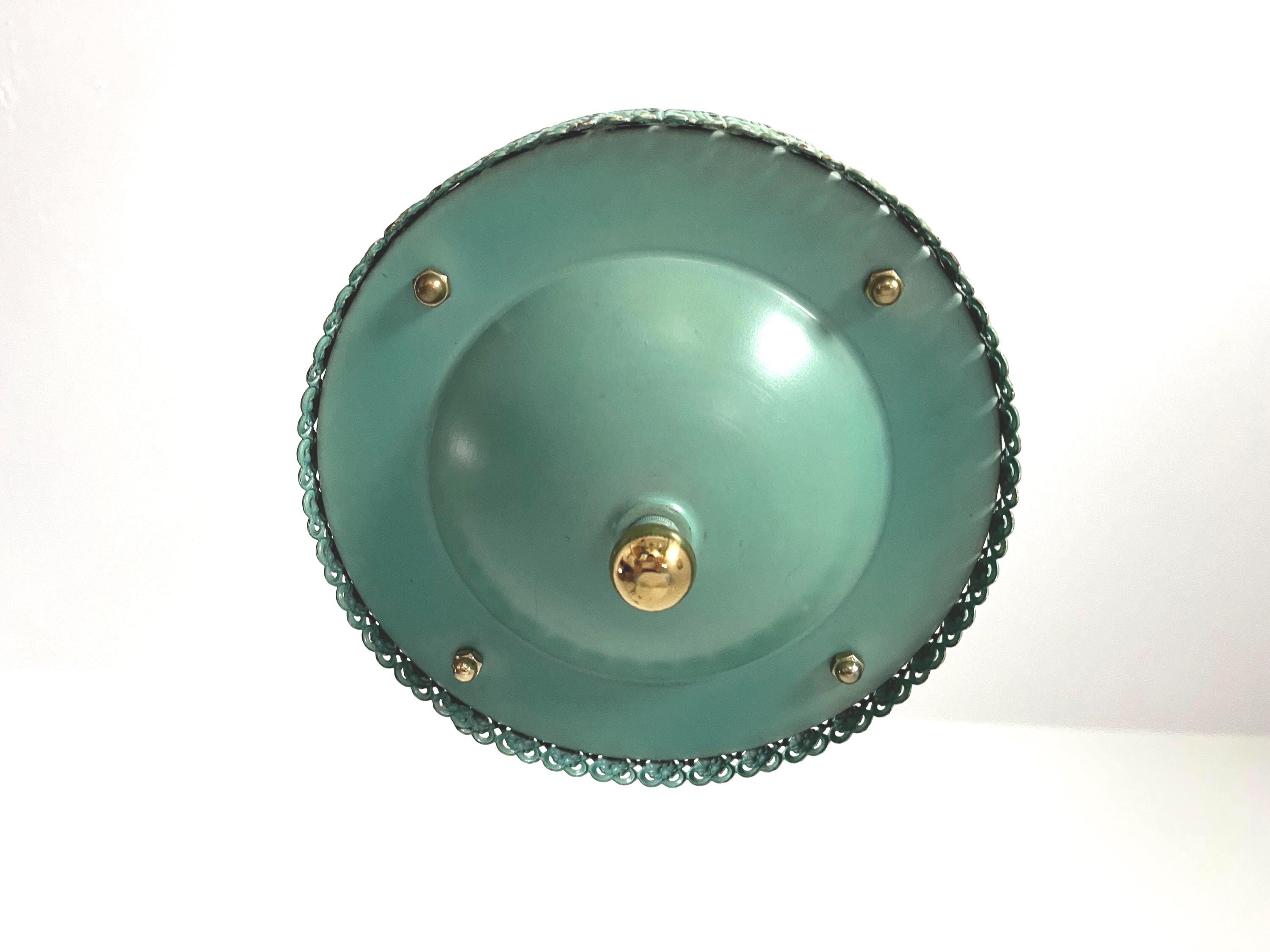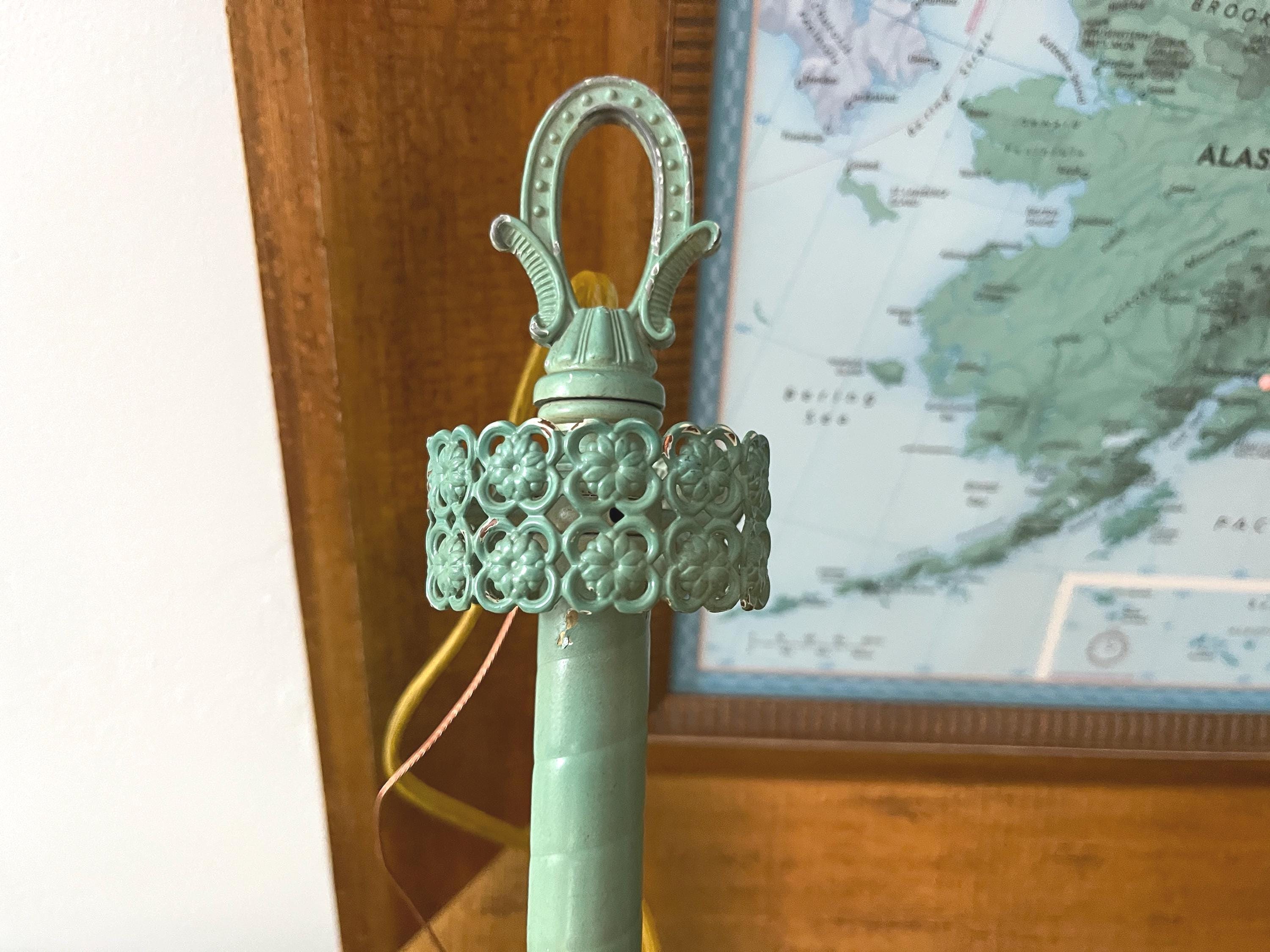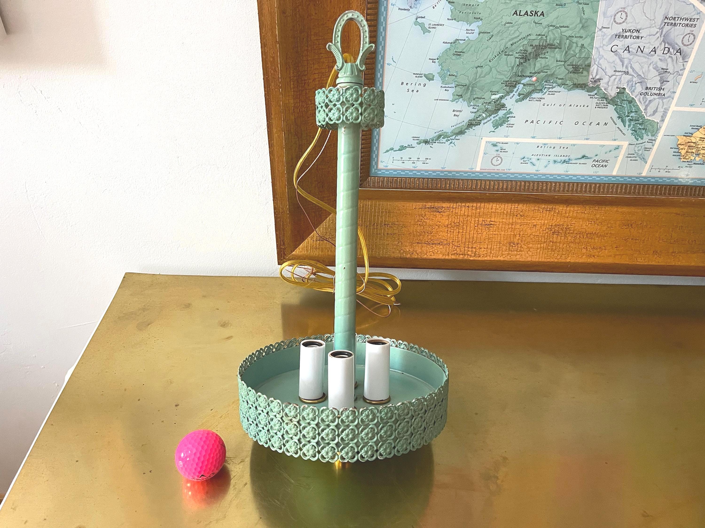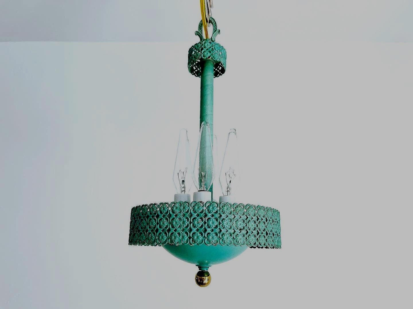 Lovely petite 1950s garden style pendant light in a soft turquoise blue metal with rope style neck, filigreed bands of flower blossoms in clovers, and a round basin with brass ball switch and four lights.