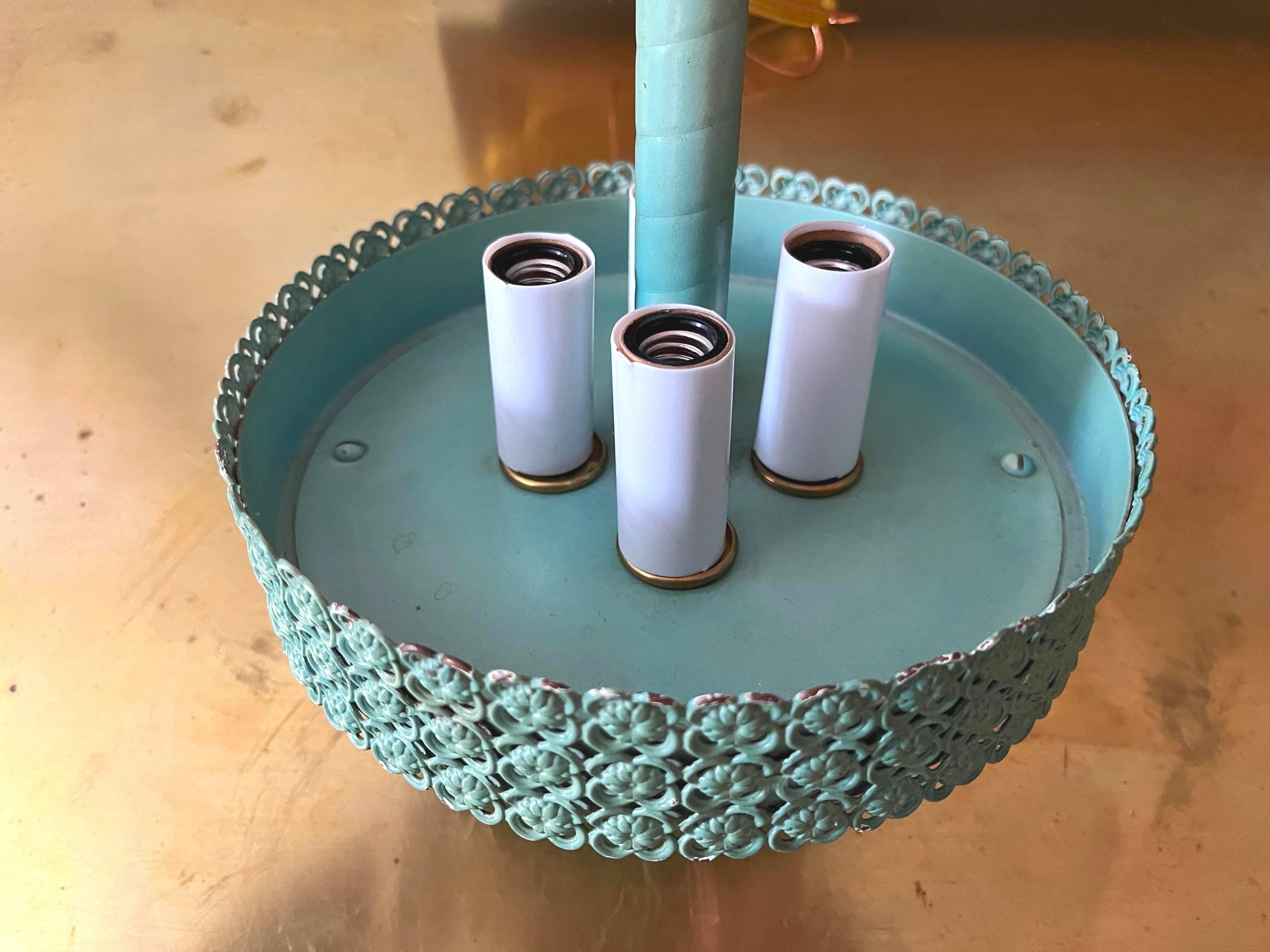 Professionally restored with new wiring, sockets, and candle covers for candelabra base bulbs. New decorative bulbs pictured are included by Satco, S3744, 25W incandescent; also available online.