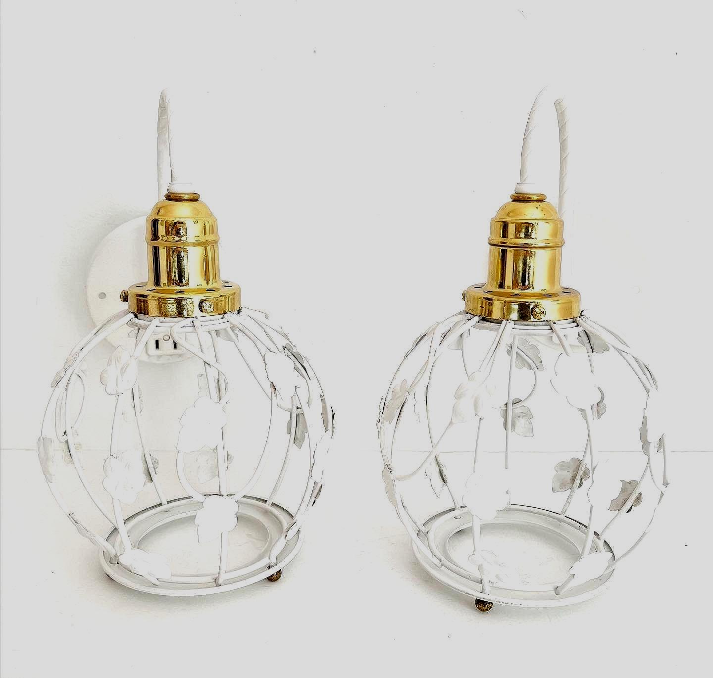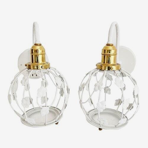 Light and airy pair of white tole sconces by Halcolite featuring open cage globes covered in ivy and suspended from curvy rope-style arms with new brass finials and one light each.