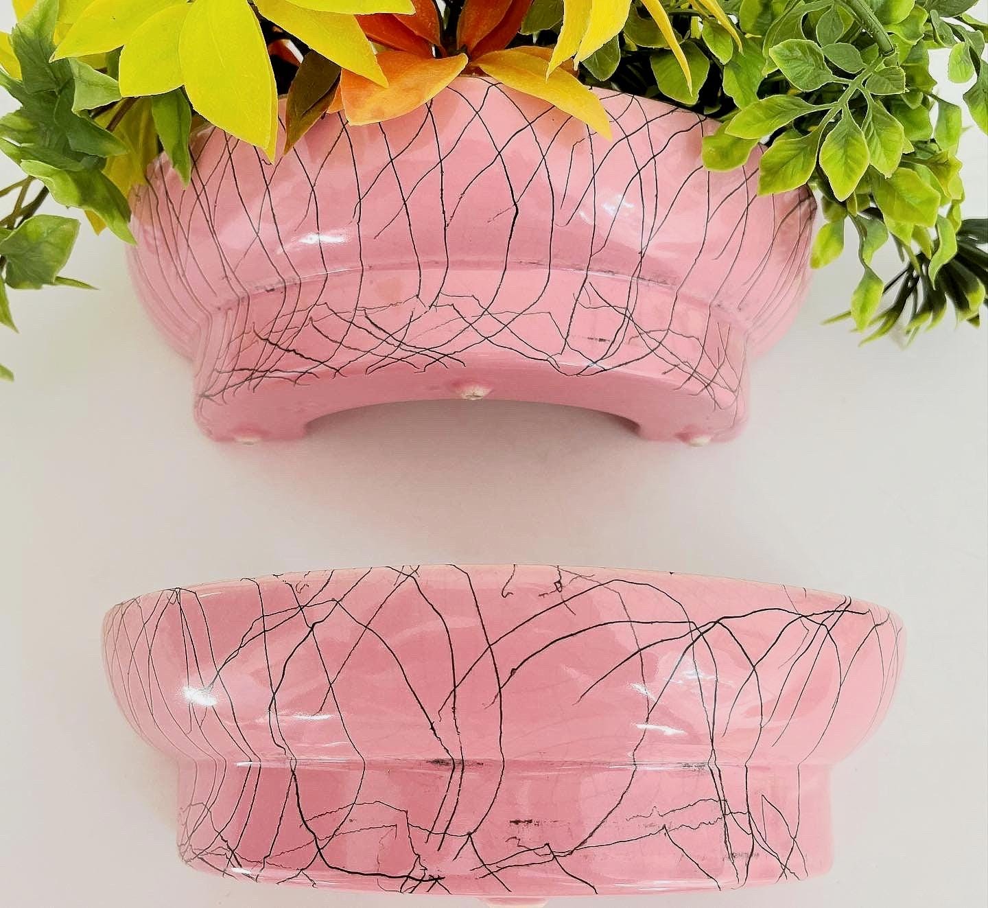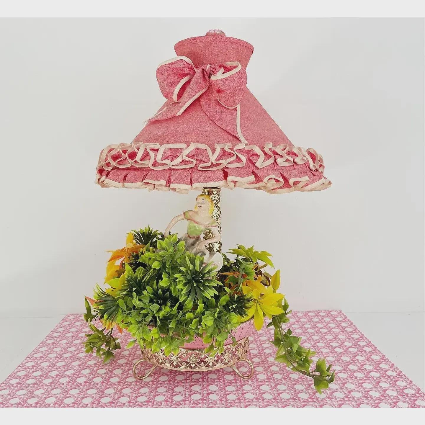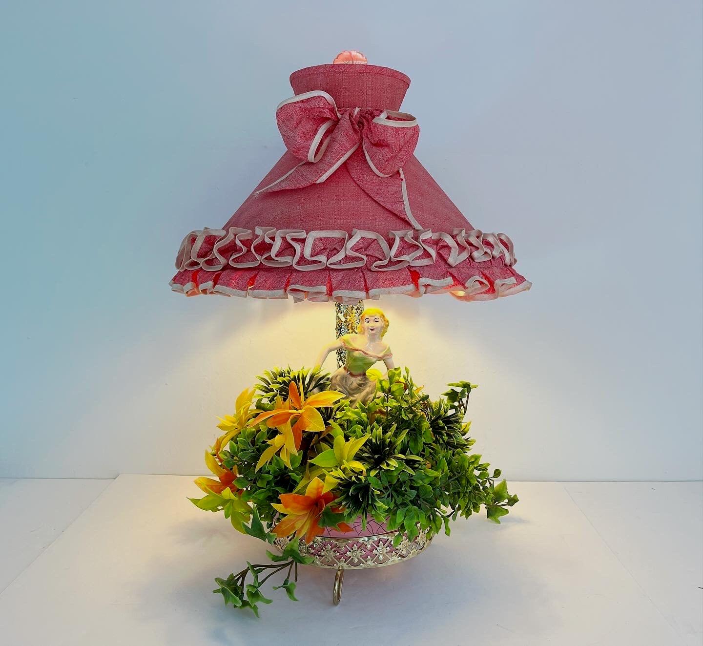 Fabulous fifties figural planter lamp featuring a hand painted porcelain woman set into a pierced gold tone footed lamp base with inset pink and black planter basins filled with the original plastic flowers and vines. Figurine is signed.