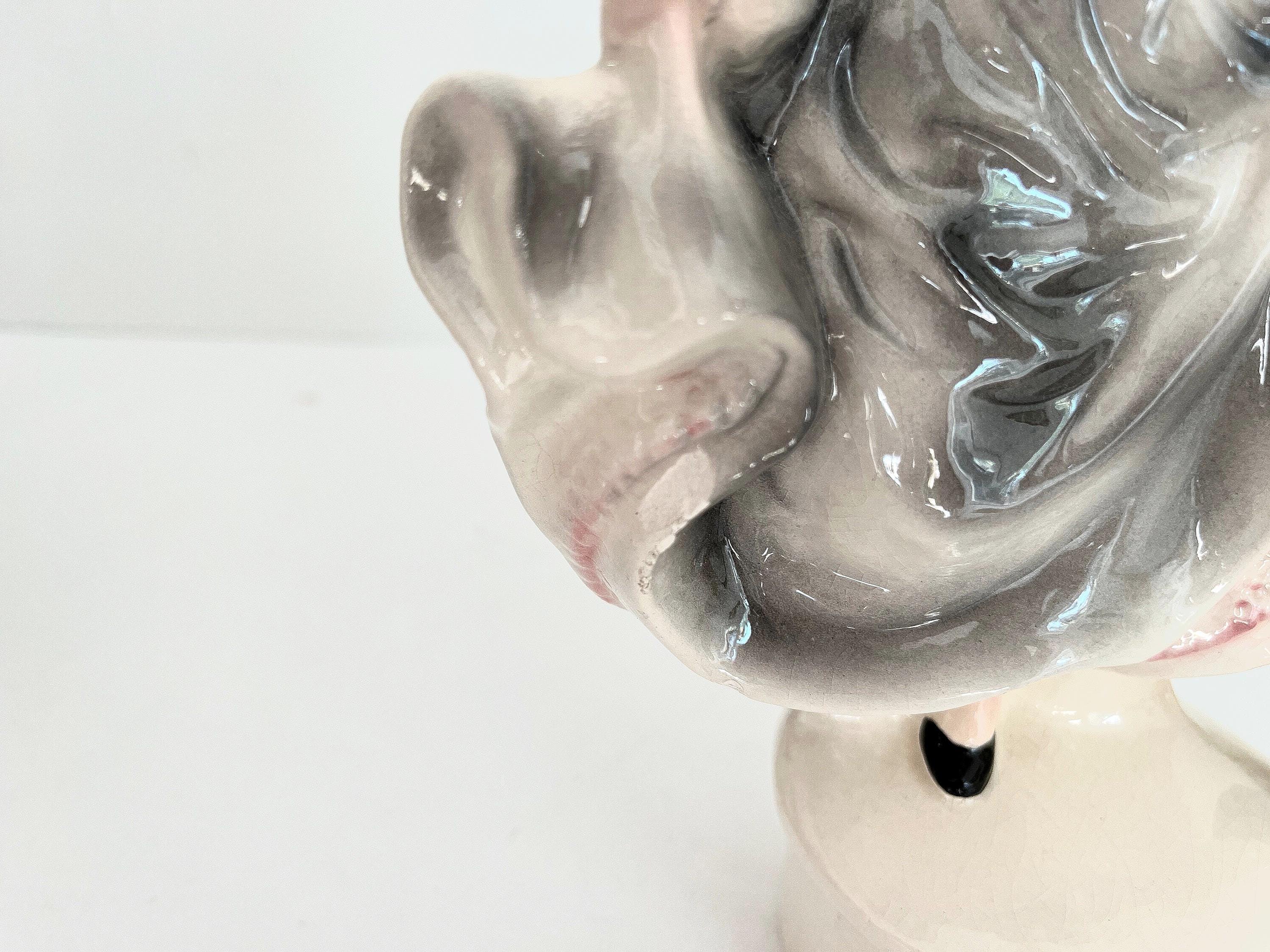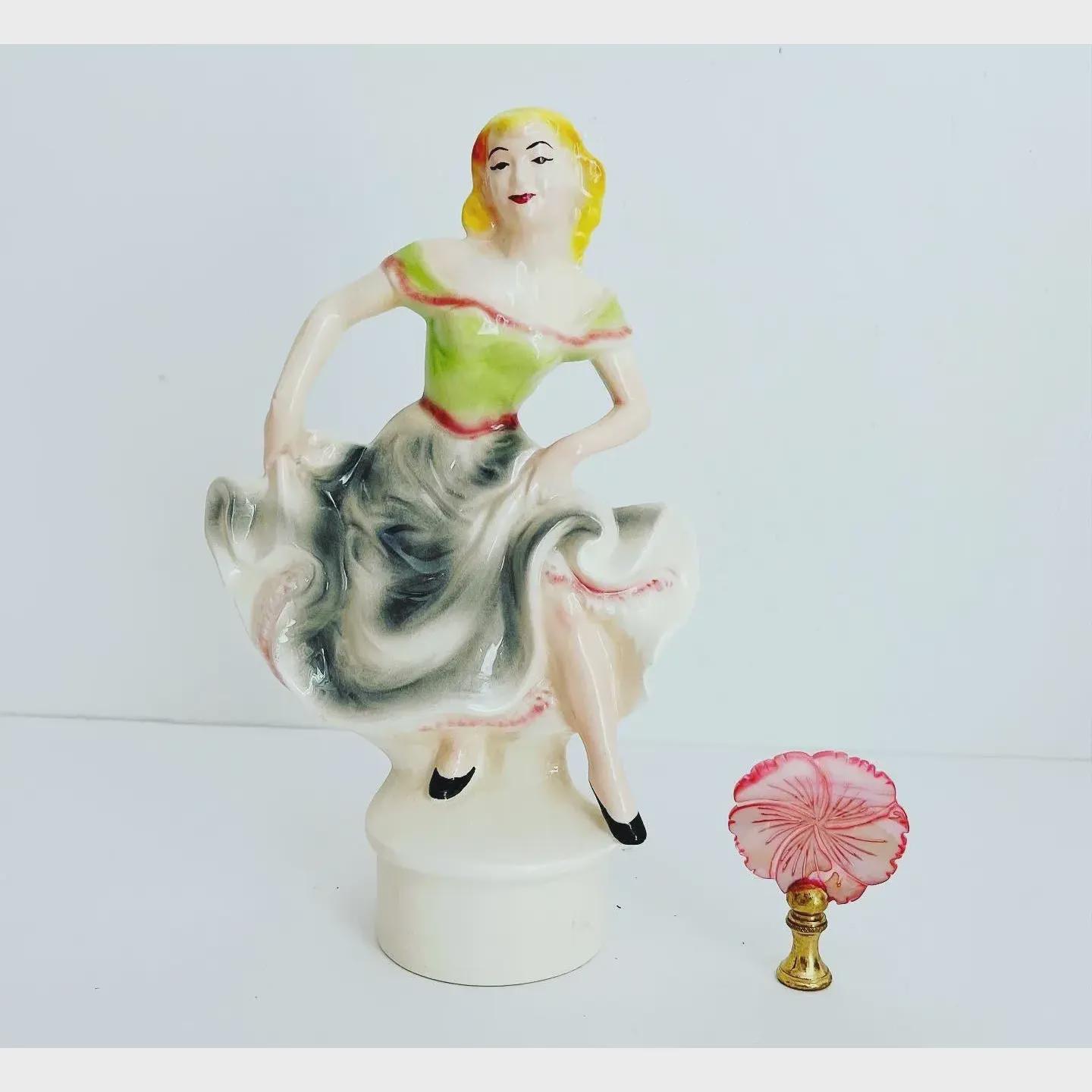 In lovely VINTAGE condition; figure has edge chips, wear to shade interior and fabric with split seam.