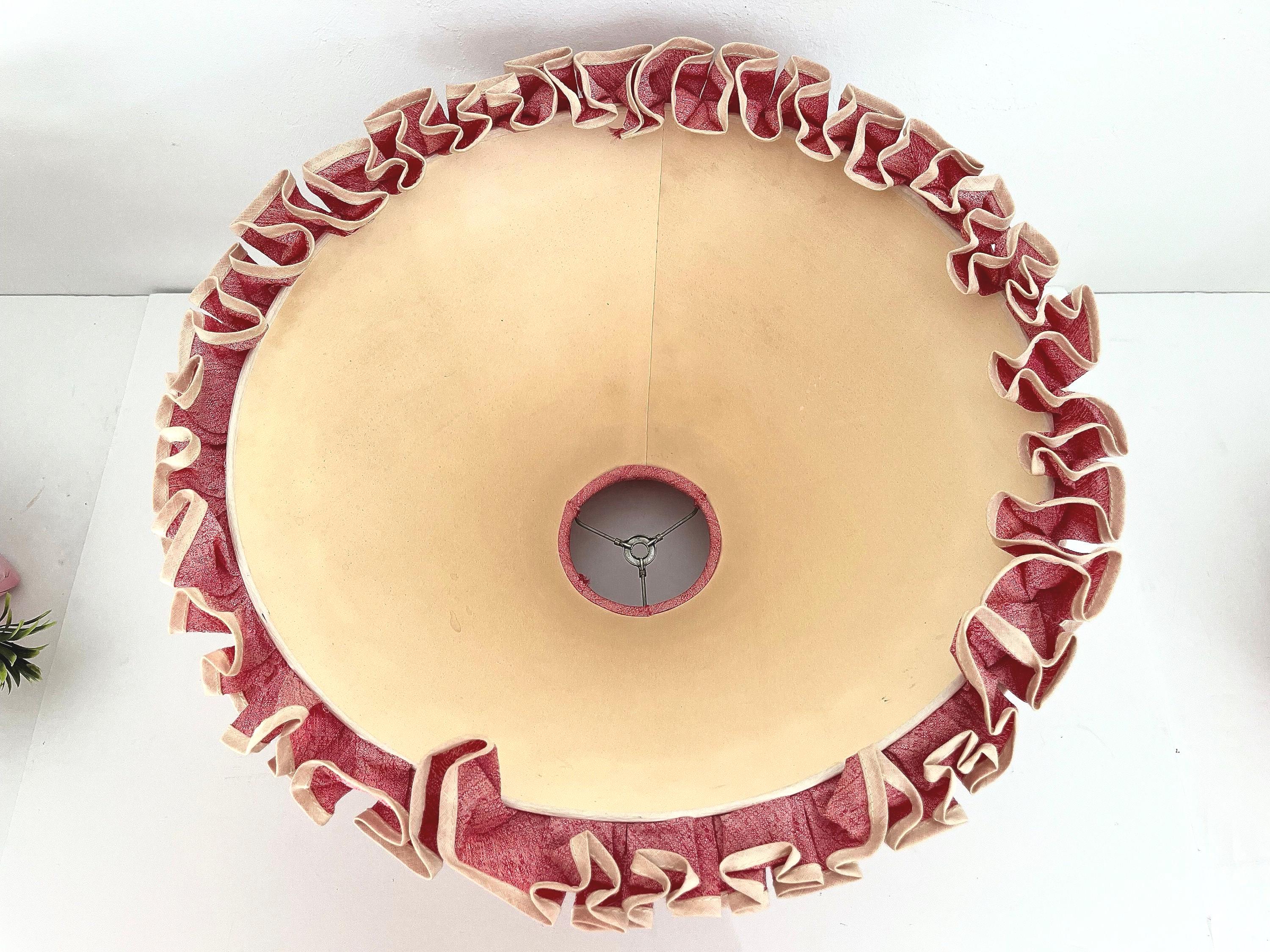 Professionally restored with new wiring and socket for standard bulb. Original ruffle-trimmed fabric shade, harp, and pink shell flower finial included.