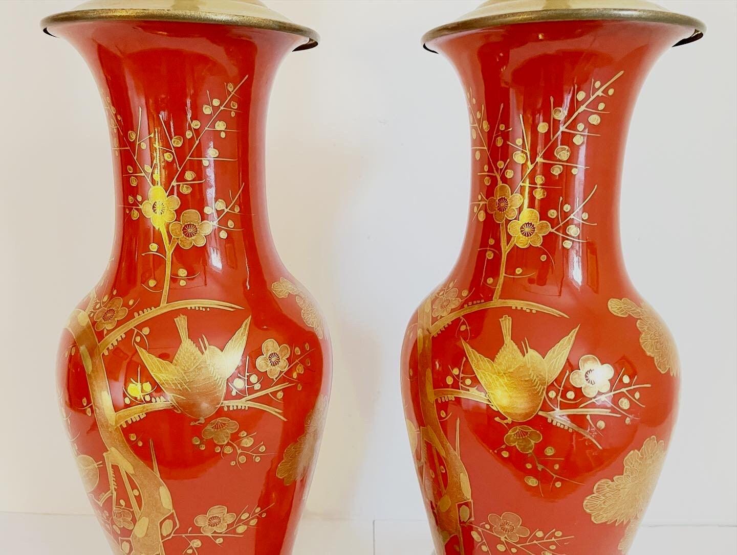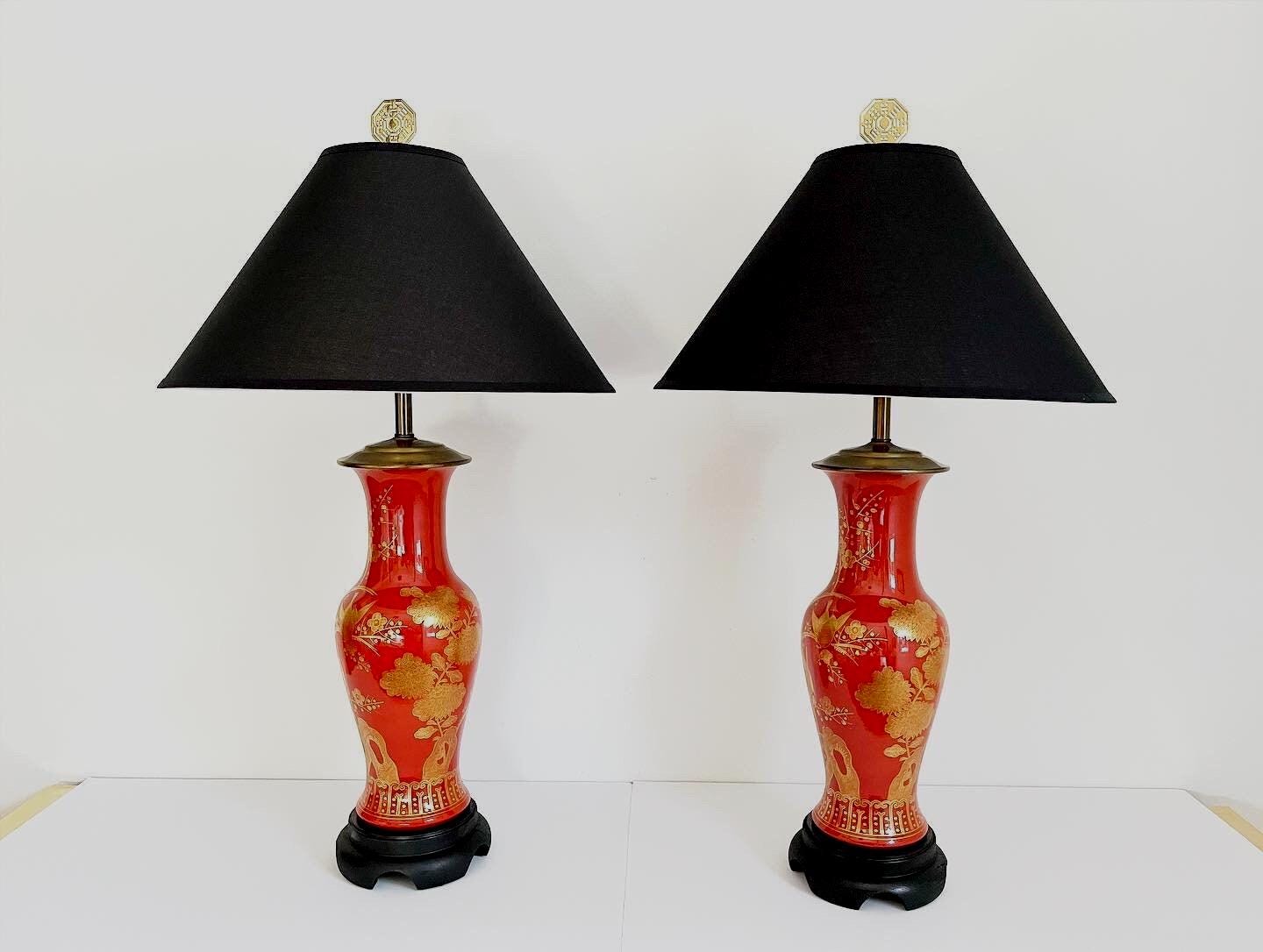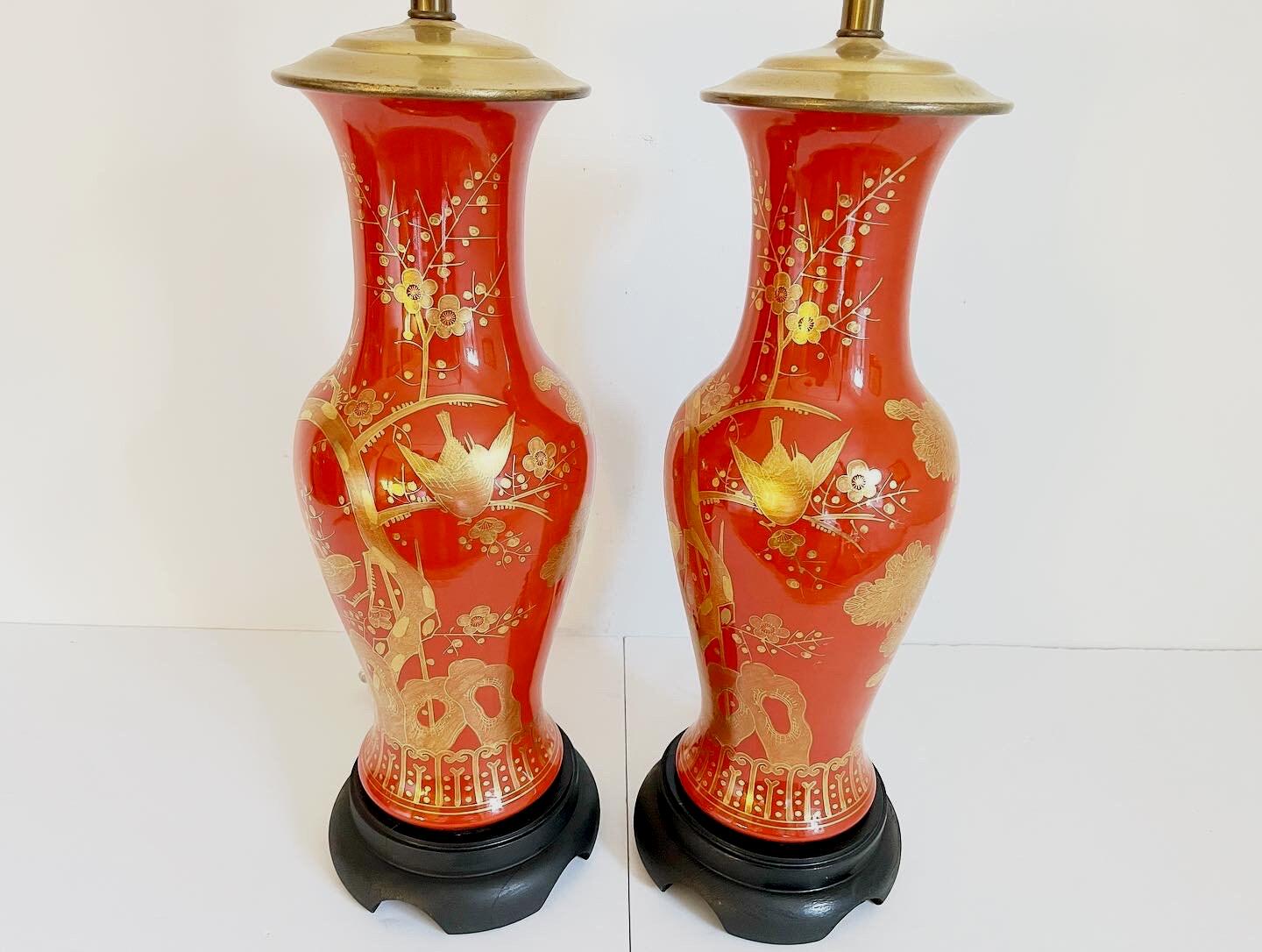 Stunning big pair of radiant deep orange porcelain urn lamps hand painted with gold birds in cherry trees, flowering chrysanthemums, and geometric borders on painted black wood notched bases.