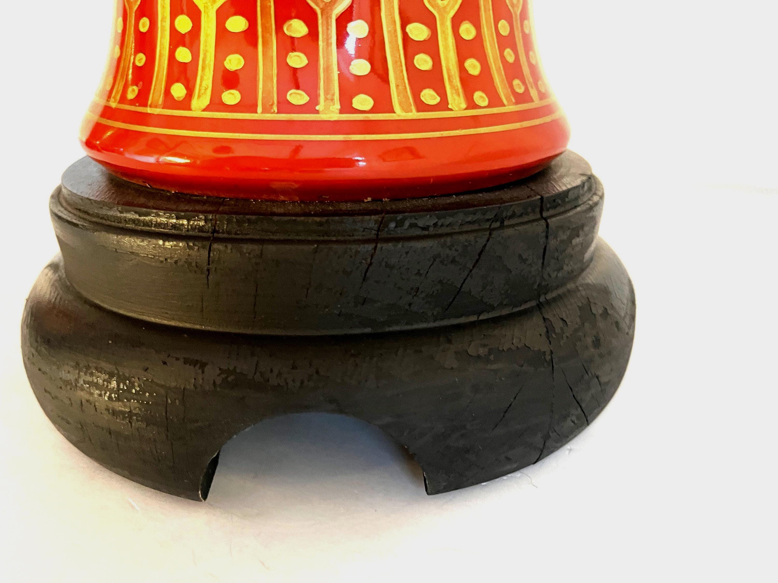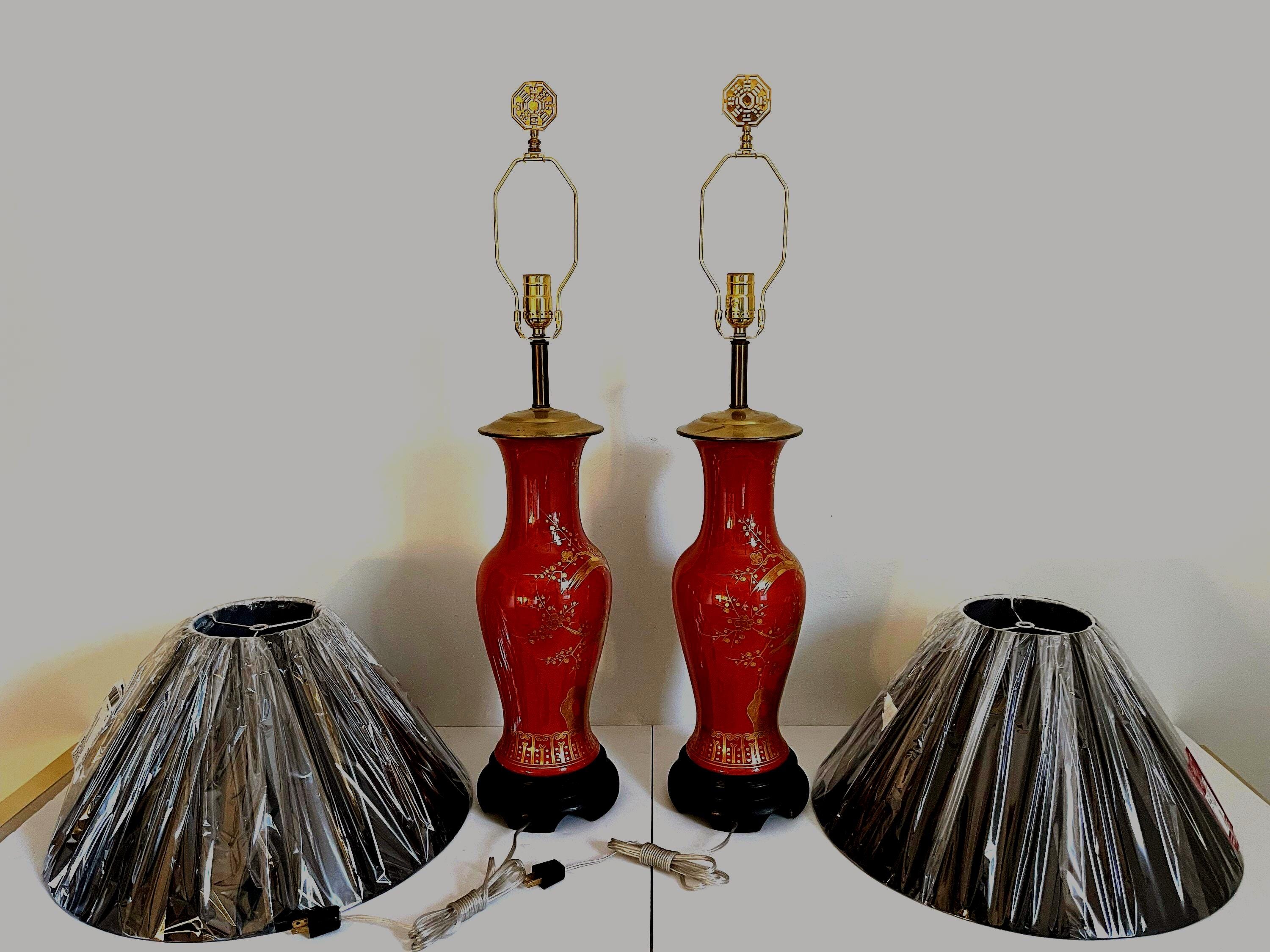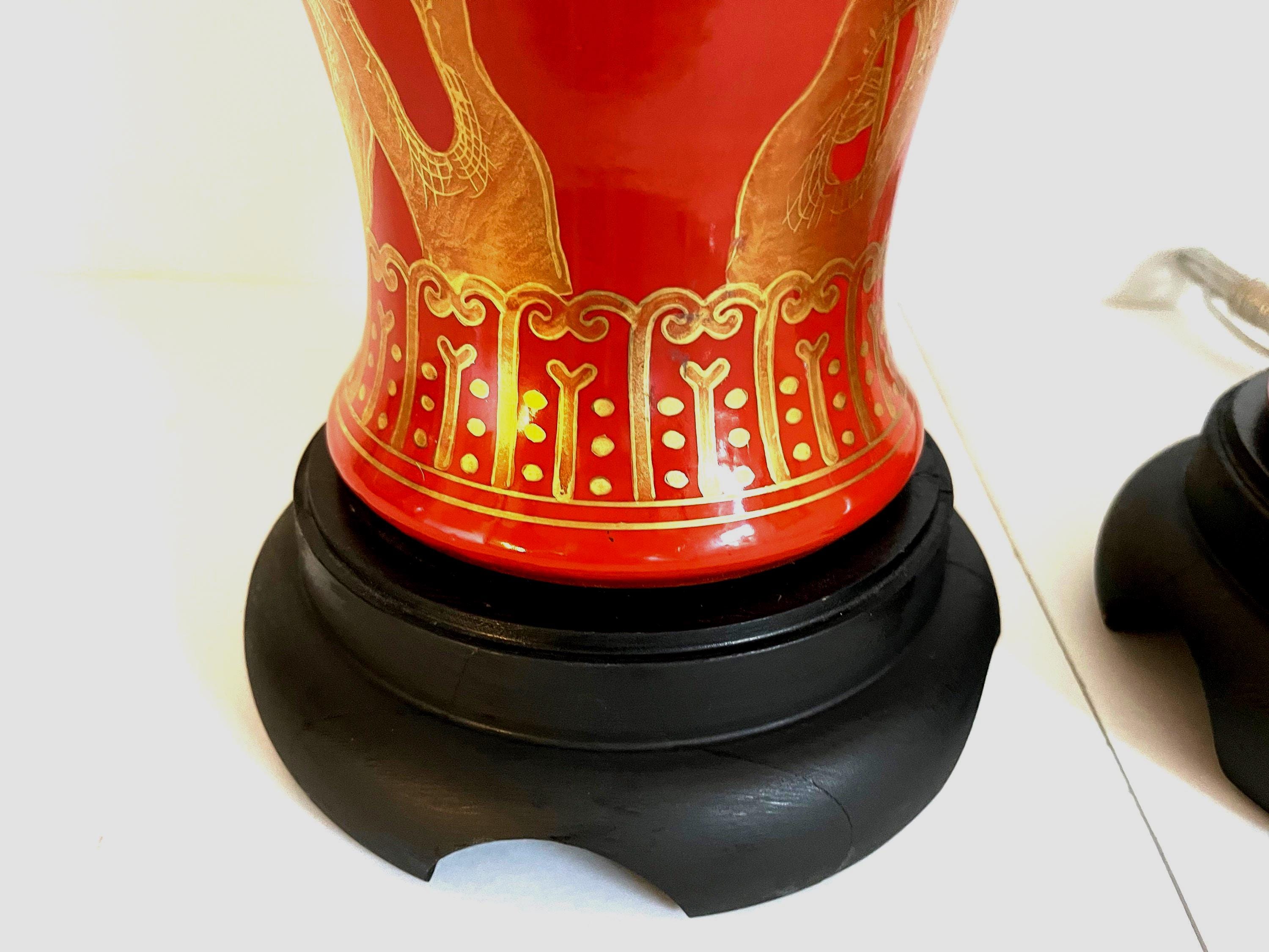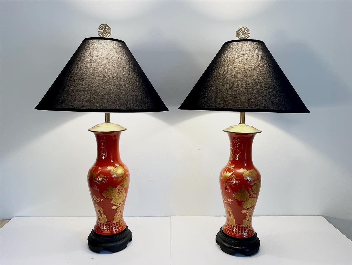 Stunning big pair of radiant deep orange porcelain urn lamps hand painted with gold birds in cherry trees, flowering chrysanthemums, and geometric borders on painted black wood notched bases.