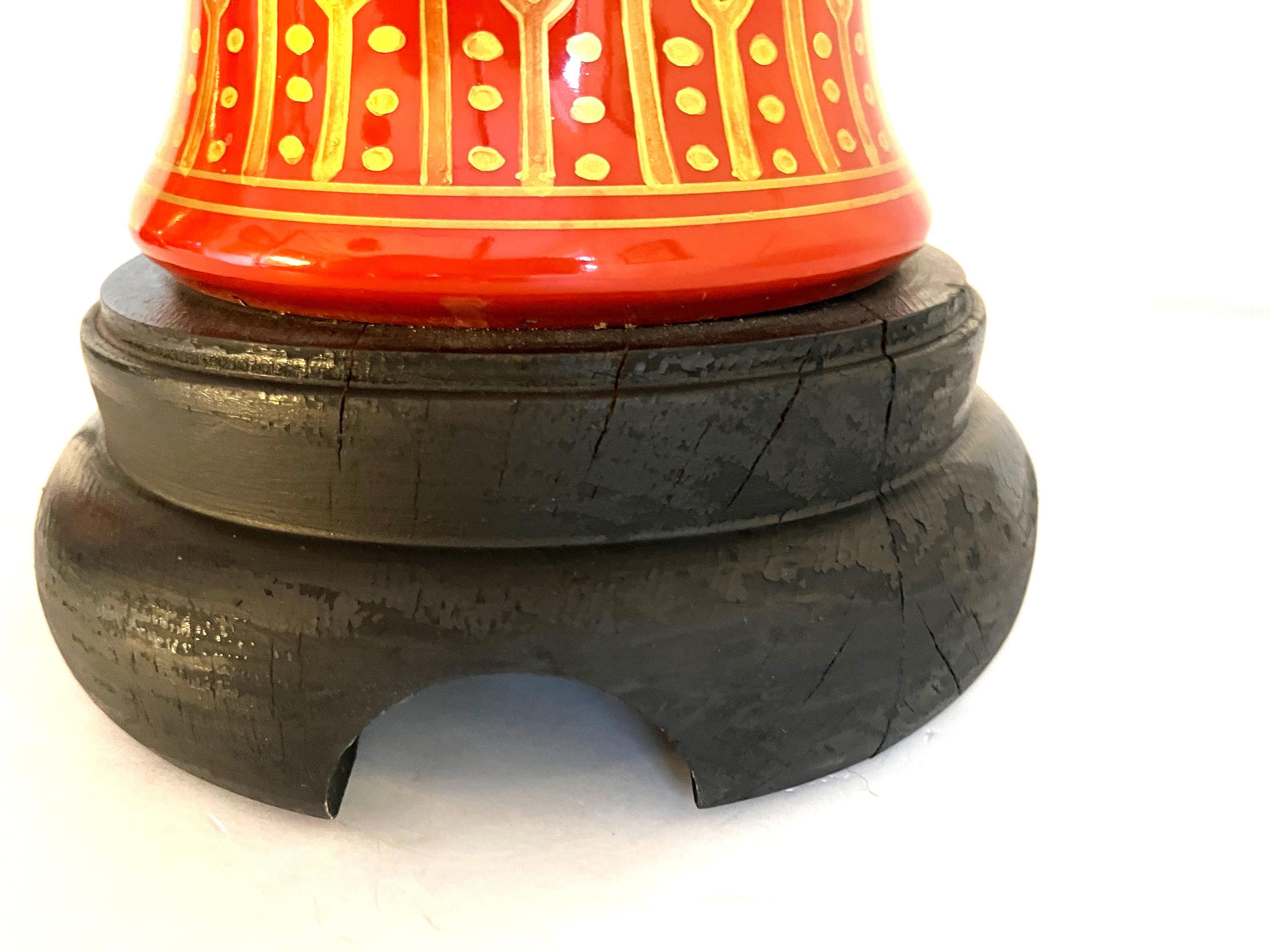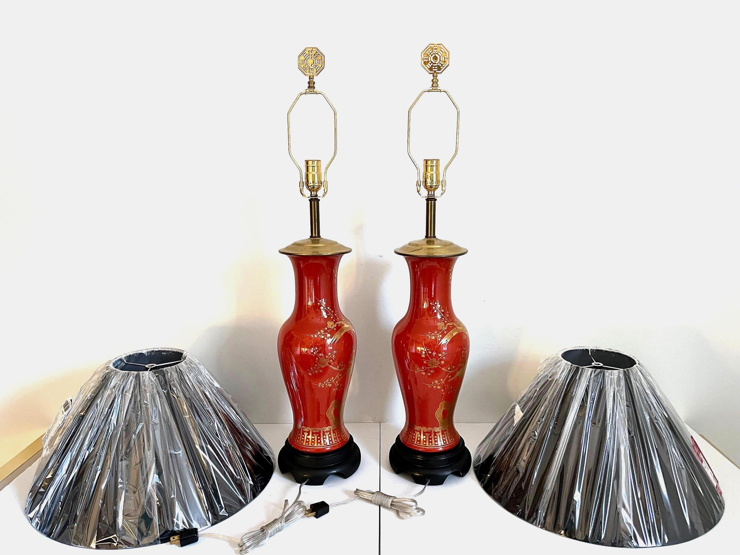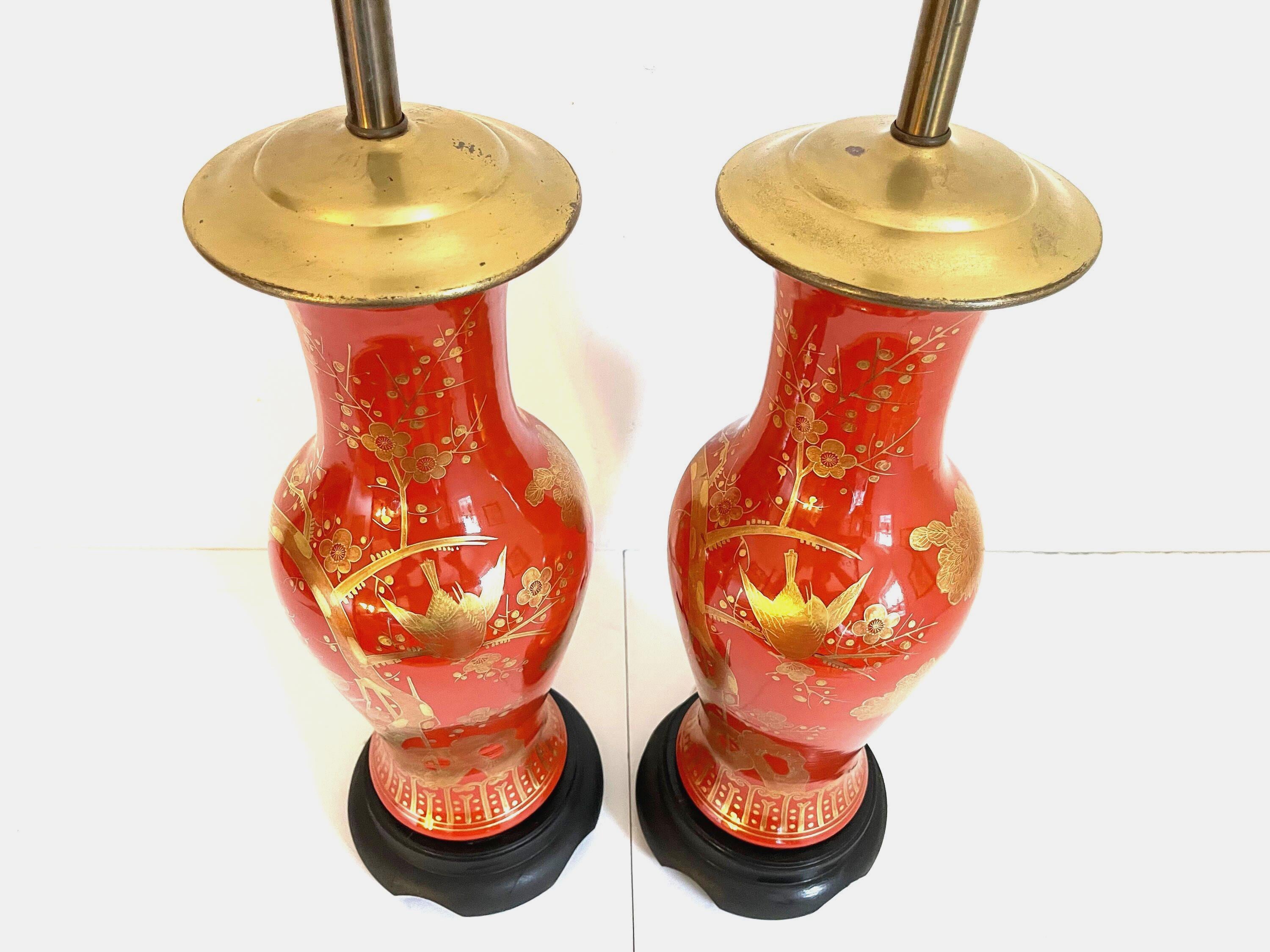 Stunning pair of tall, radiant deep orange porcelain urn lamps hand painted with gold birds in cherry trees, flowering chrysanthemums, and geometric borders on painted black wood notched bases.