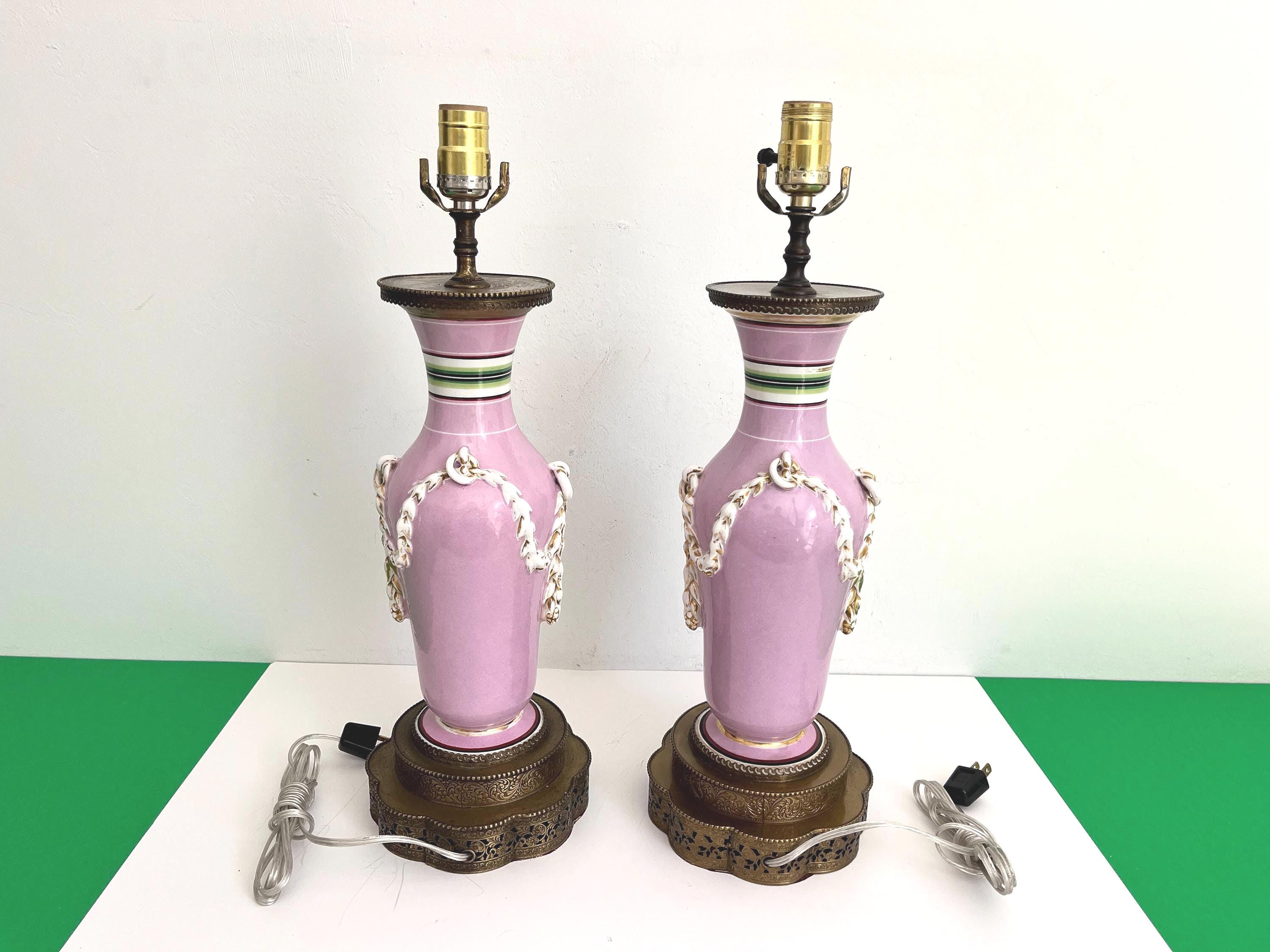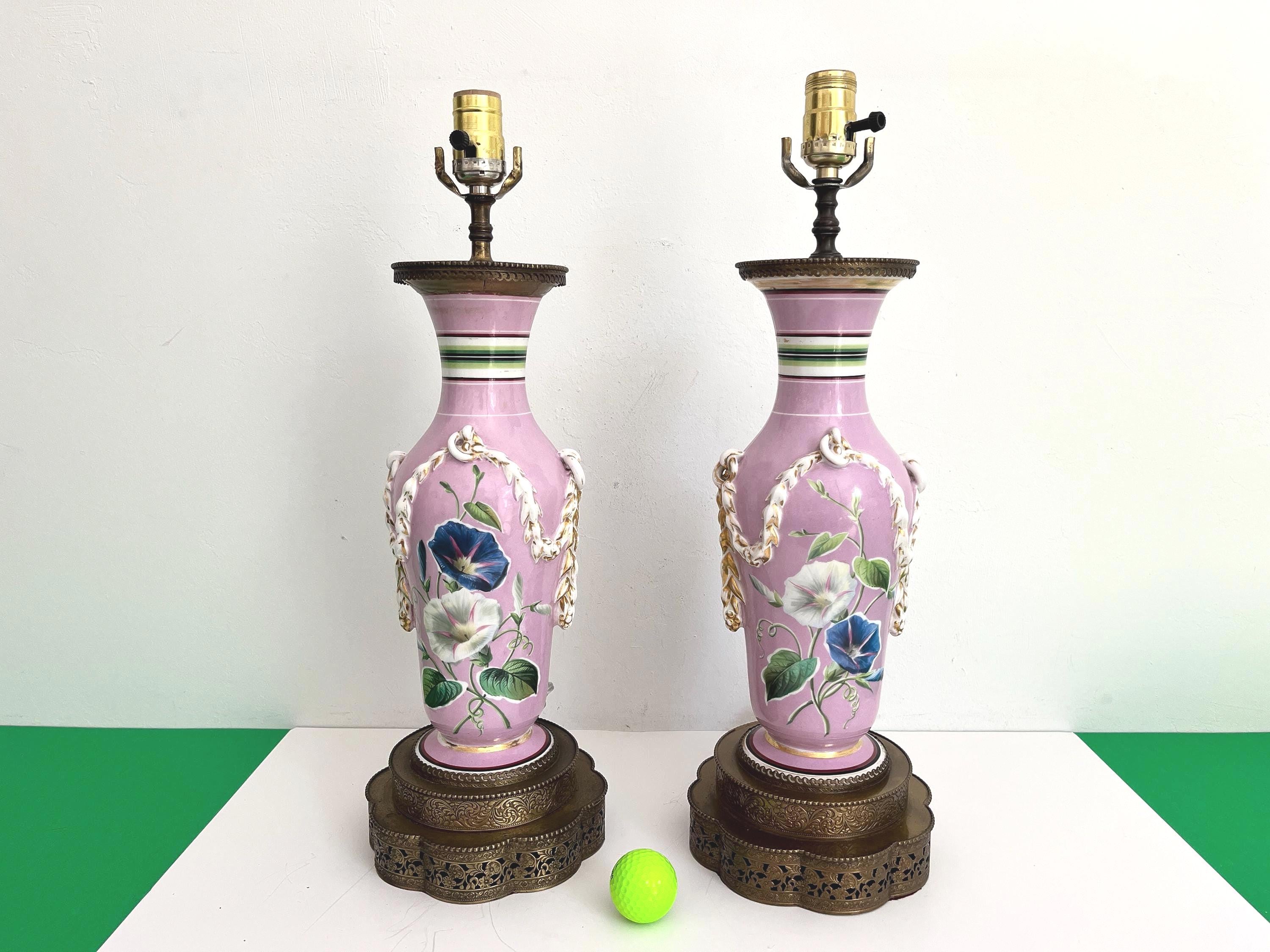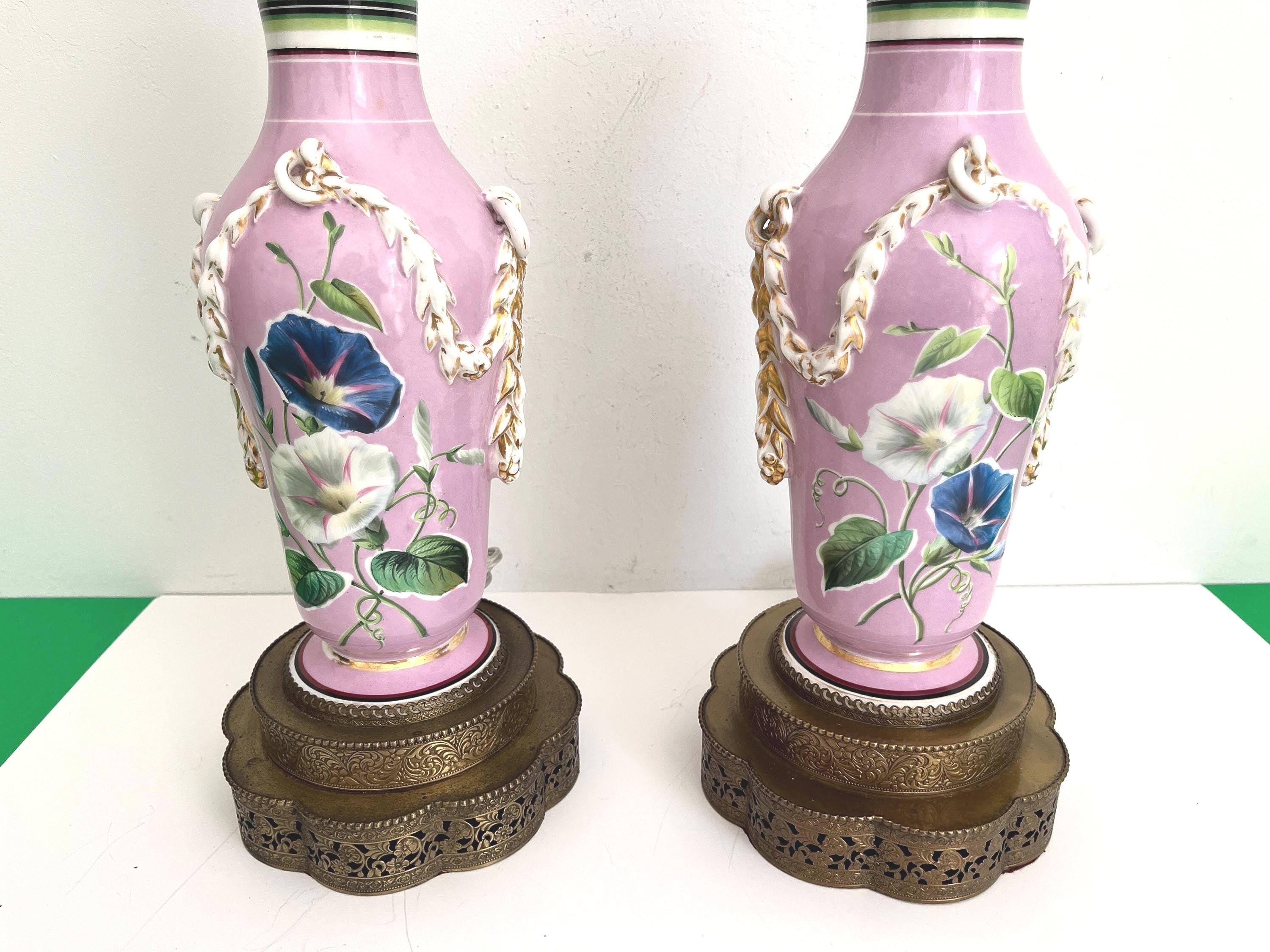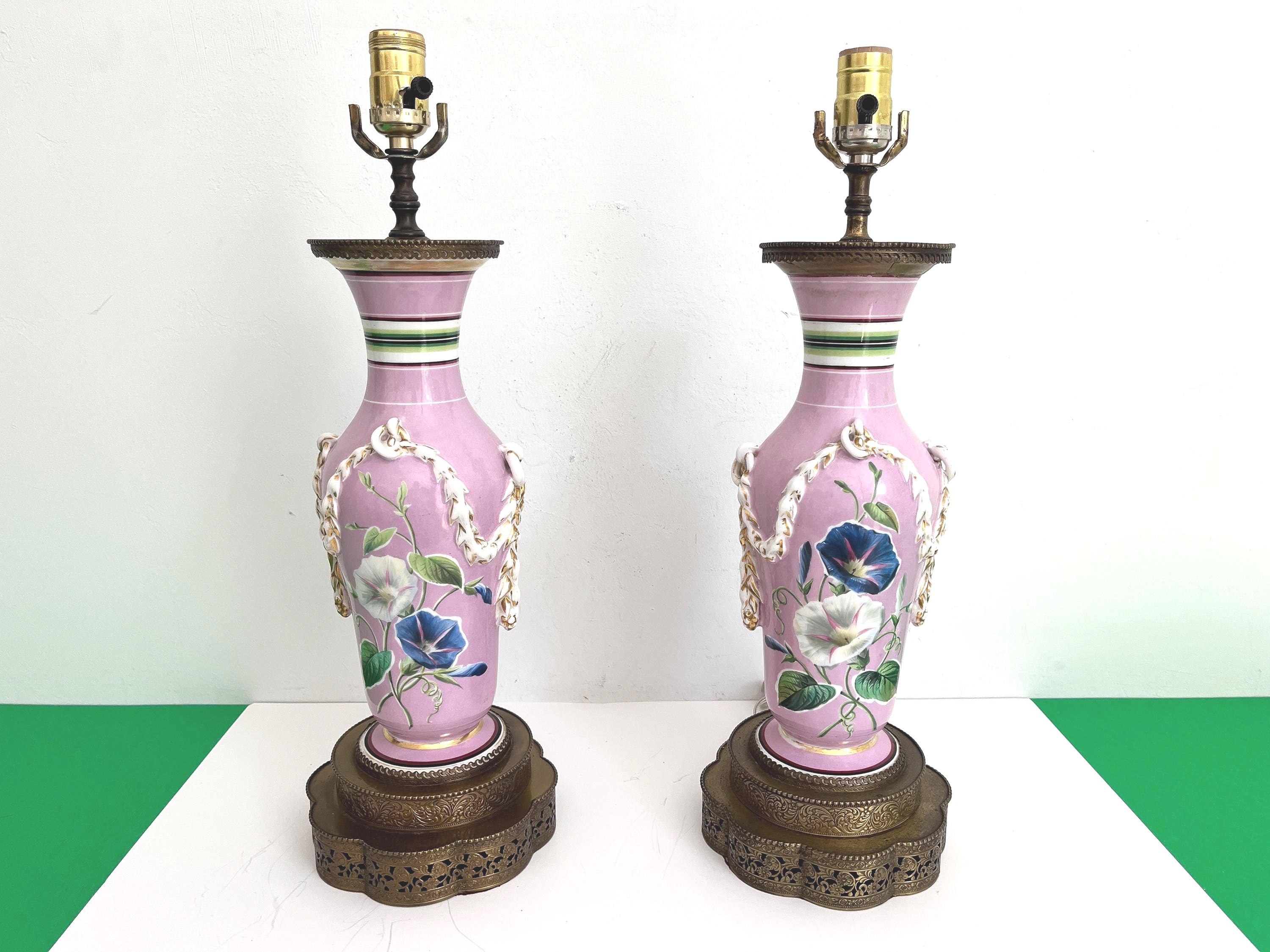 Gorgeous pair of French porcelain raspberry pink urn lamps with colorful morning glories, banded stripes, and gilded dimensional leafy garlands looped through side rings on tiered and scalloped gold metal bases.