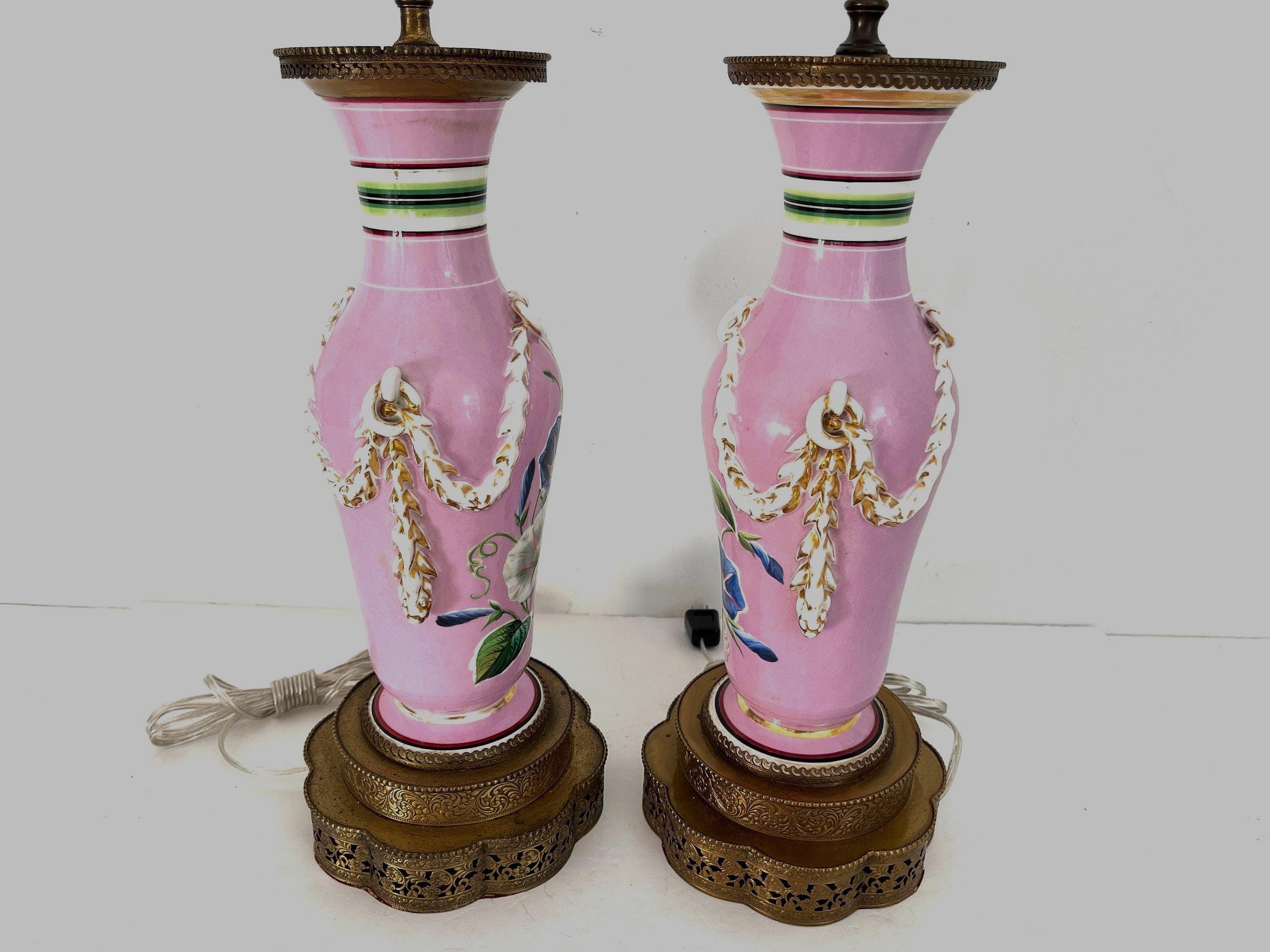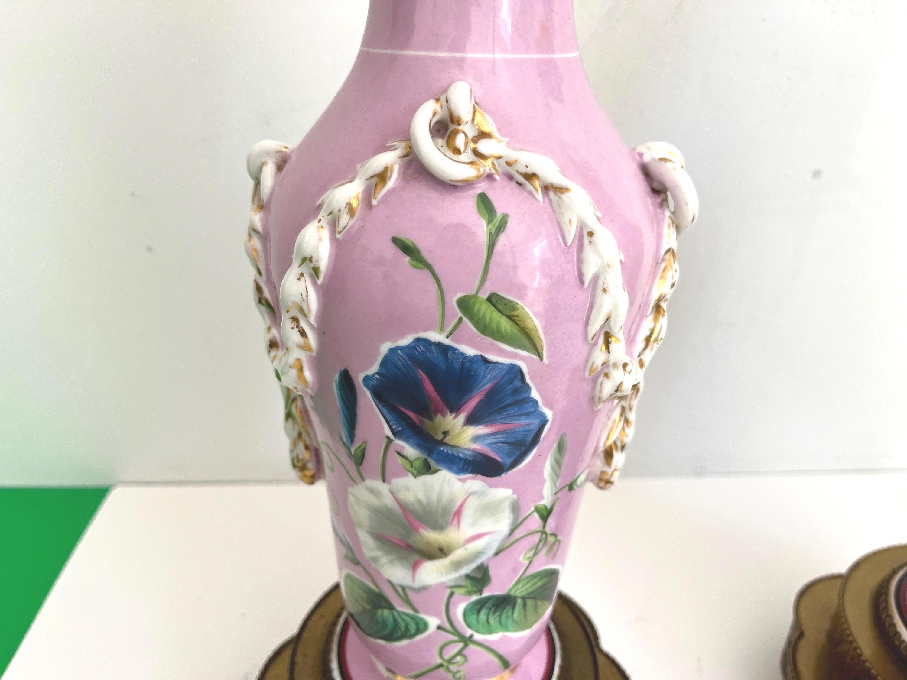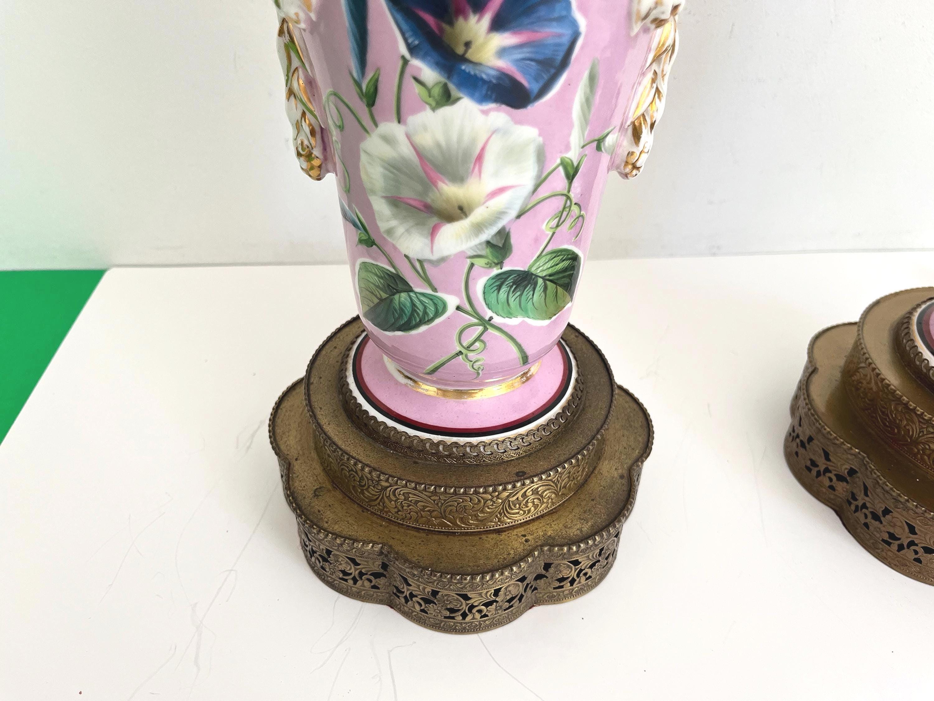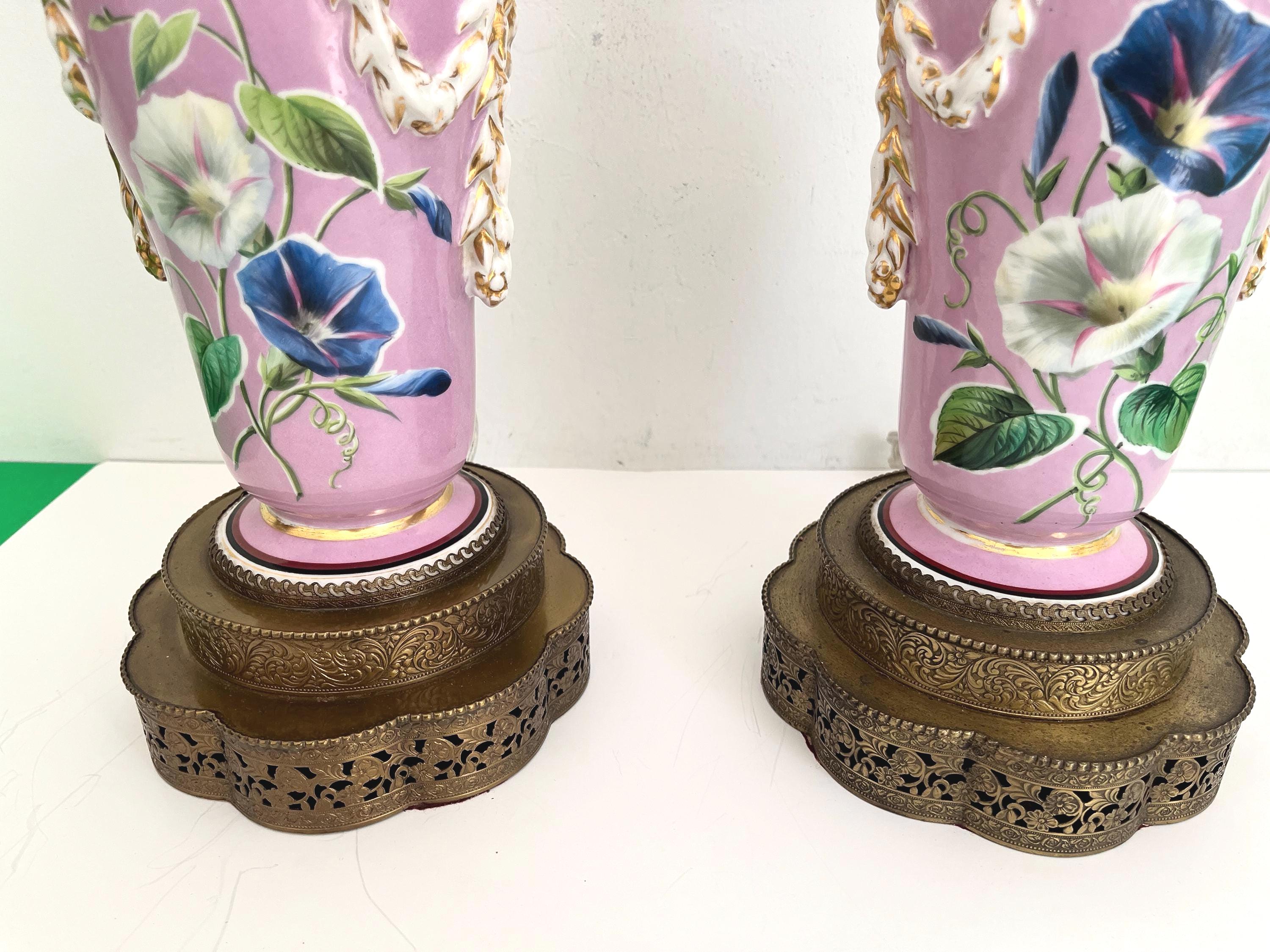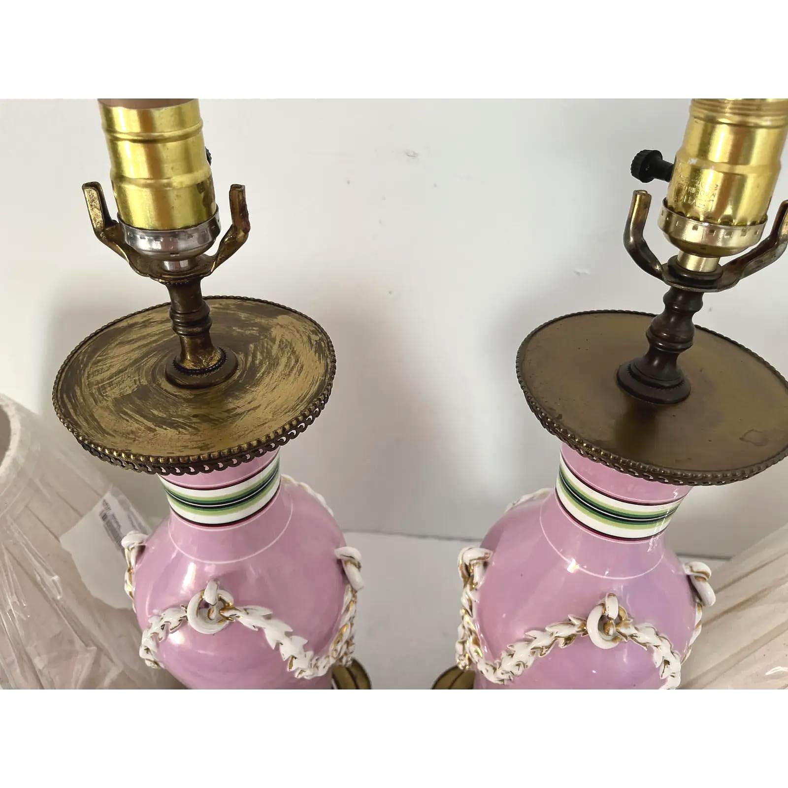 Gorgeous pair of French porcelain raspberry pink urn lamps with colorful morning glories, banded stripes, and gilded dimensional leafy garlands looped through side rings on tiered and scalloped gold metal bases.