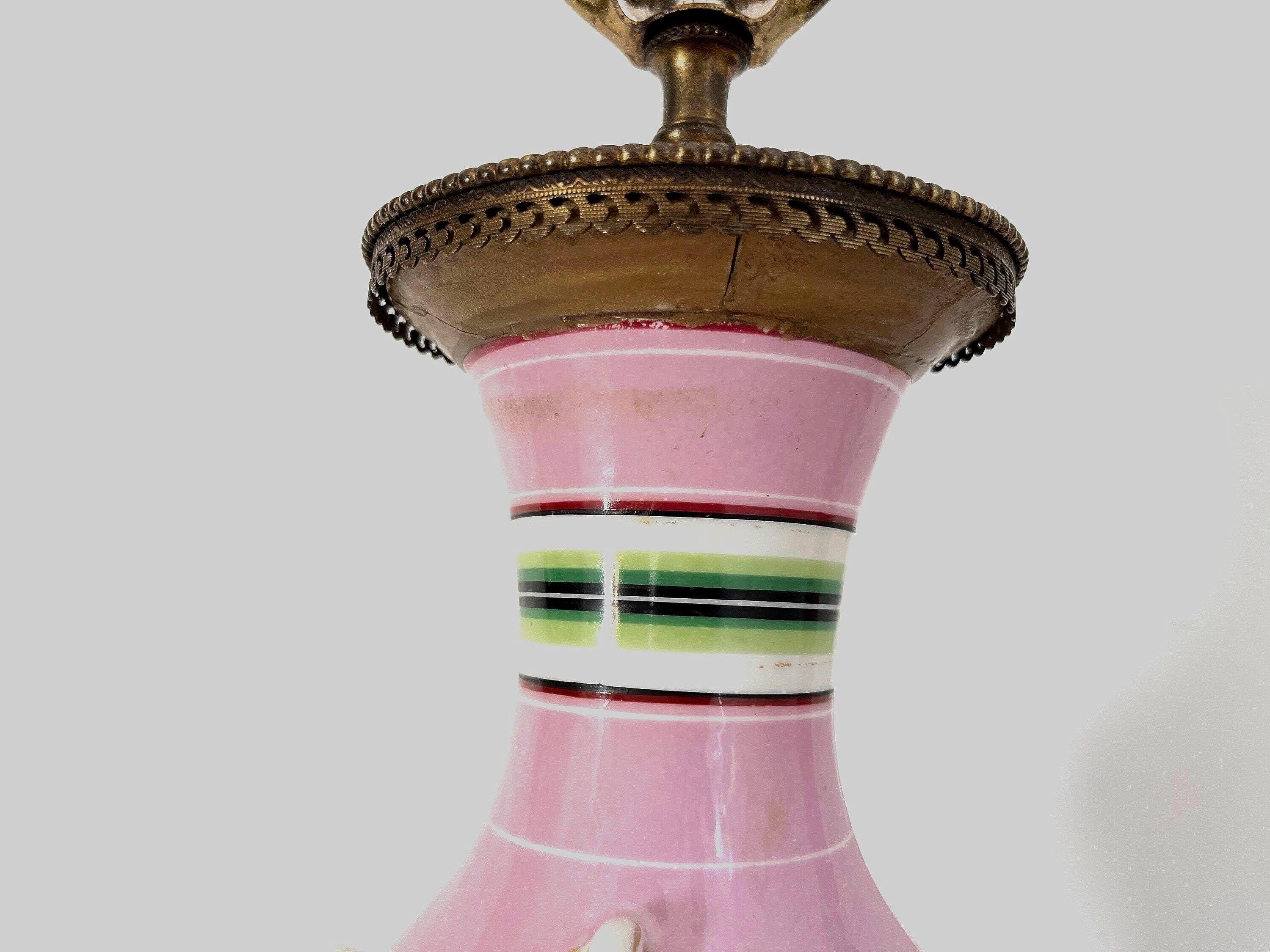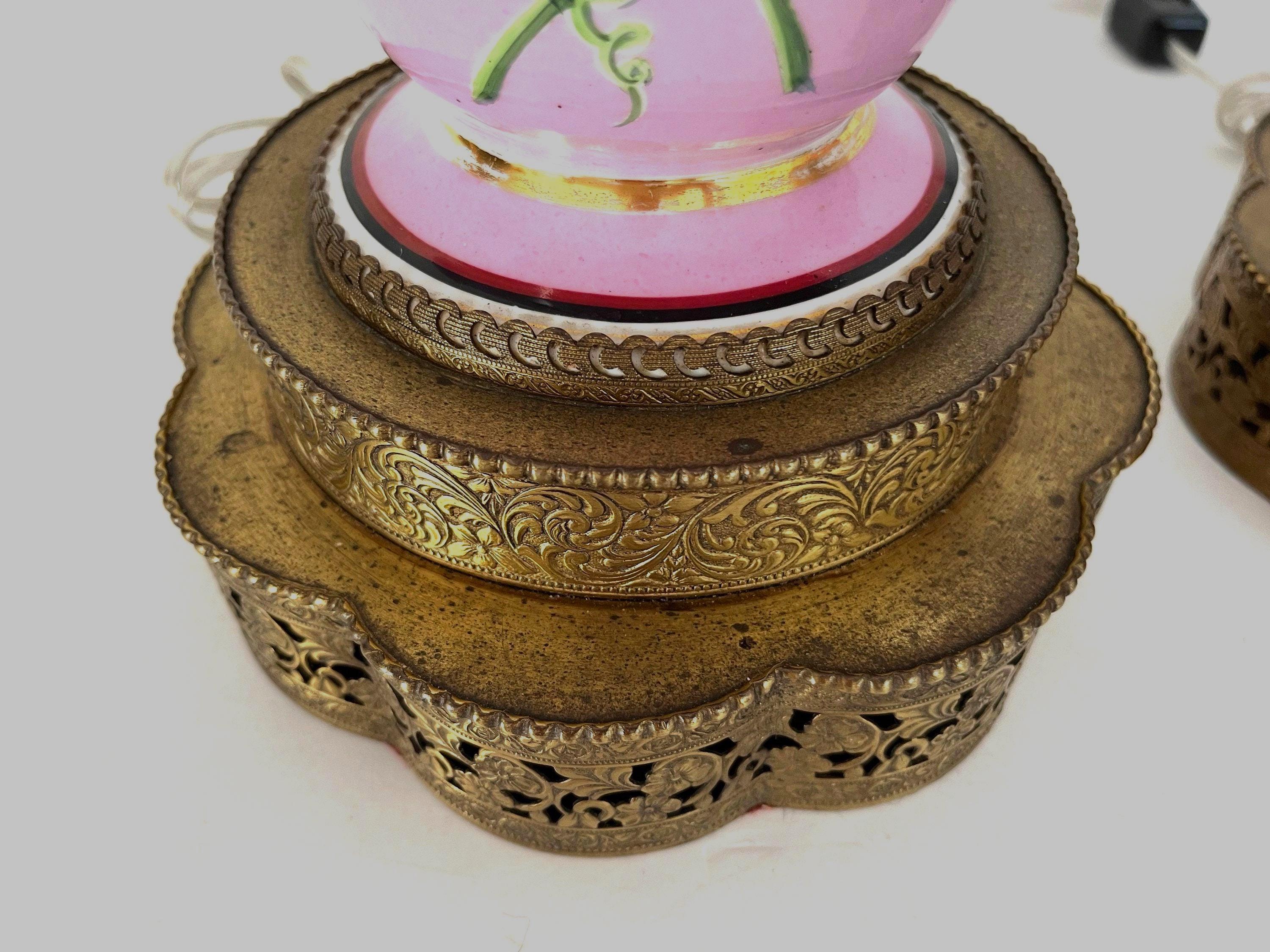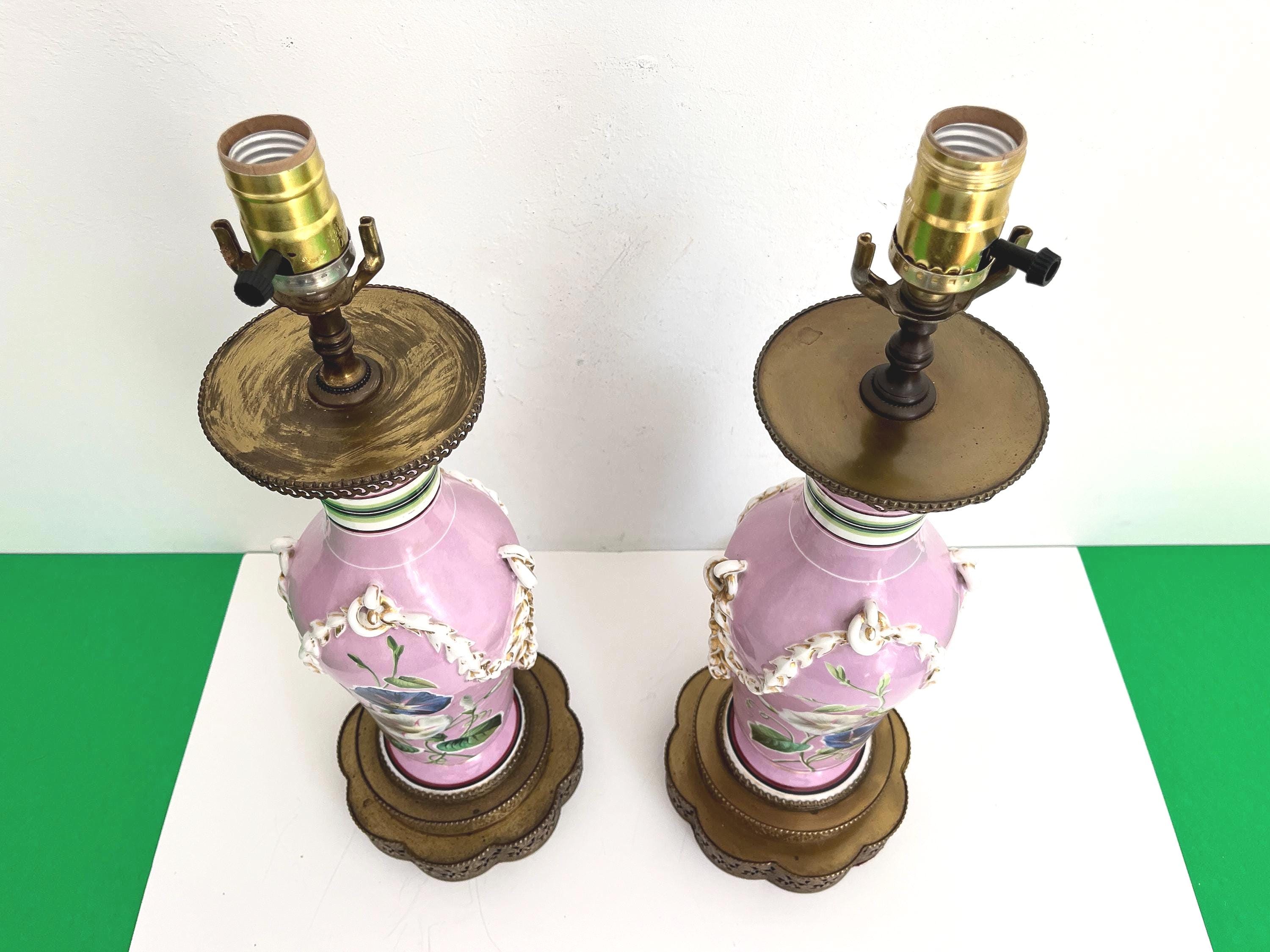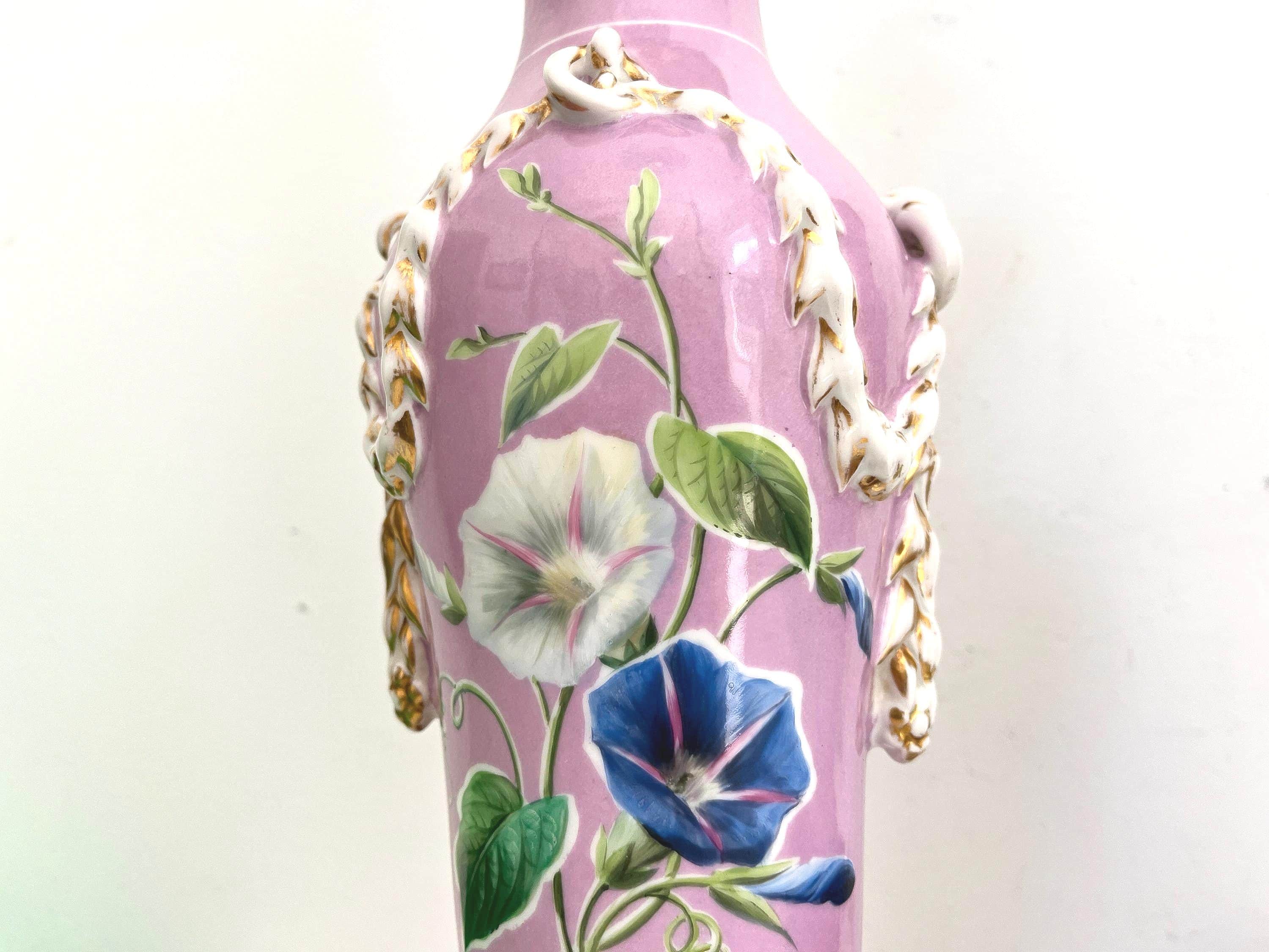 Gorgeous pair of French porcelain raspberry pink urn lamps with colorful morning glories, banded stripes, and gilded dimensional leafy garlands looped through side rings on tiered and scalloped gold metal bases.