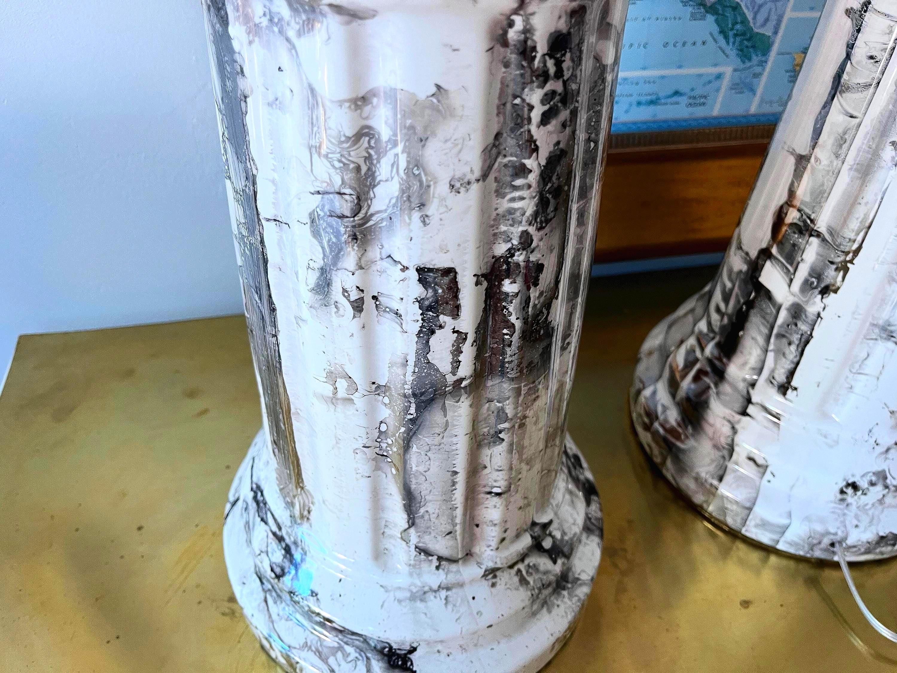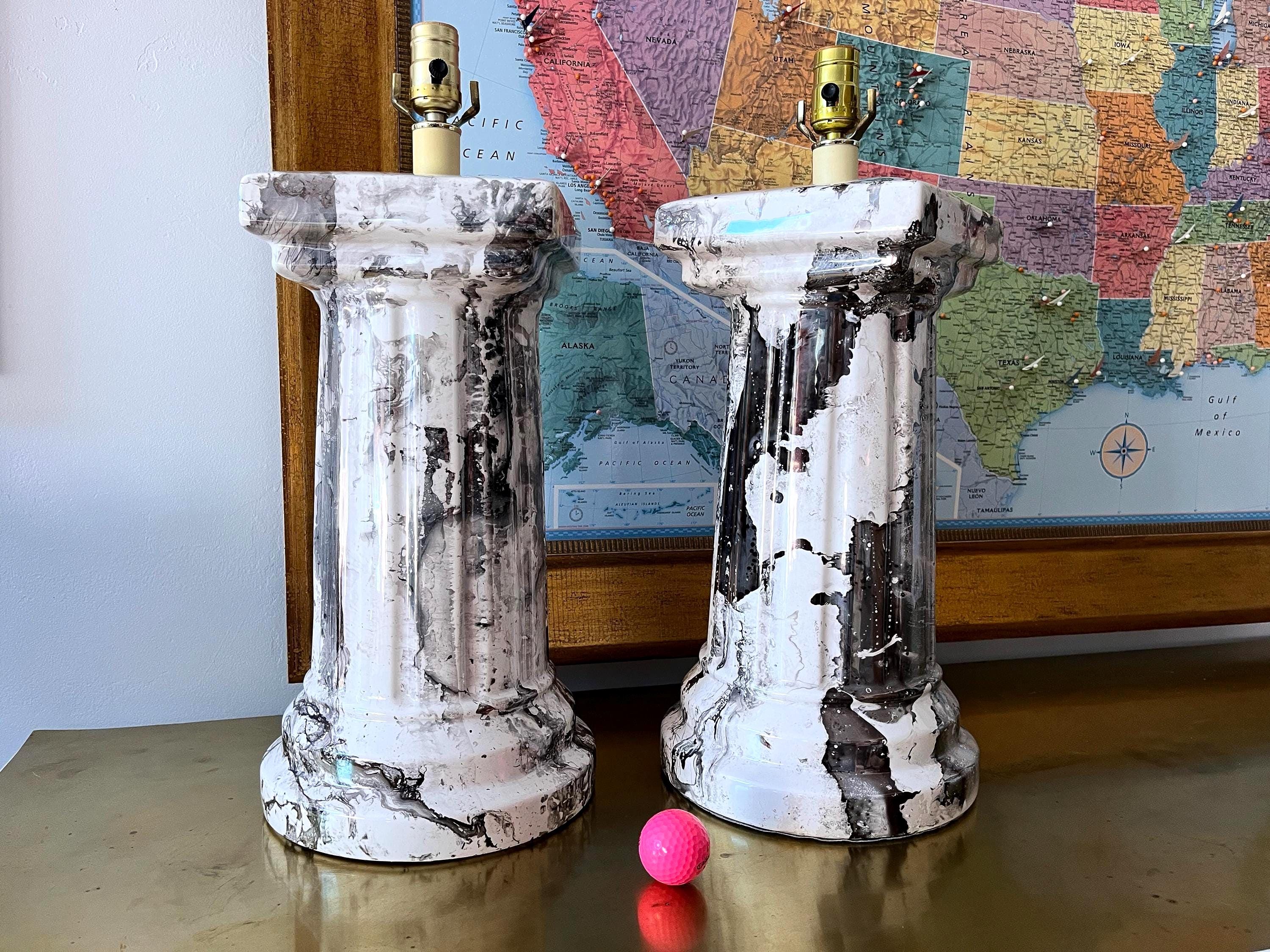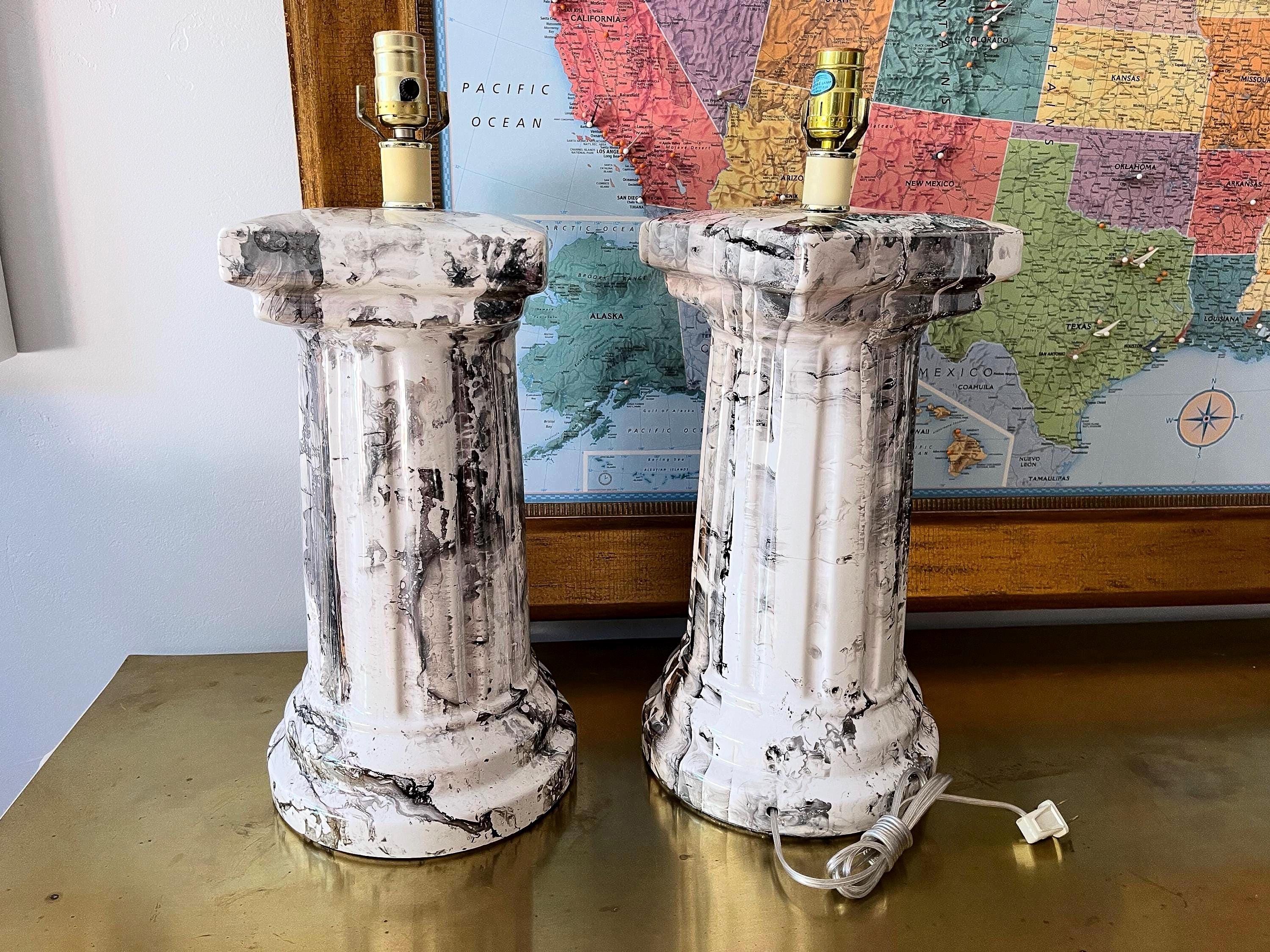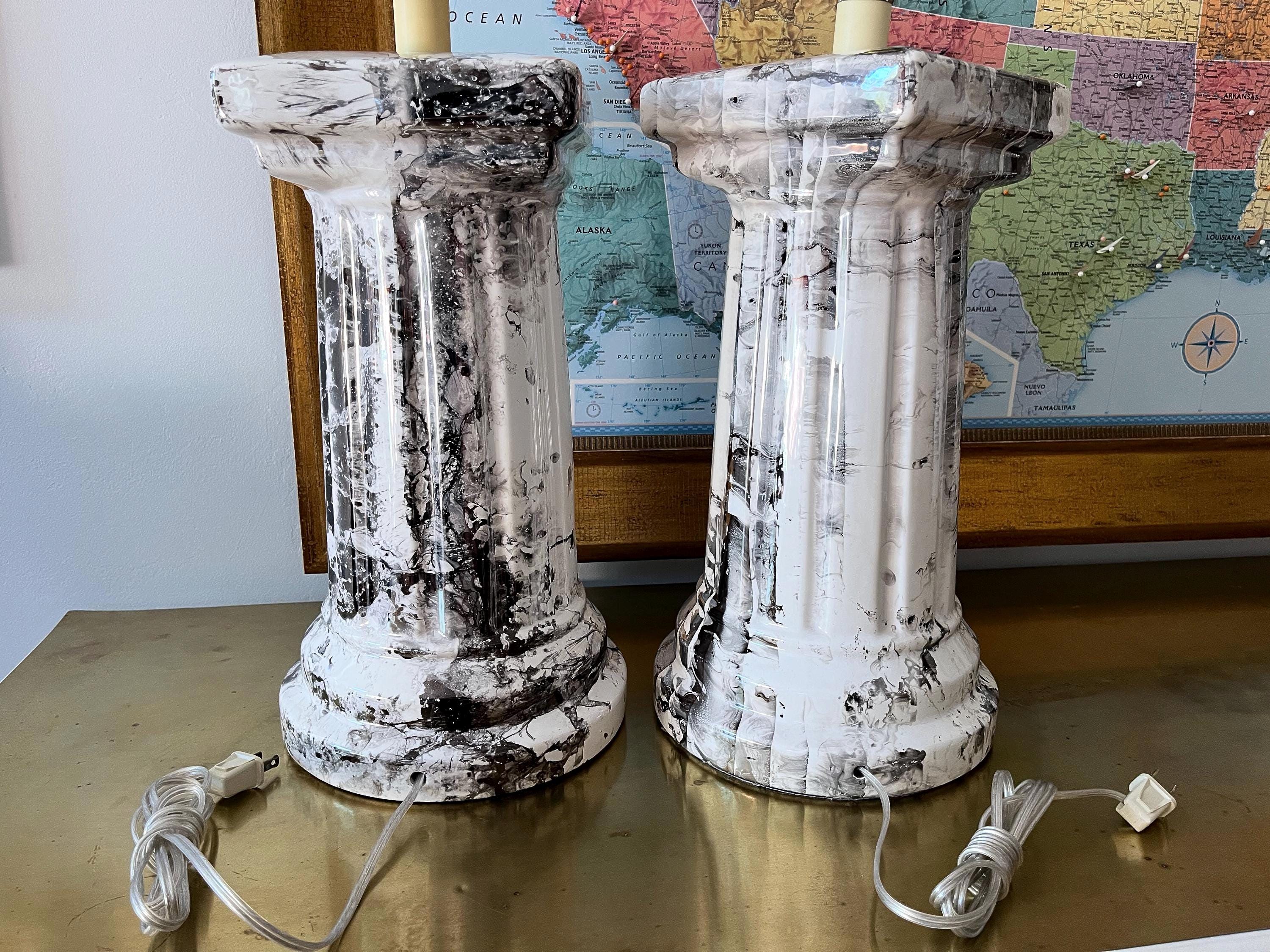 Big, beautiful pair of glazed and marbled porcelain Doric column lamps in rich shades of black and white with realistic veining.
