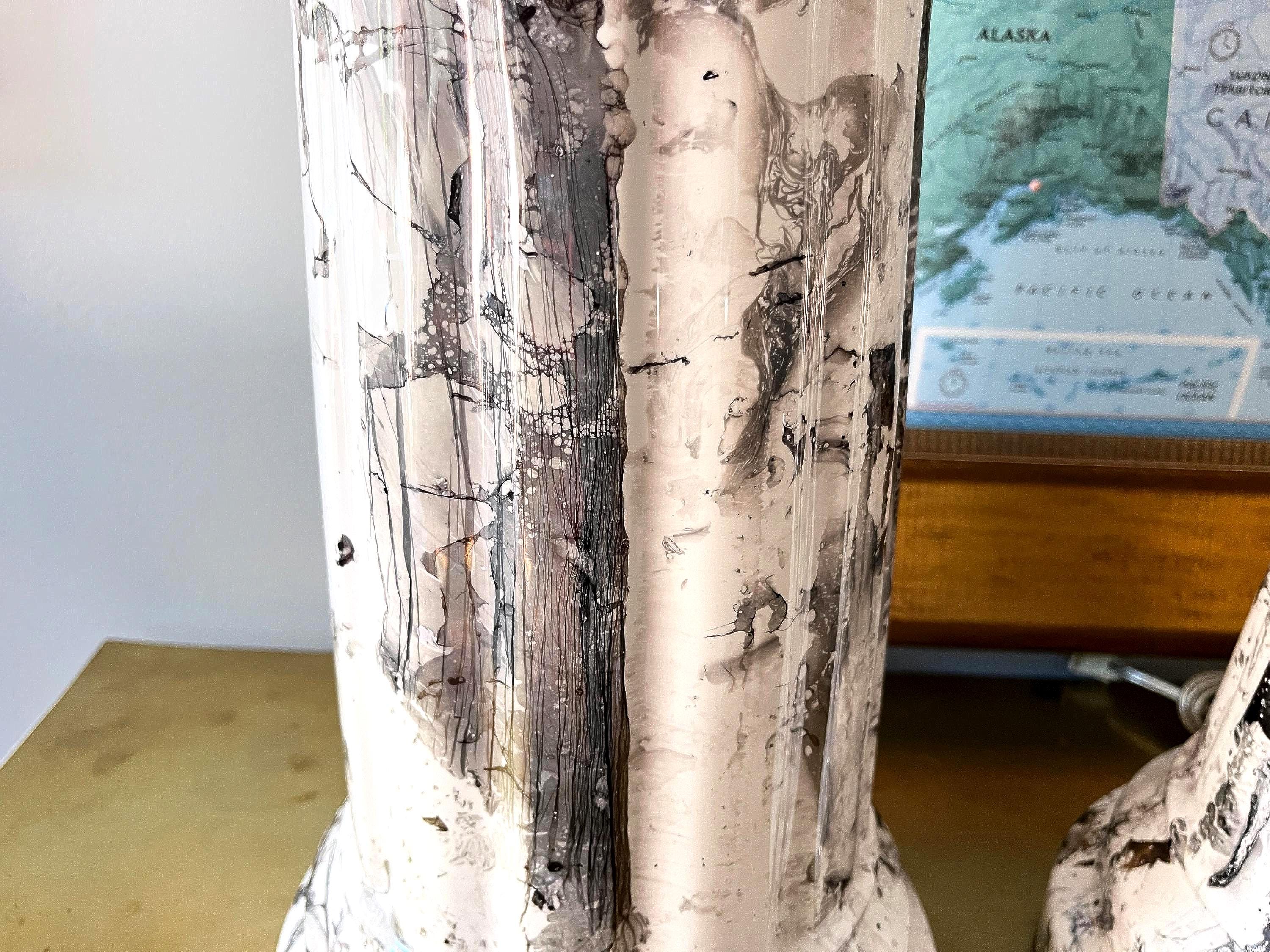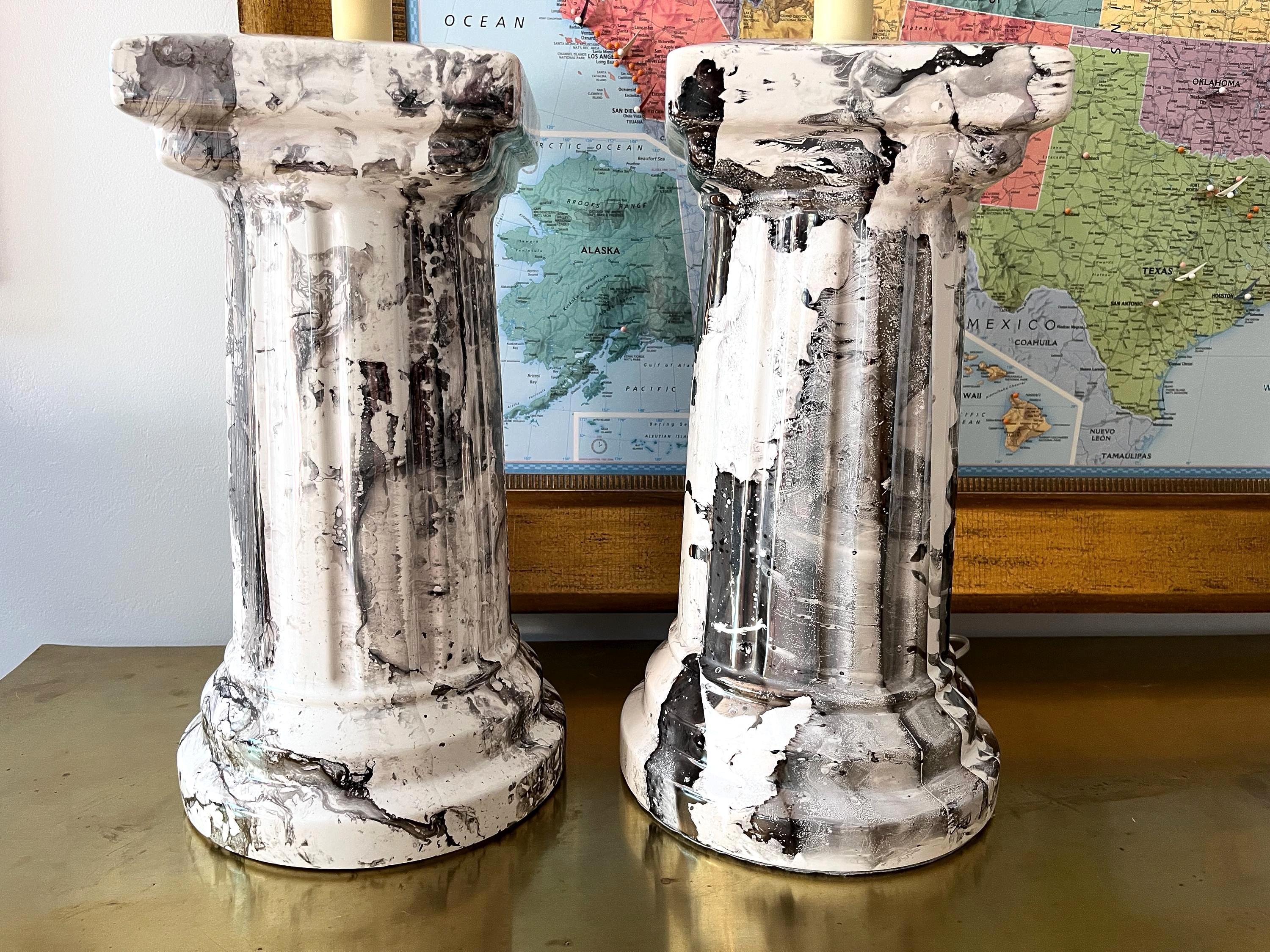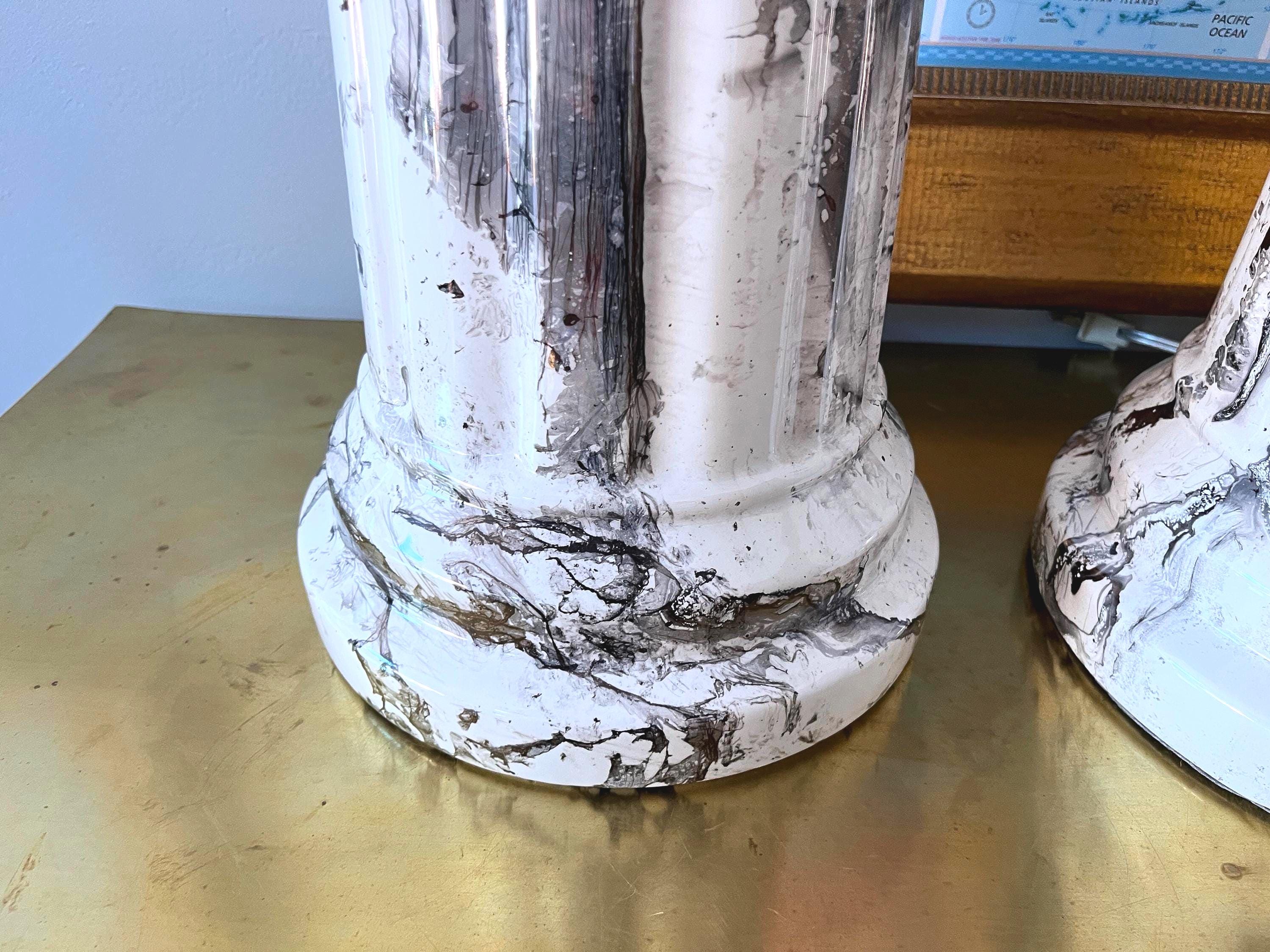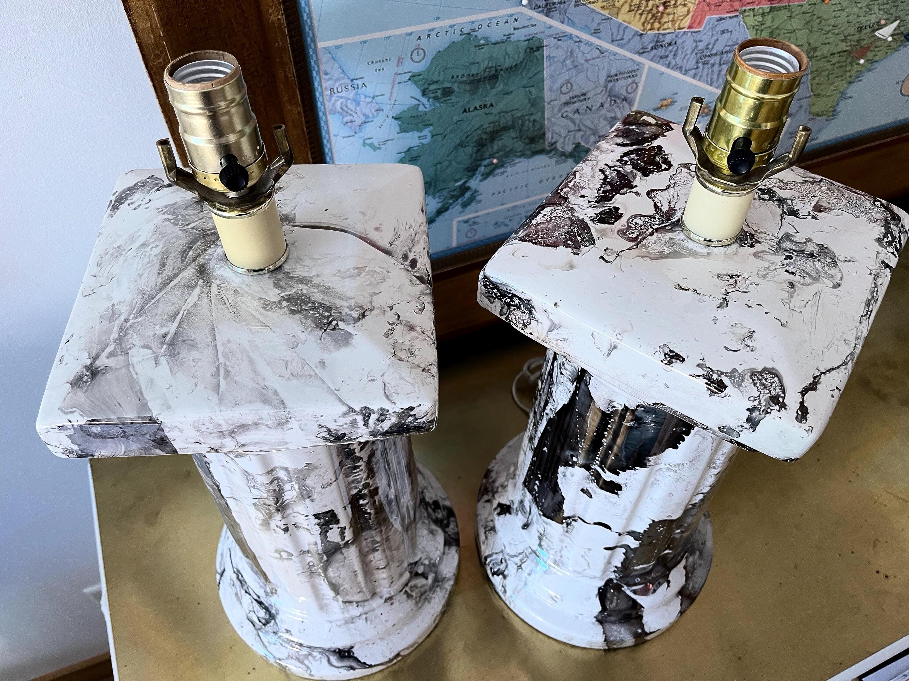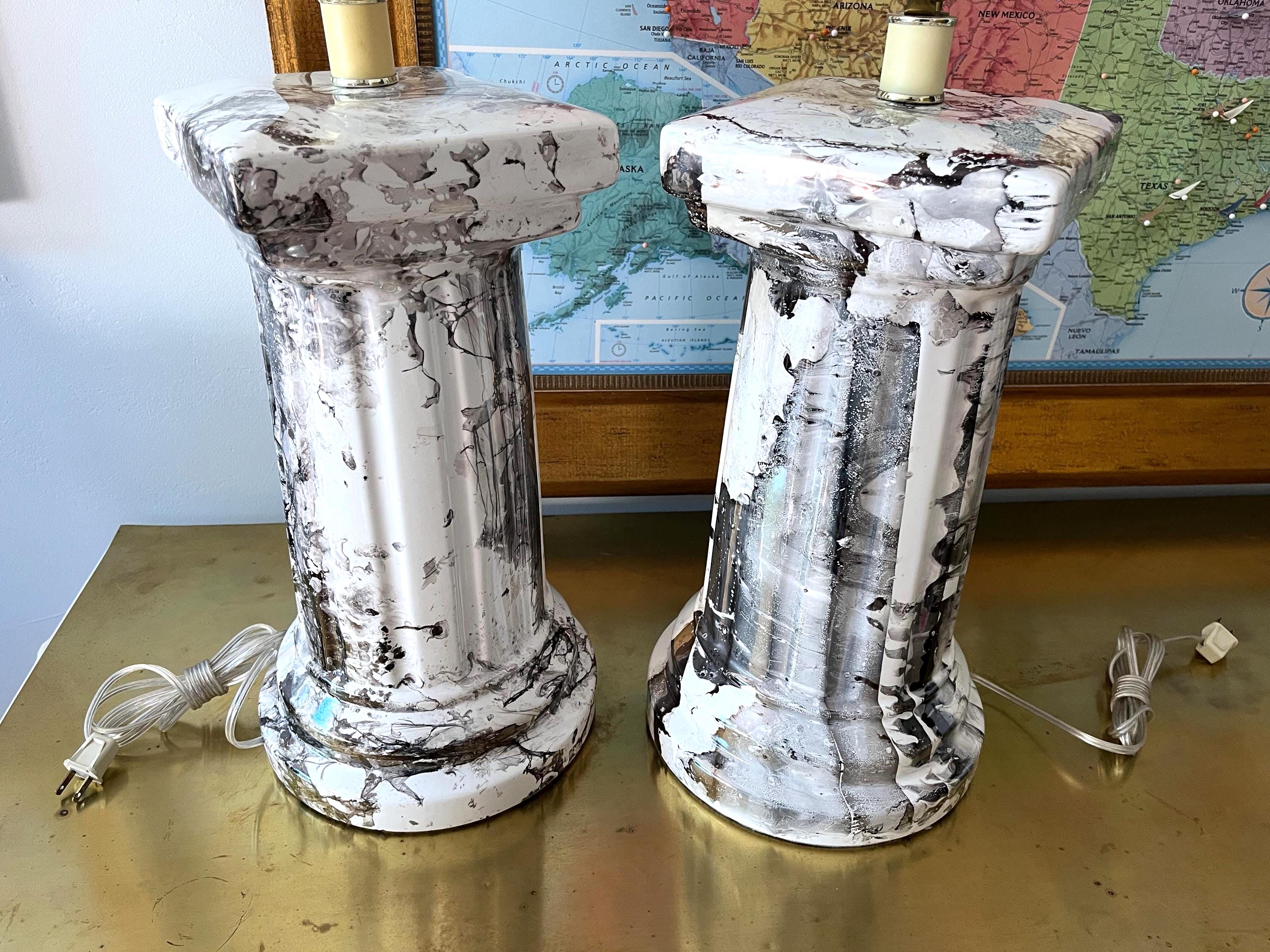 Big, beautiful pair of glazed and marbled porcelain Doric column lamps in rich shades of black and white with realistic veining.