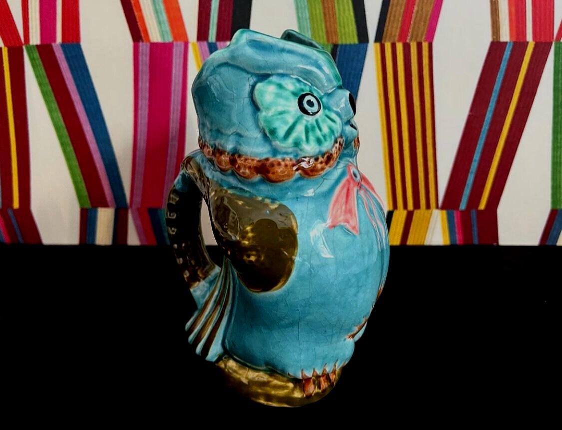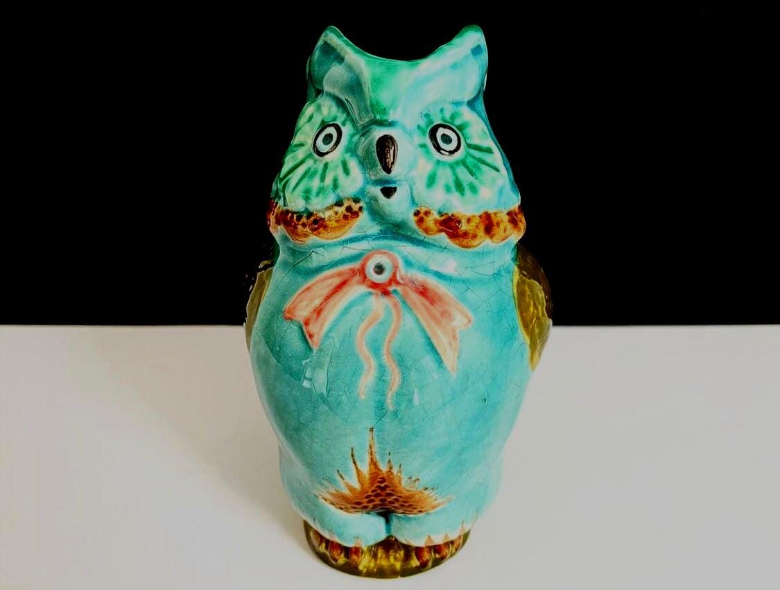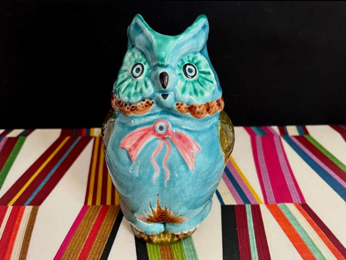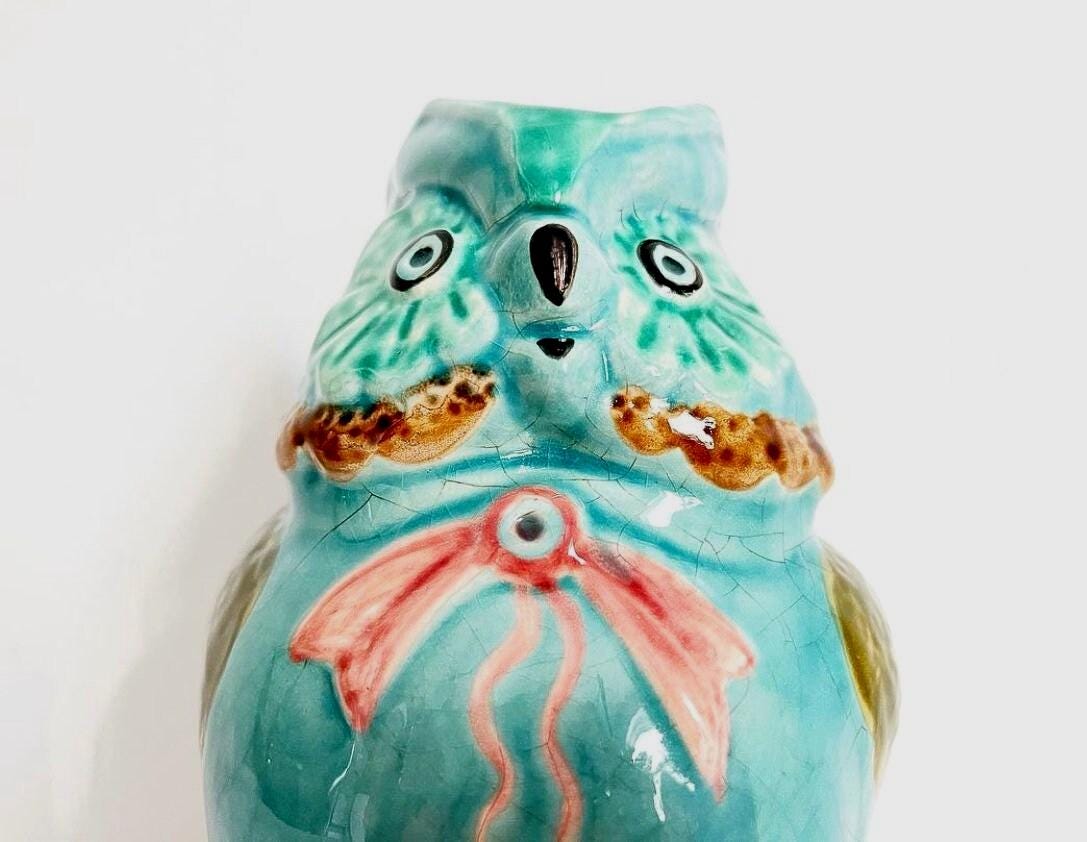 Fabulous French mid century majolica owl pitcher in colorful shades of turquoise blue, olive green, rich brown, and a pink bow. Purchased in Paris and marked "FSG" with impressed mold number 6350.