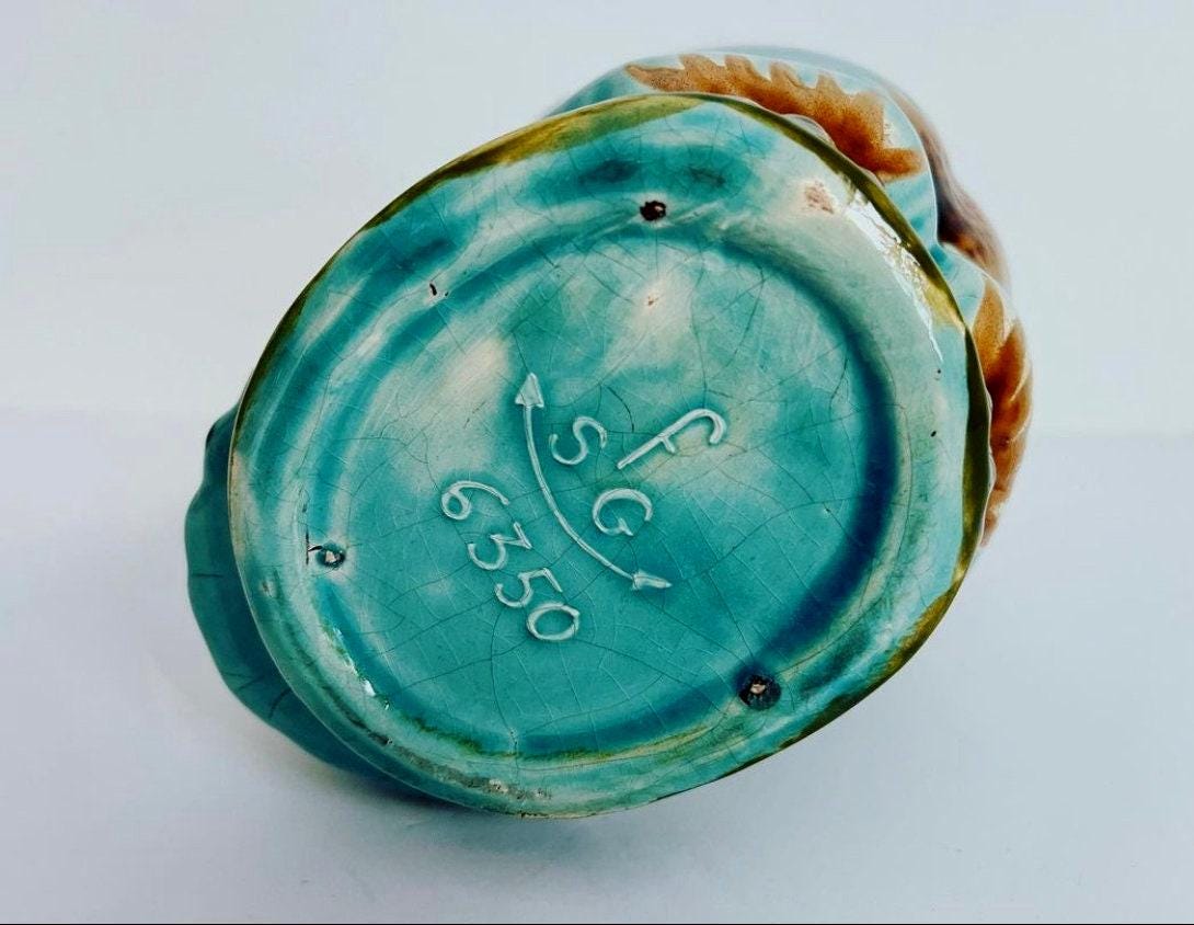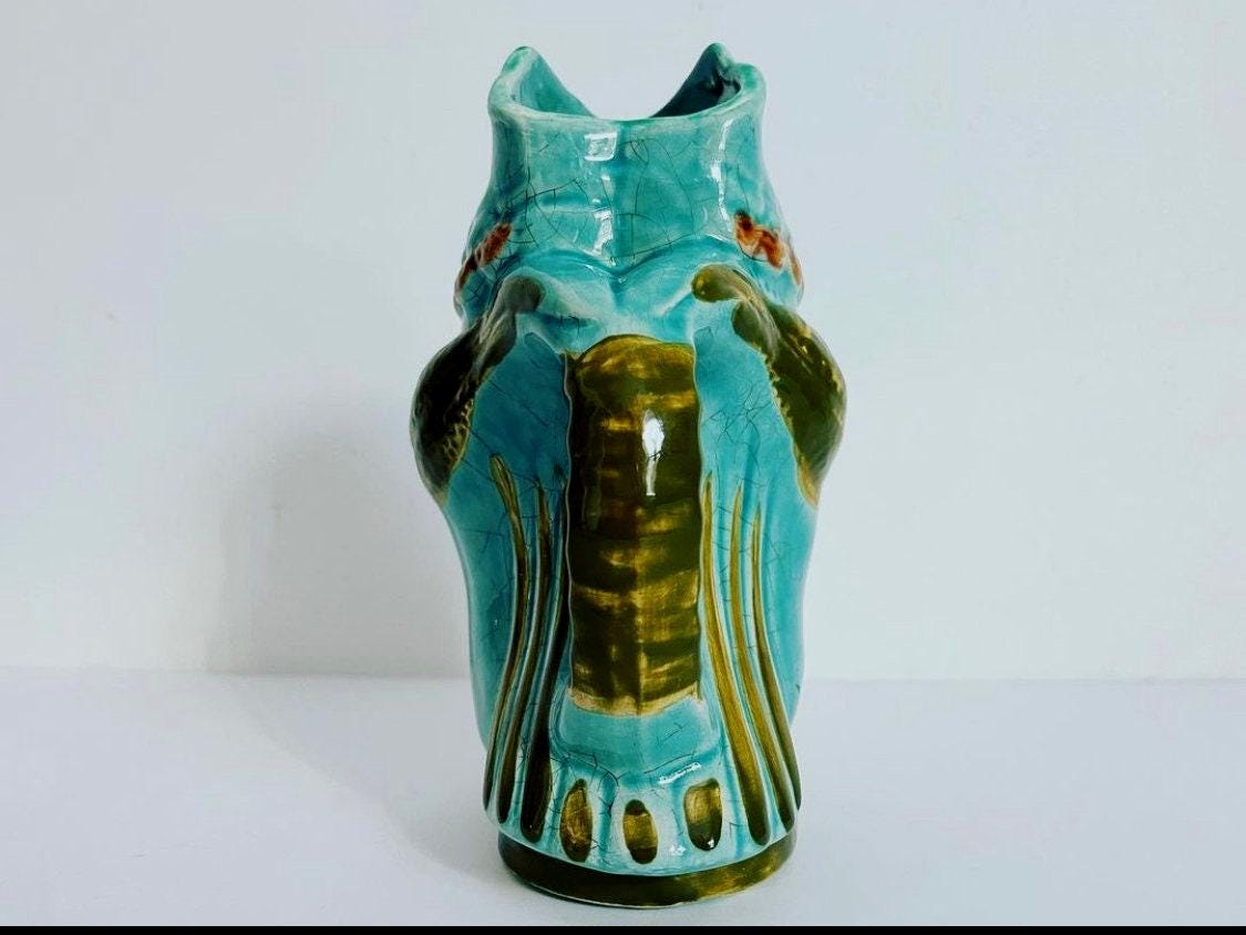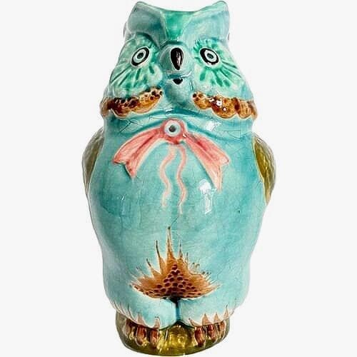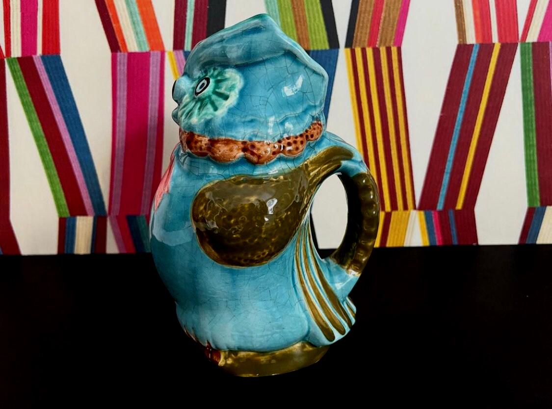 Fabulous French mid century majolica owl pitcher in colorful shades of turquoise blue, olive green, rich brown, and a pink bow. Purchased in Paris and marked "FSG" with impressed mold number 6350.