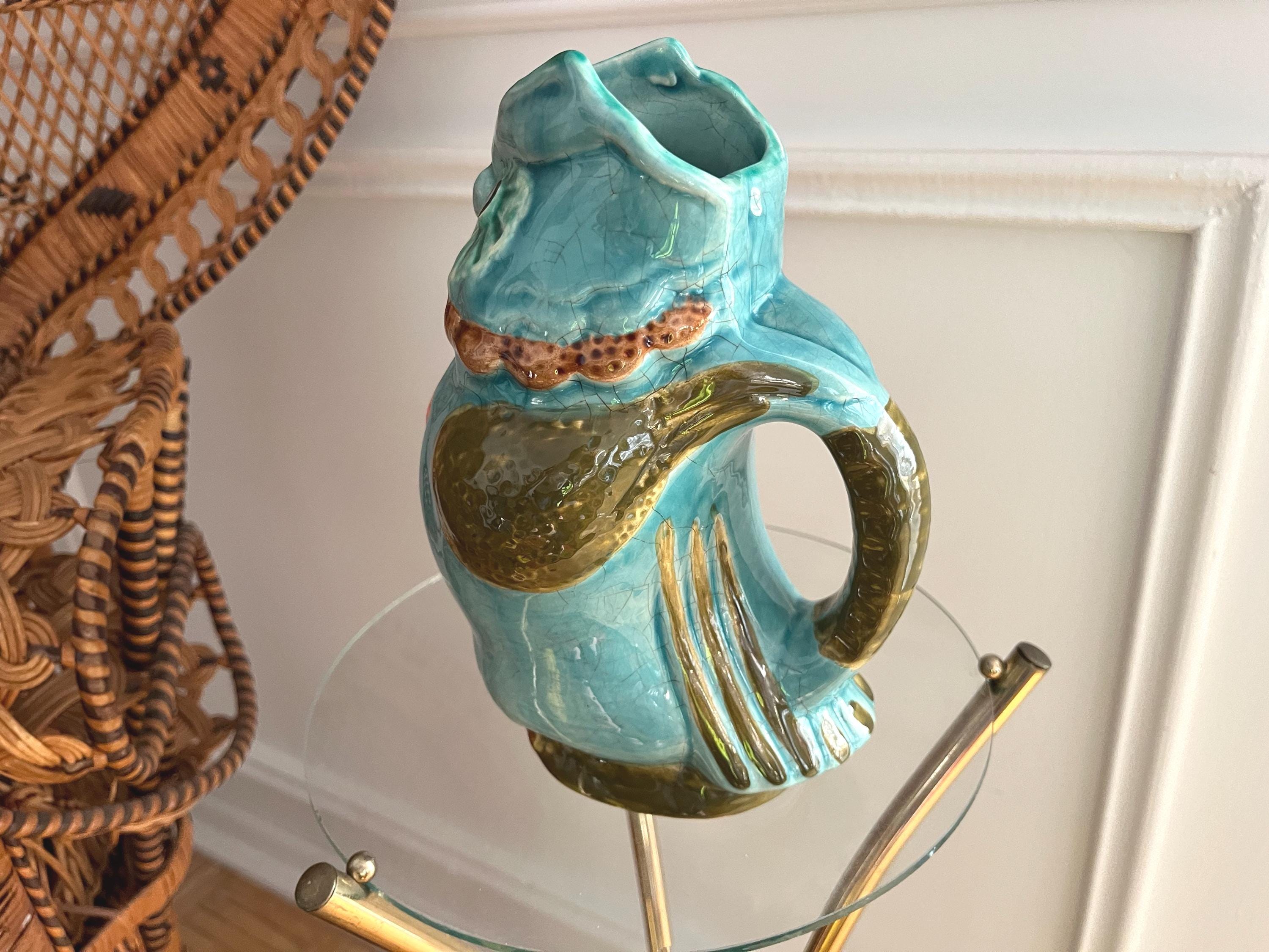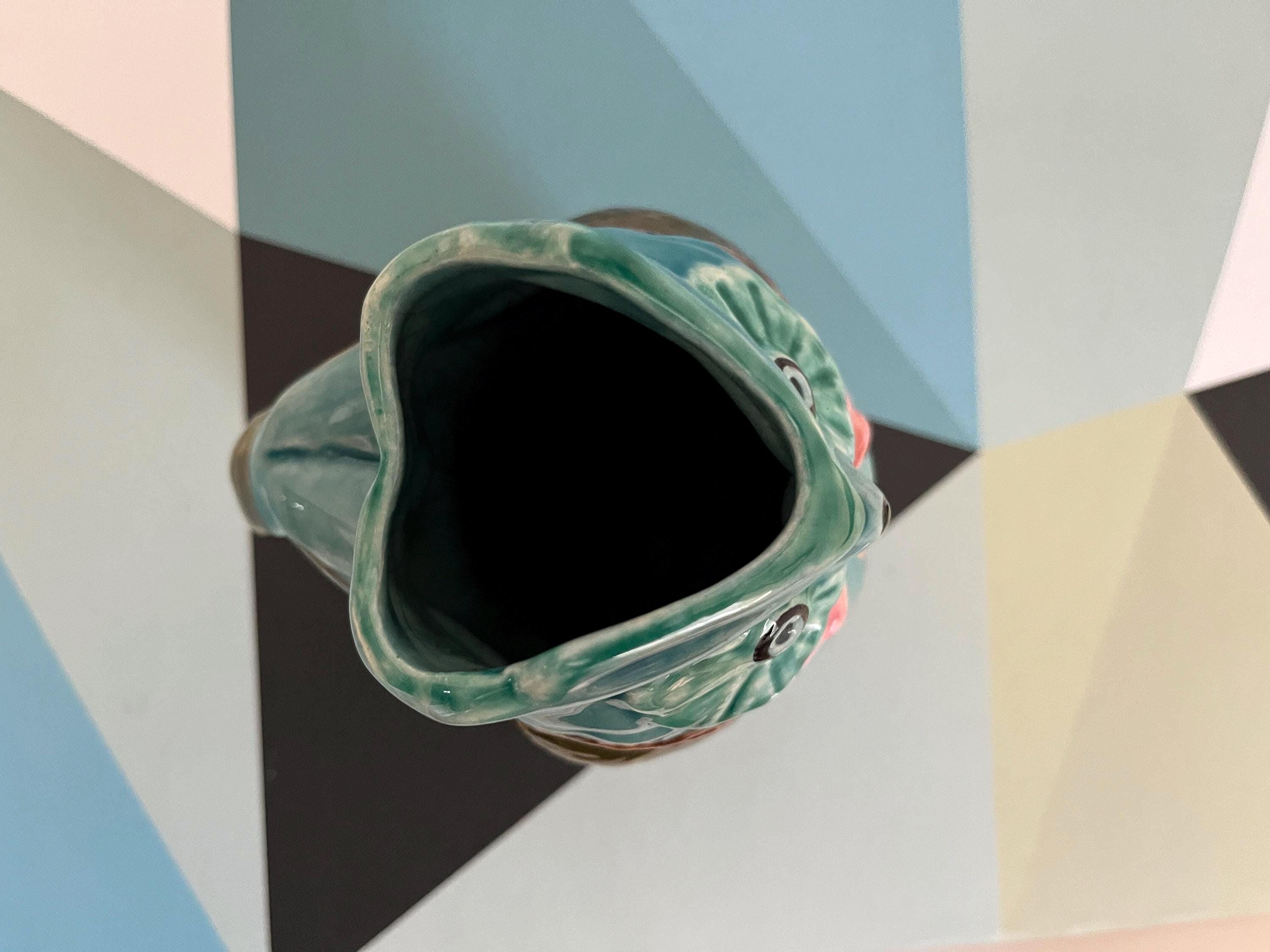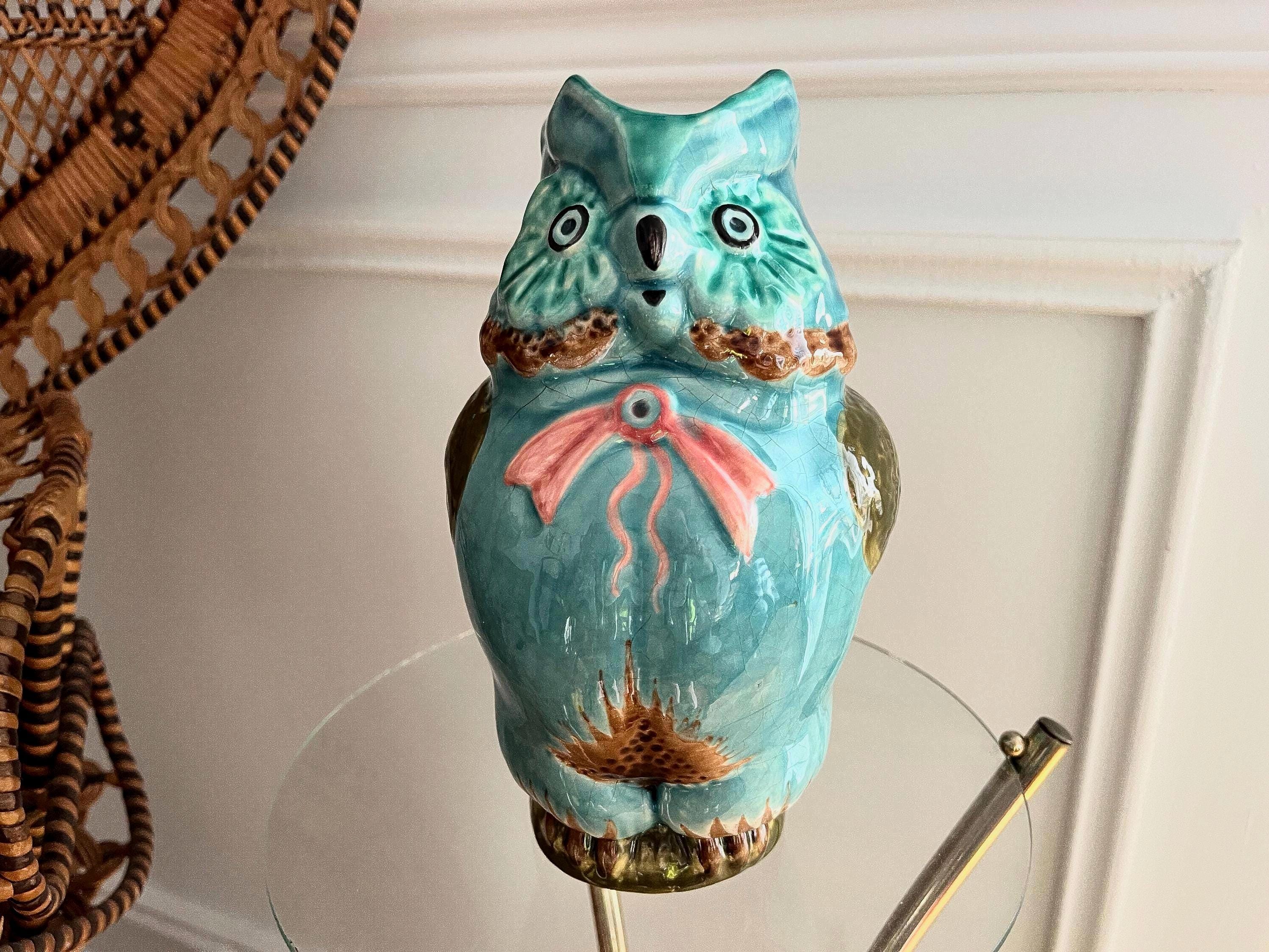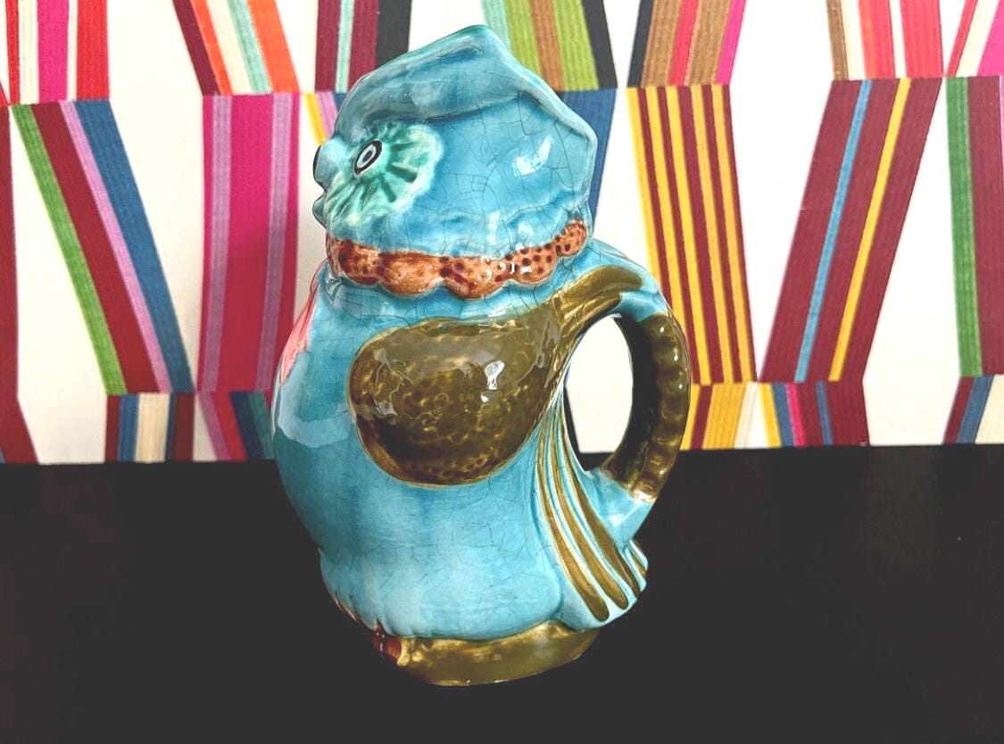 Fabulous French majolica owl pitcher in saturated shades of turquoise blue, olive green, rich brown, and pink. Purchased in Paris; marked "FSG" with mold number 6350.