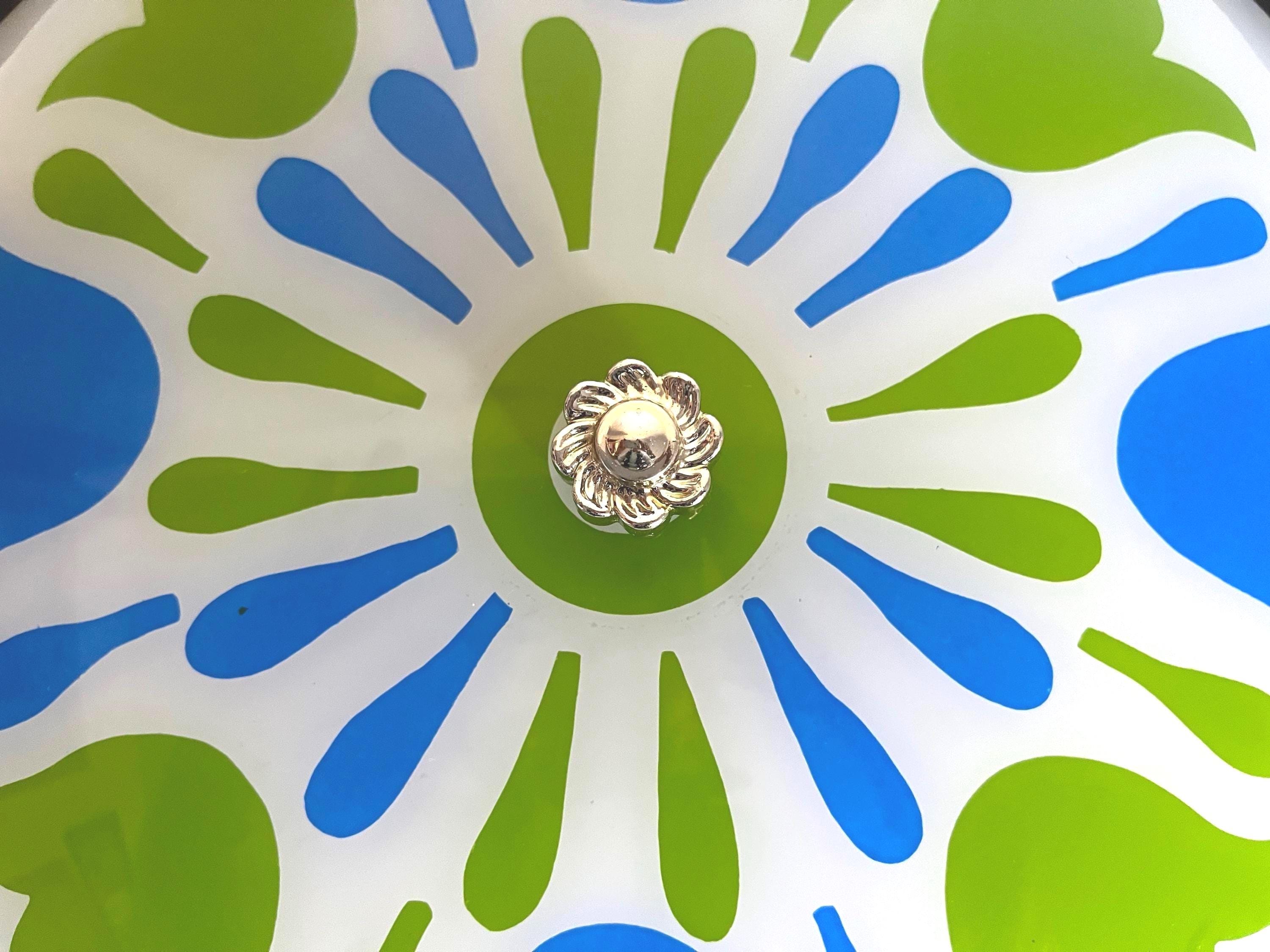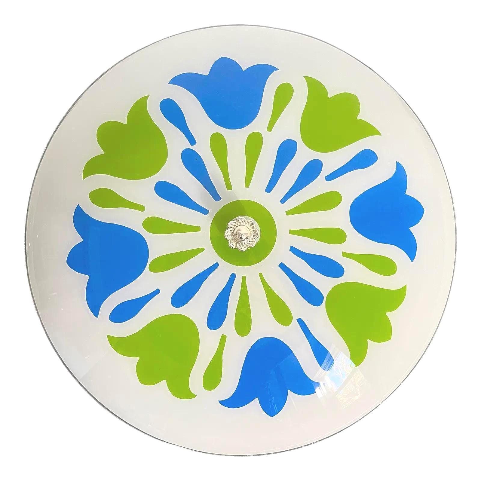 Gorgeous, glossy frosted glass floral flush mount in the graphic style of Marimekko with colorful border of green and blue tulip blossoms, central leafy medallion and two lights.