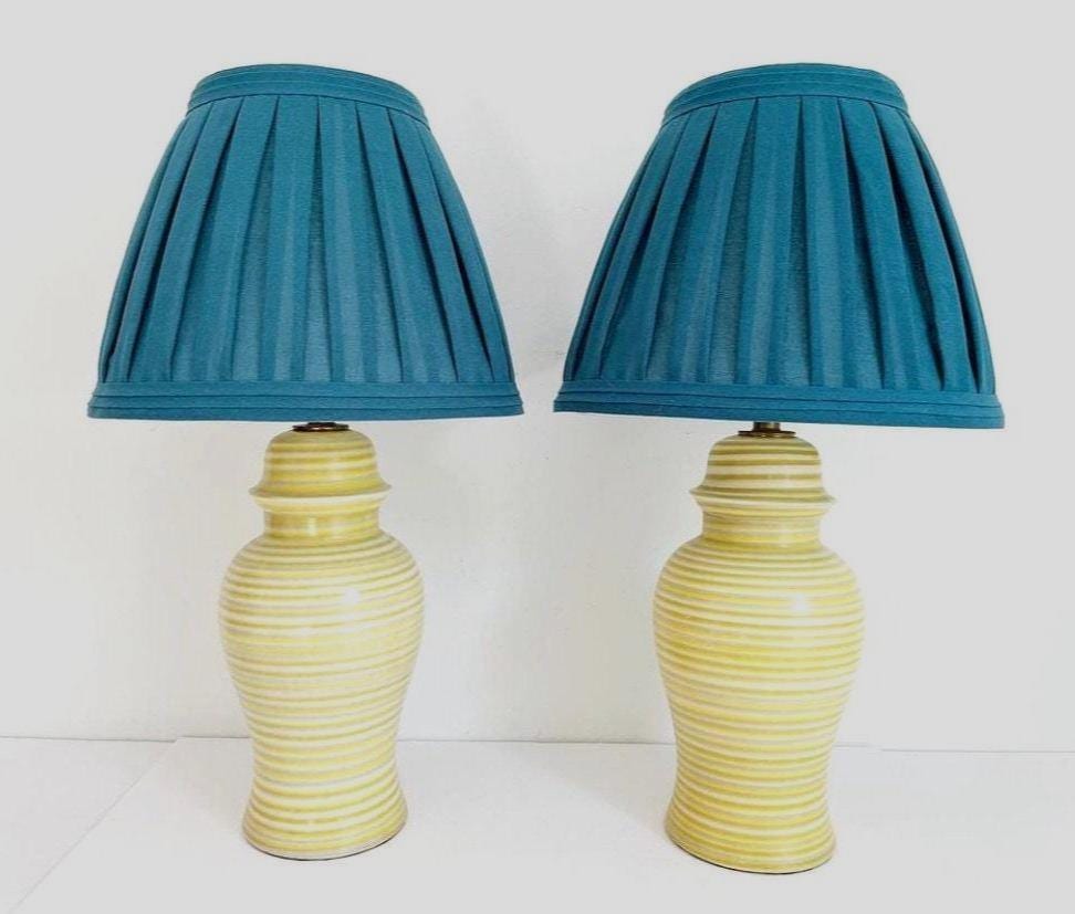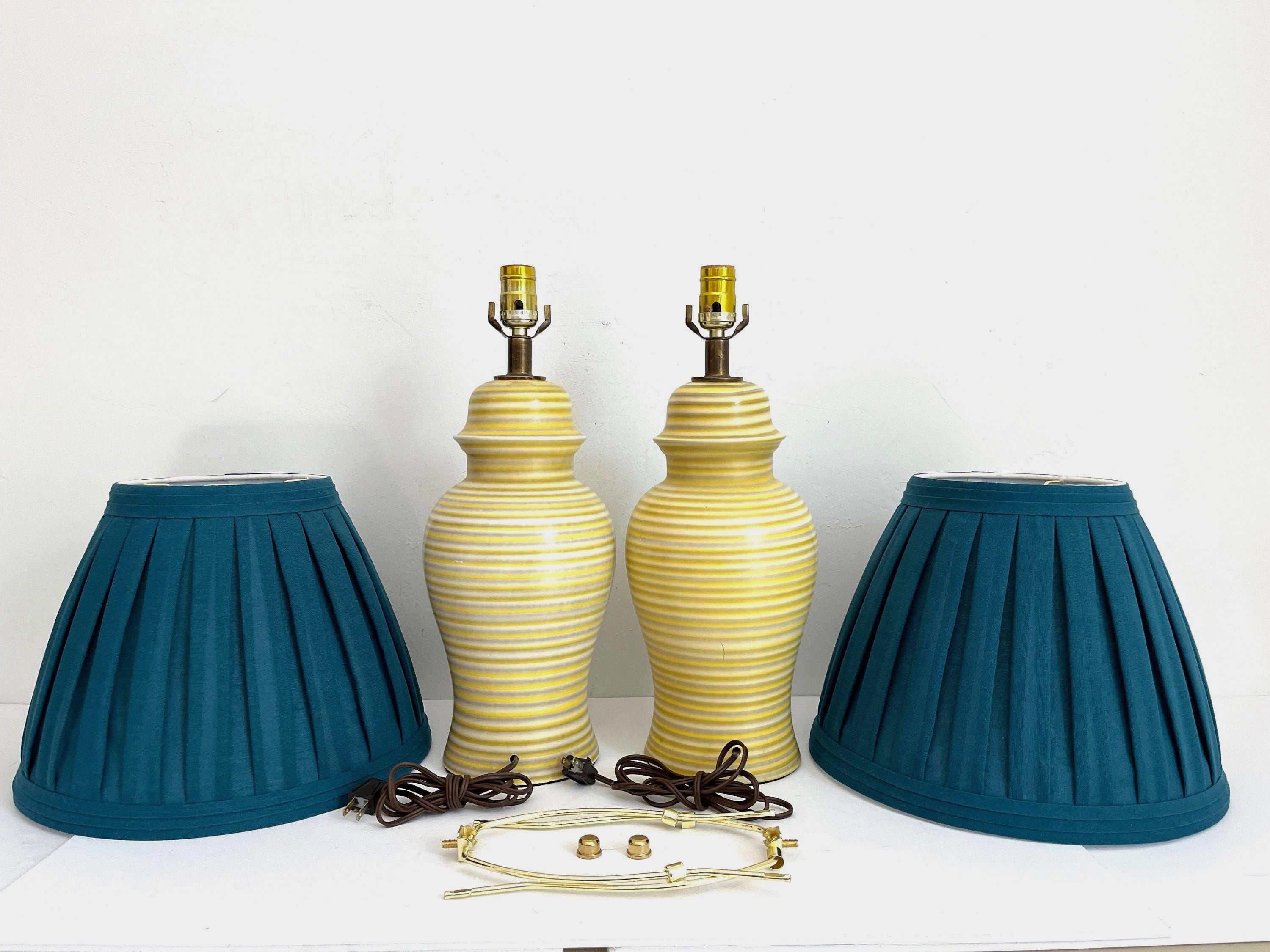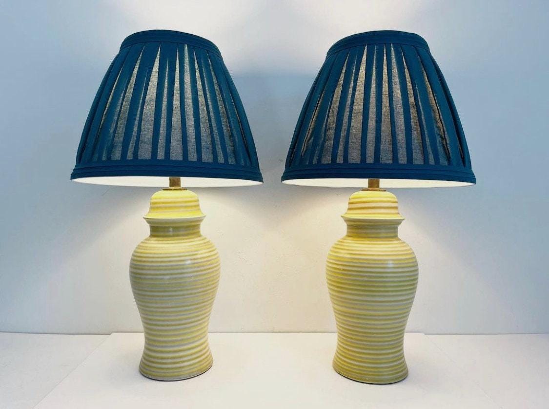 Sunny pair of mid century matte glazed ceramic ginger jar lamps in chic skinny stripes of lemon yellow, white, and soft gray.