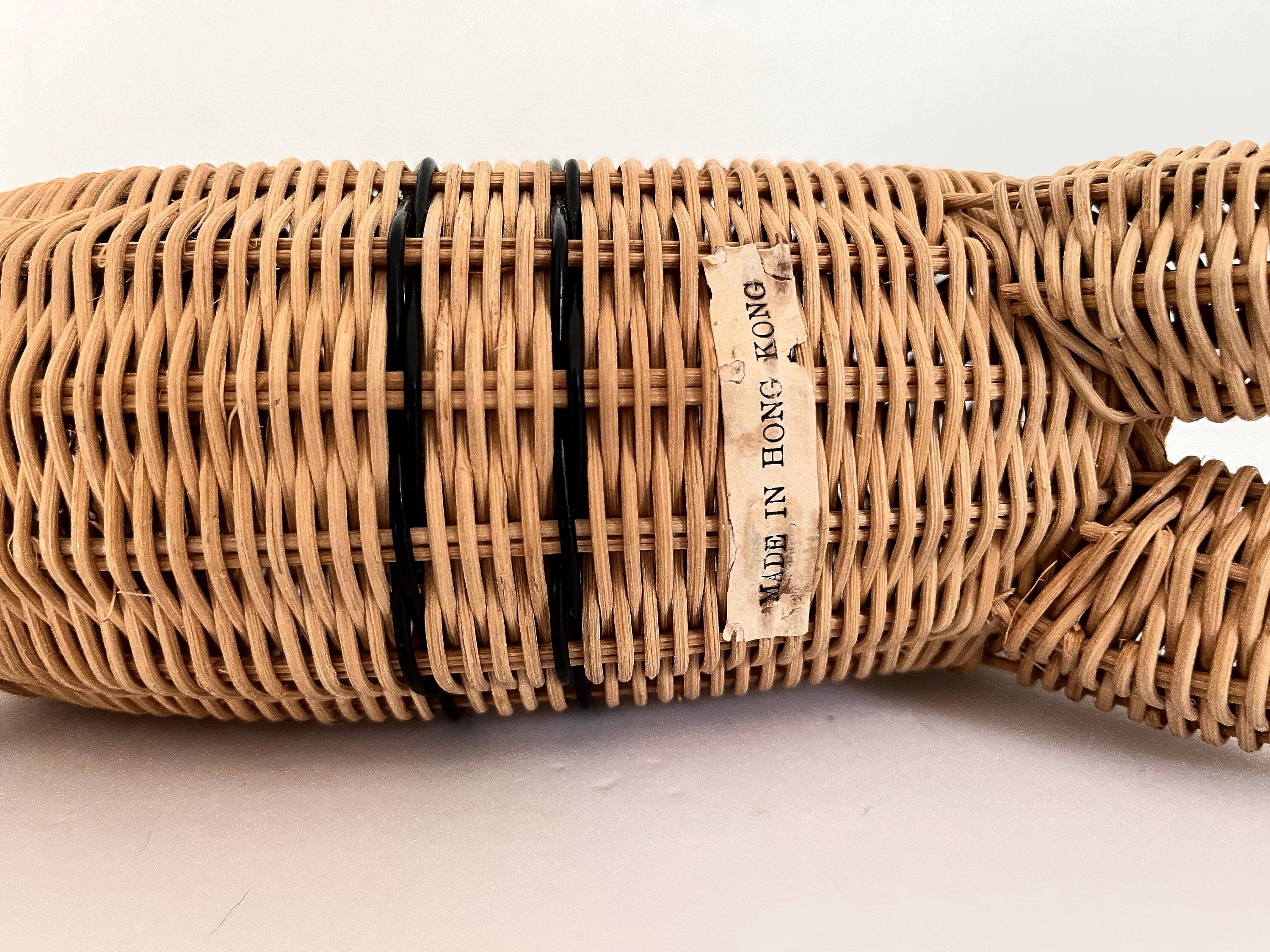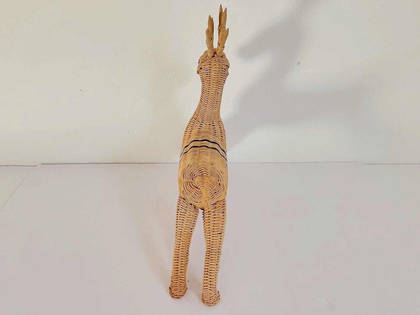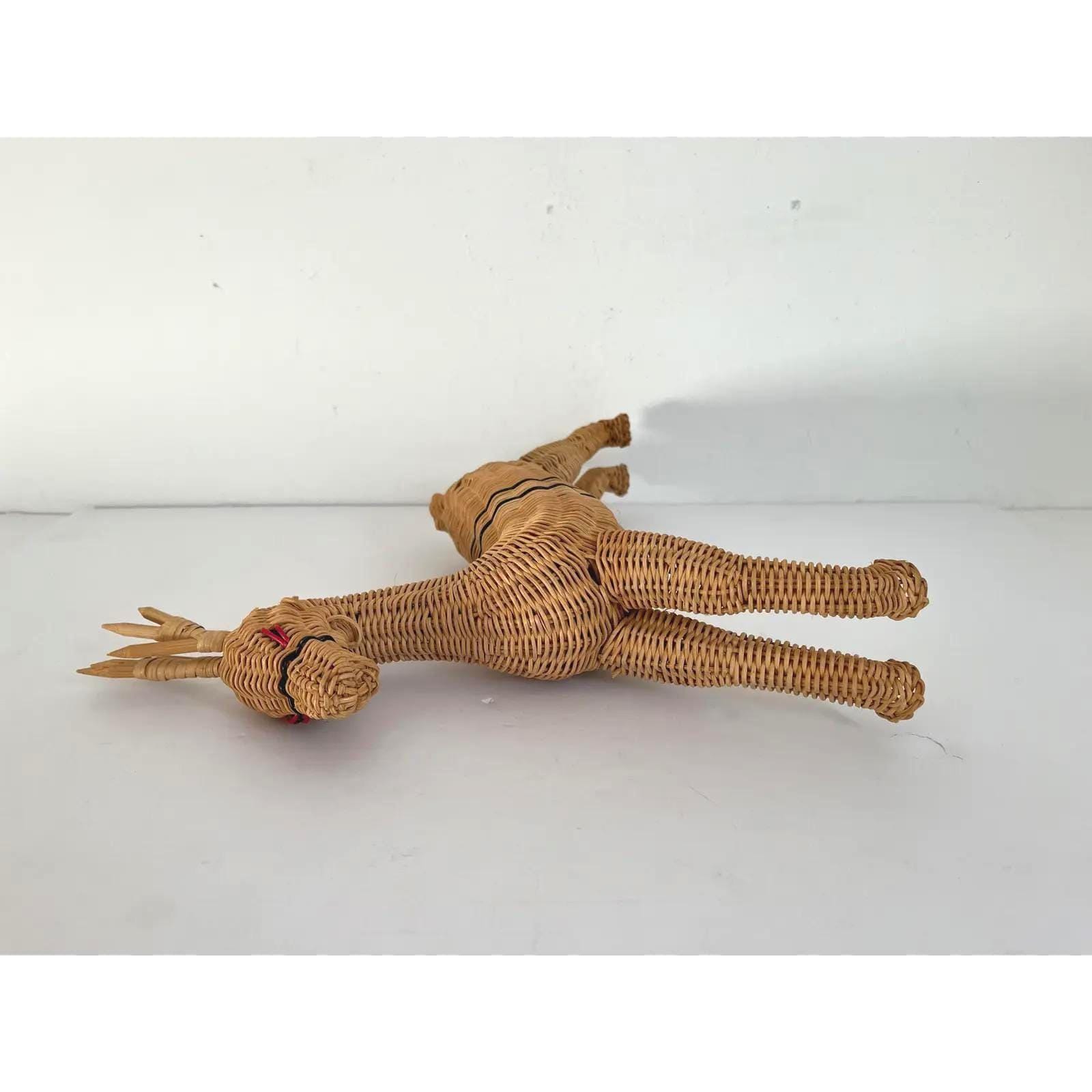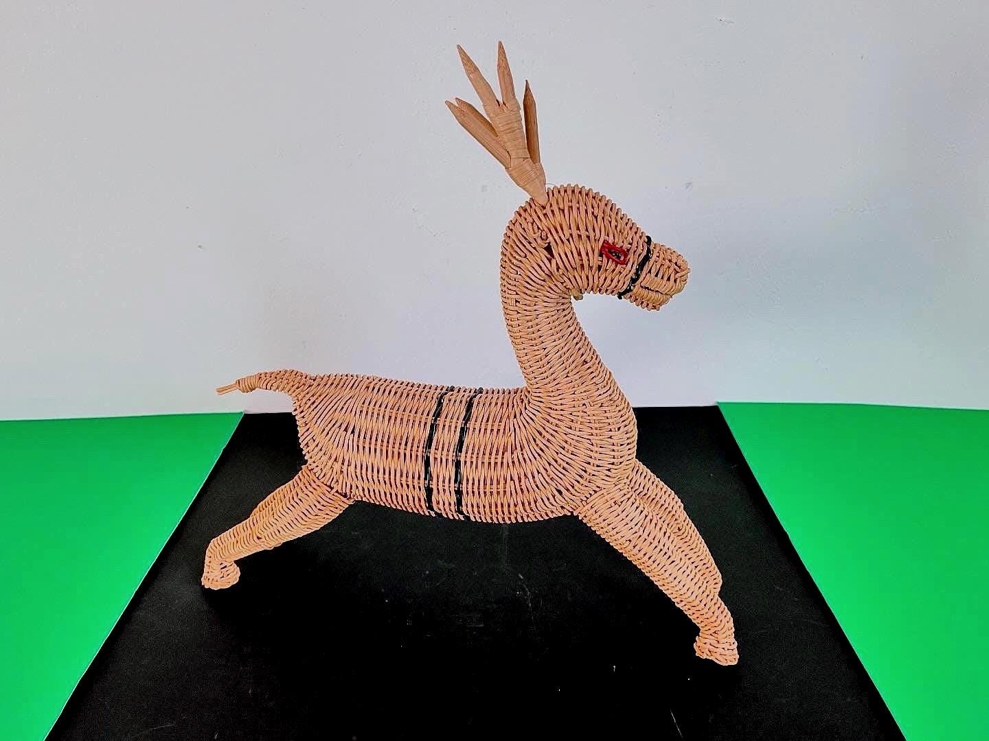 Large whimsical wicker reindeer handcrafted in Hong Kong with striped detailing, red eyes, wrapped antlers, and upraised tail. Retains original Importer's label.