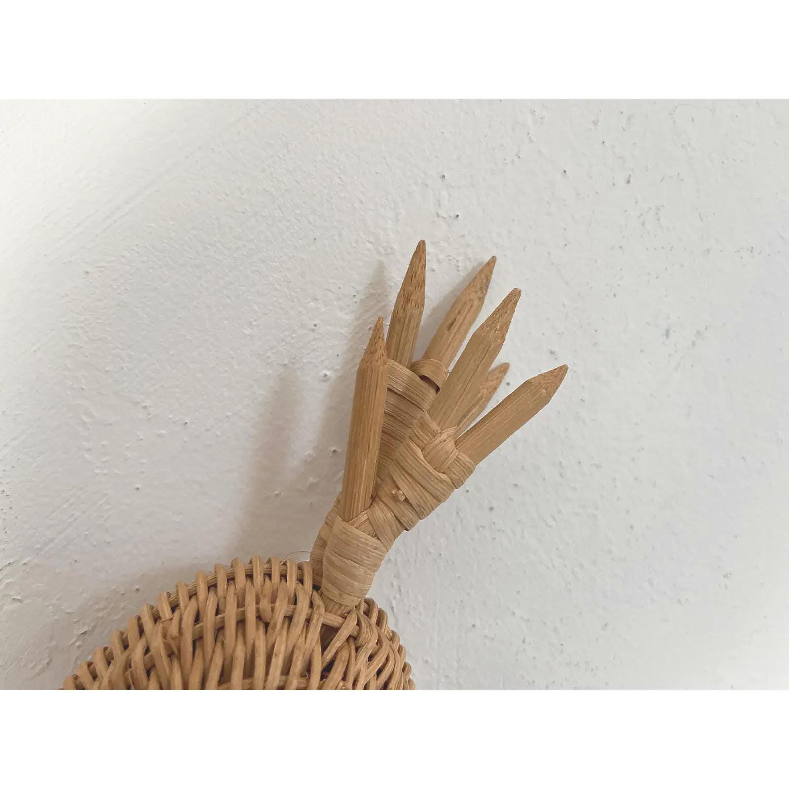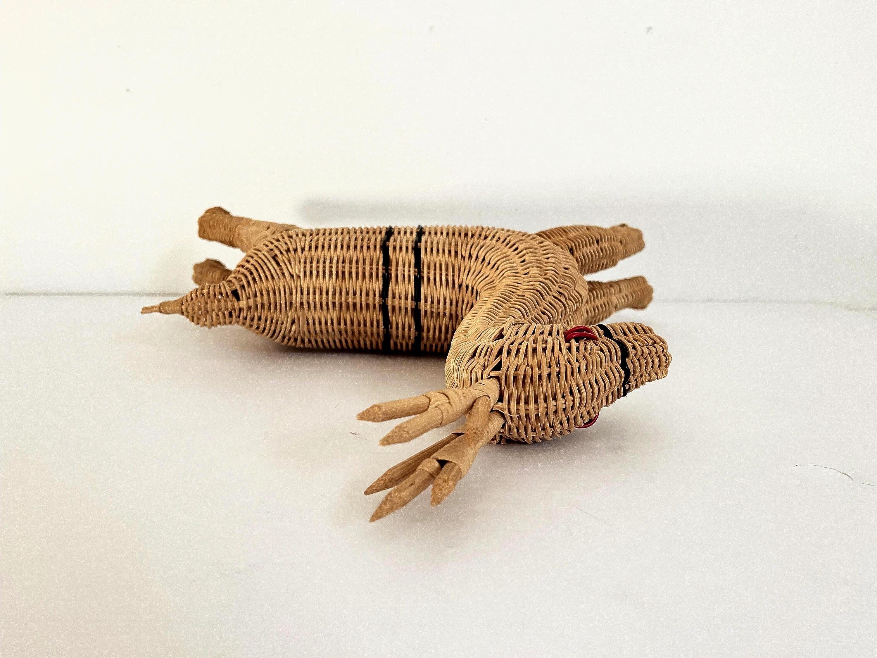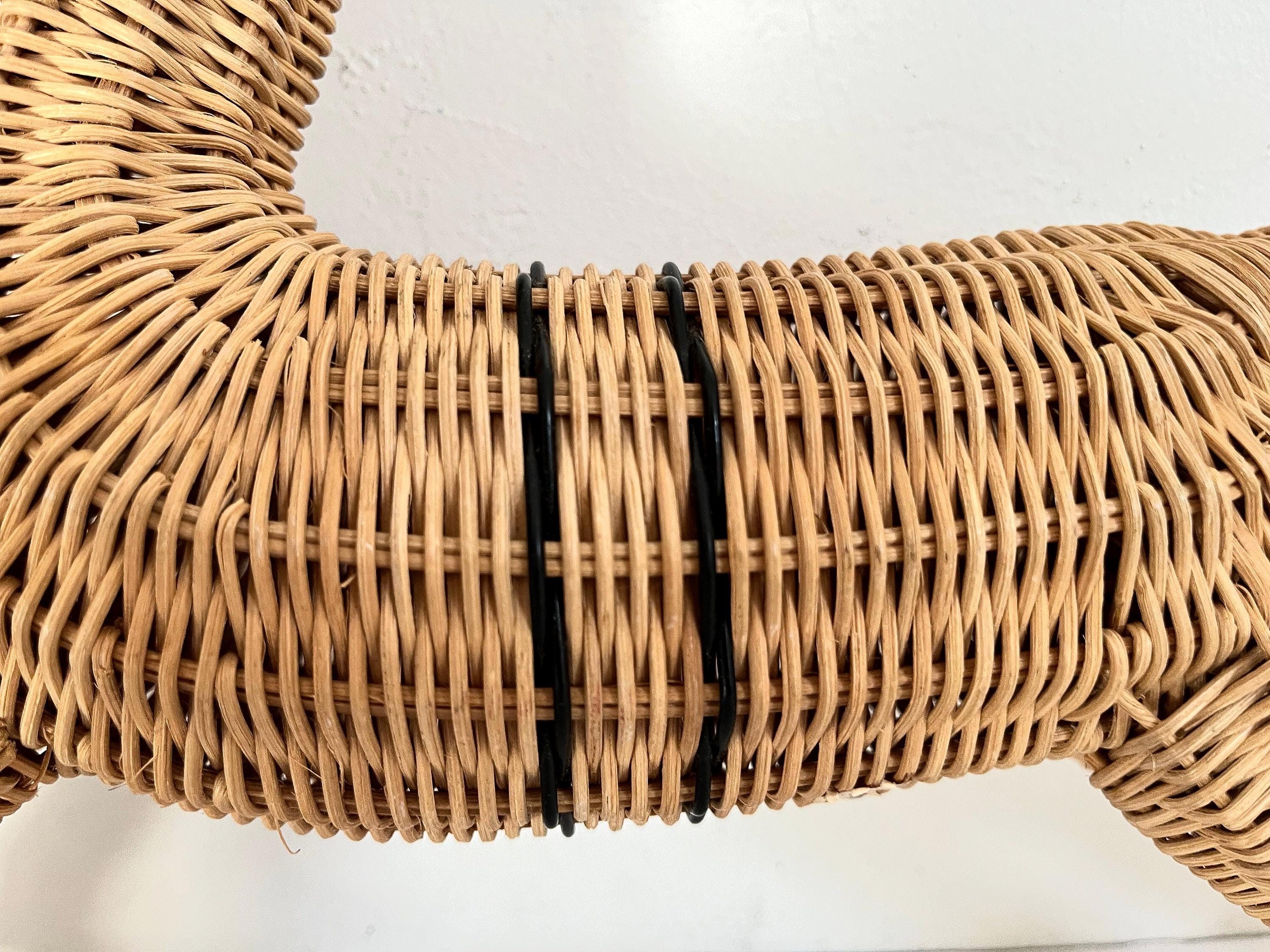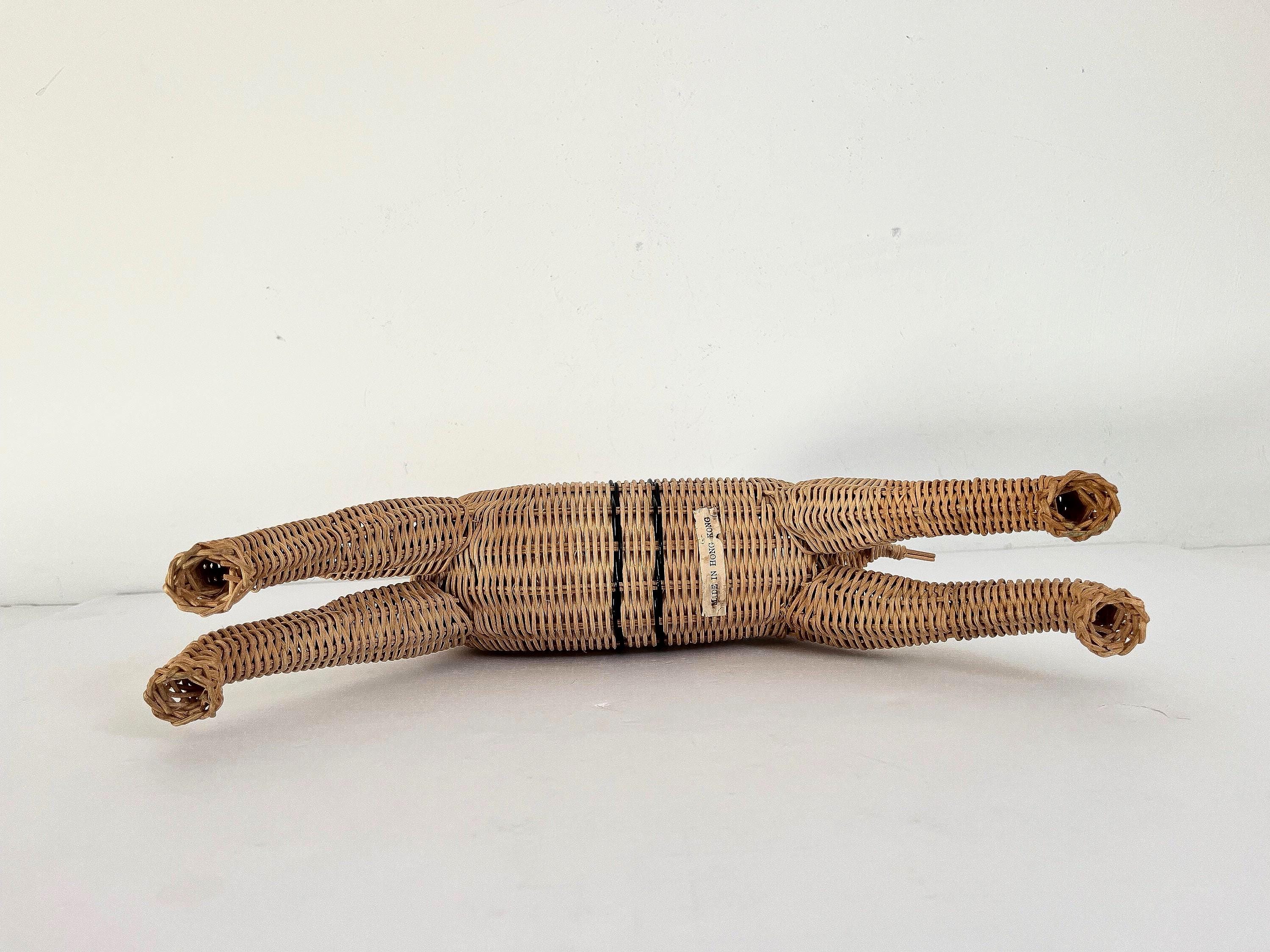 Large whimsical wicker reindeer handcrafted in Hong Kong with striped detailing, red eyes, wrapped antlers, and upraised tail. Retains original Importer's label.