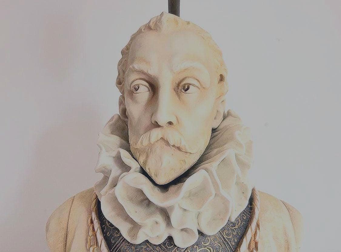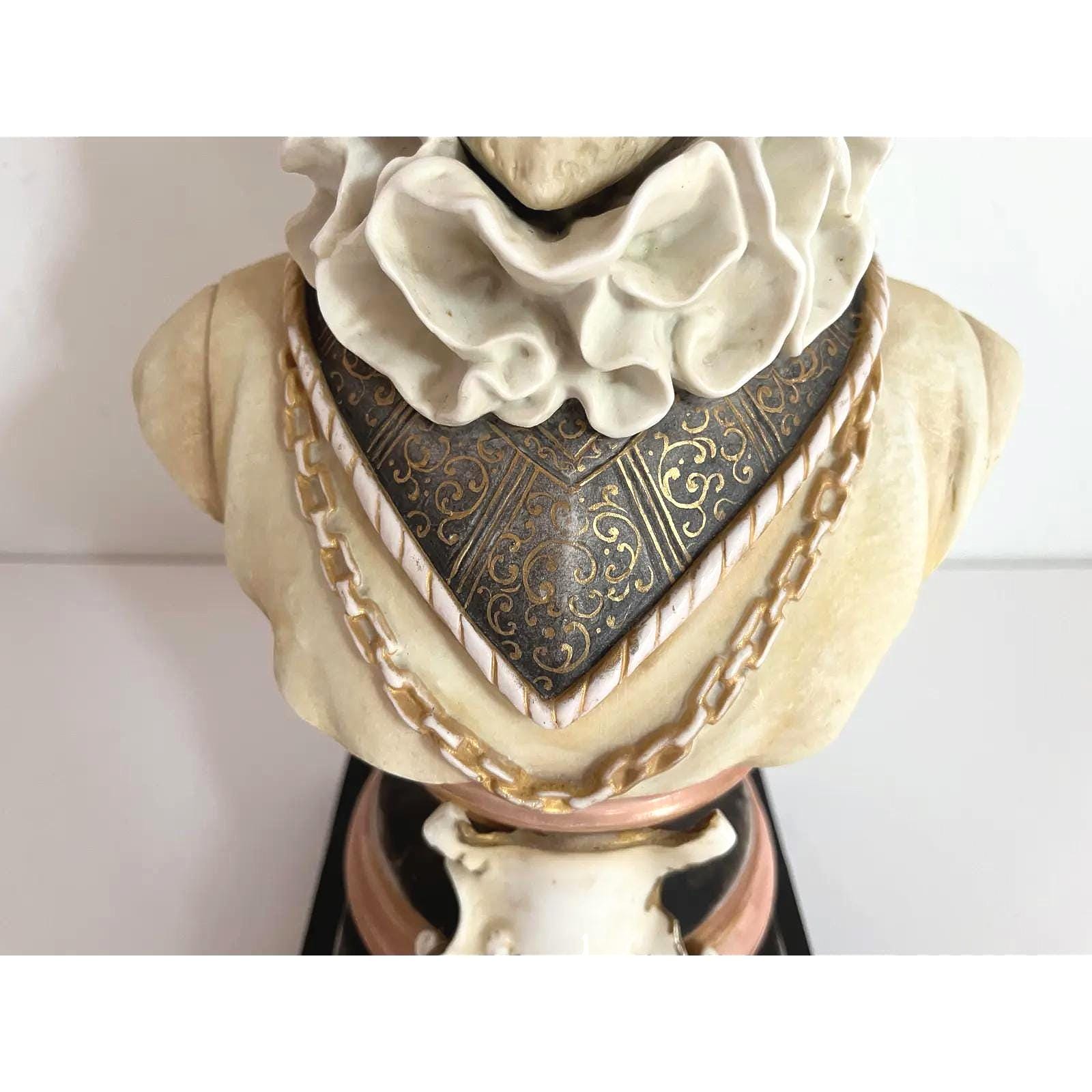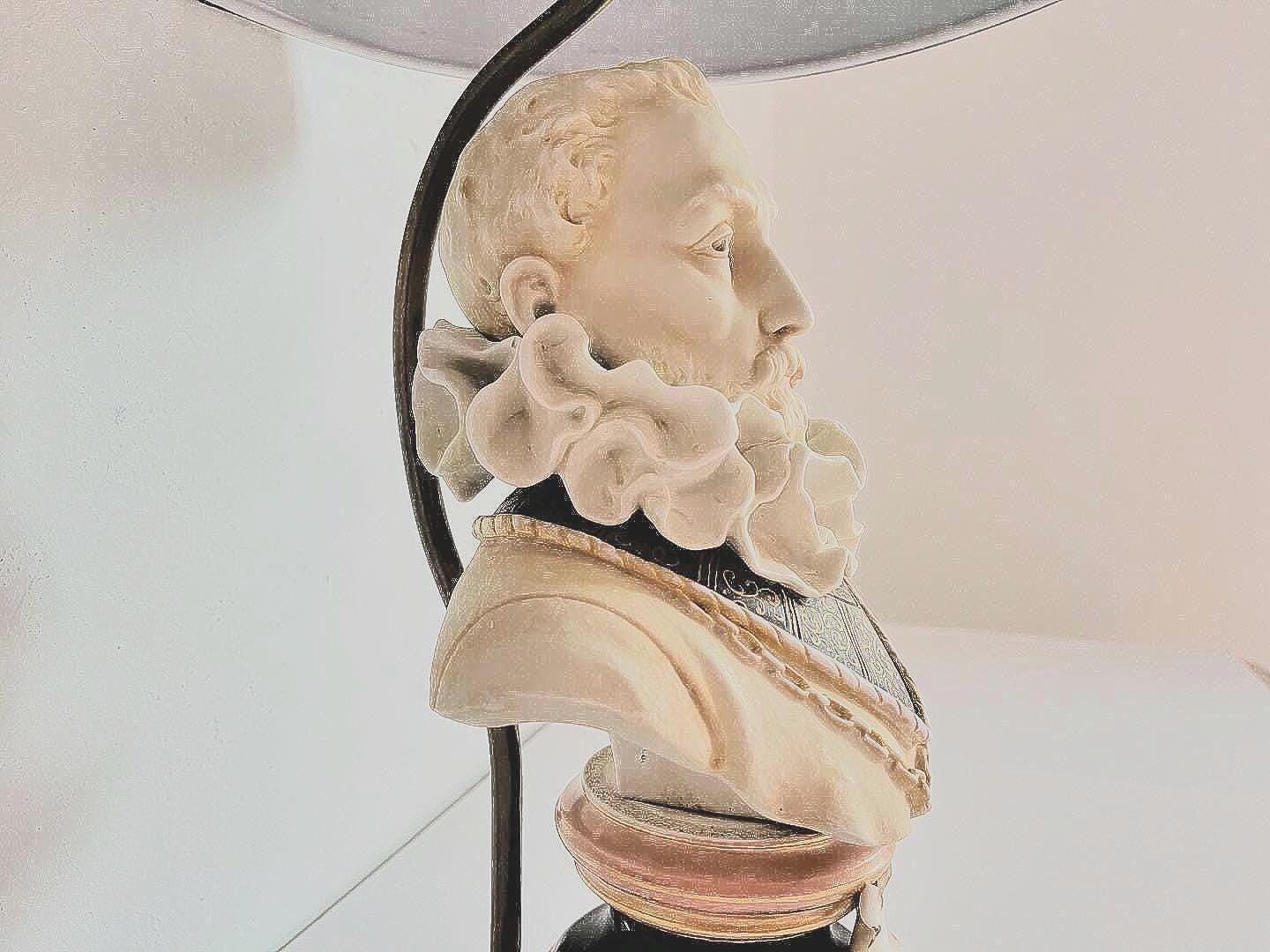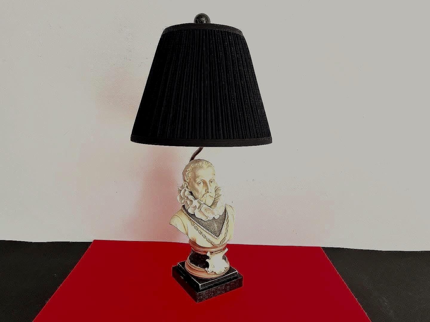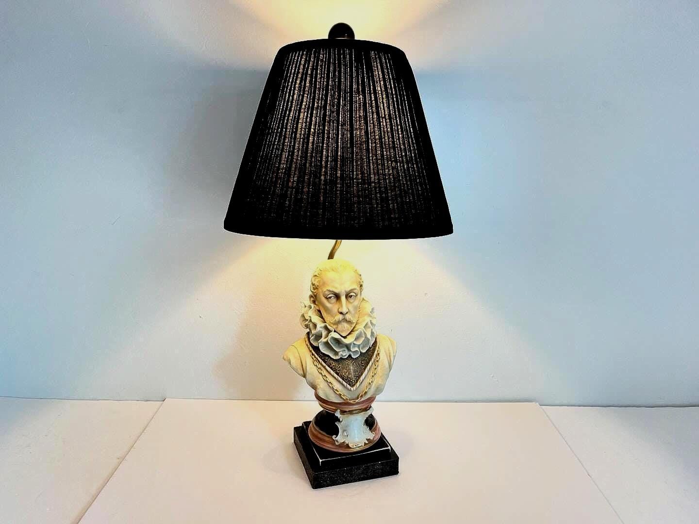 Incredible Italian bisque porcelain bust lamp of presumably, Sir Walter Raleigh, hand painted in soft matte shades of black, gold, and coral with large neck ruff, incised eyes, and raised details finished on all sides. Ideal desk top or table top lighting.