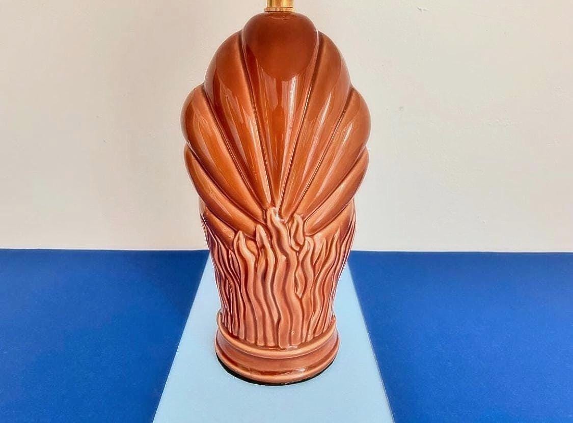 Super cool mid century ceramic scallop shell lamp centered amongst seaweed with hidden angel fish, oyster shell style cutouts, and interior light glazed in rich shades of chocolate brown and sand. This lamp functions as a table lamp and as an accent lamp with three settings to light the top alone, bottom, or both.