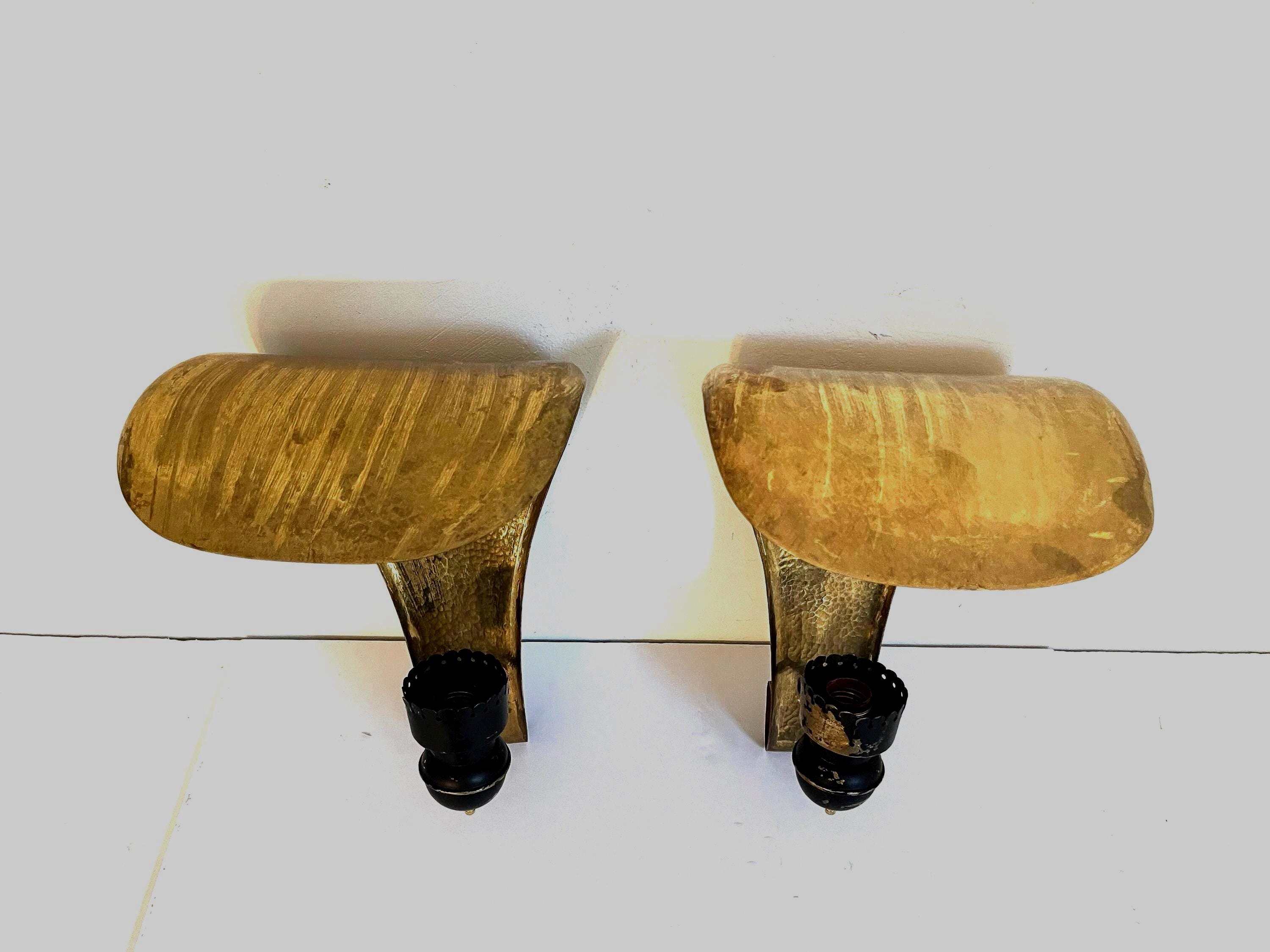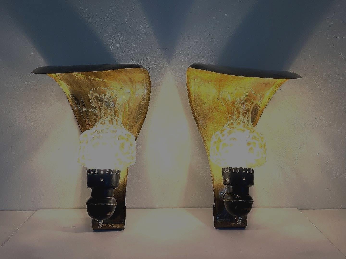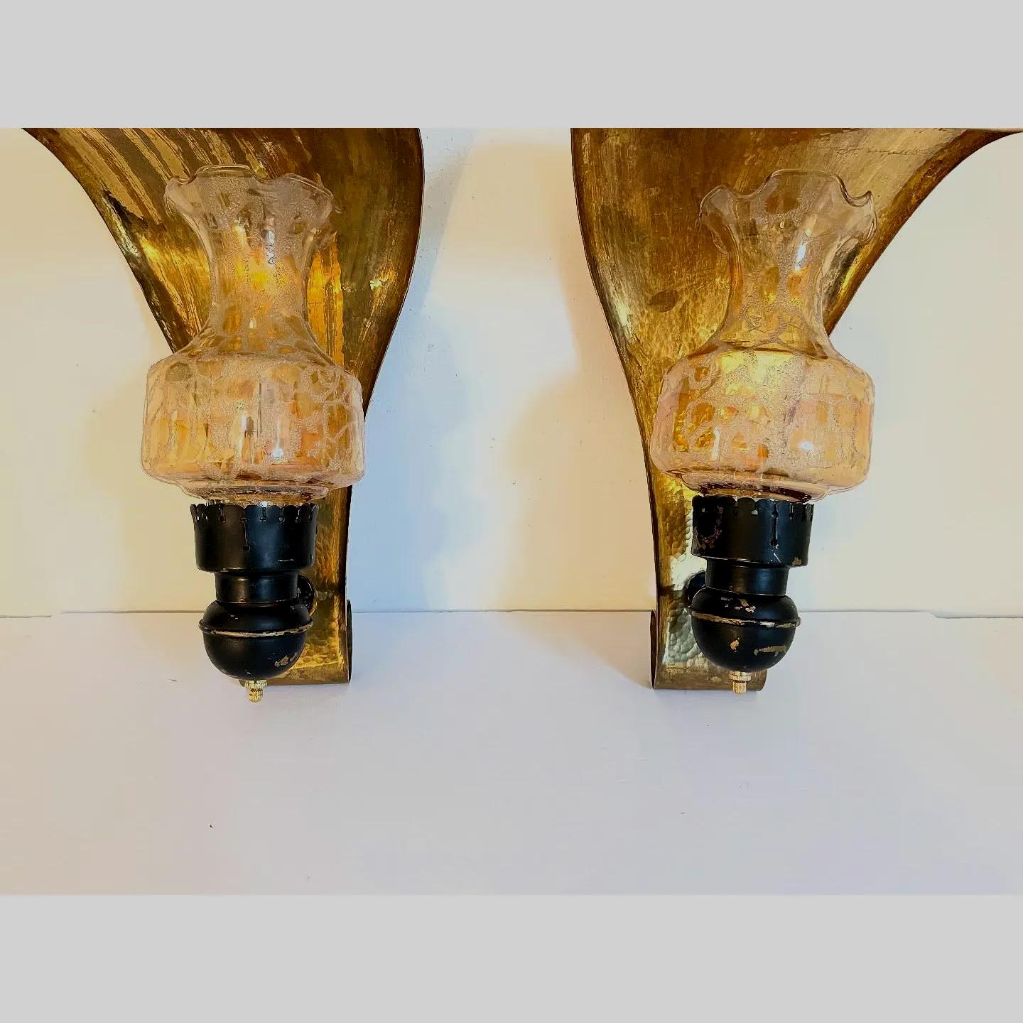 Stunning, huge pair of Italian modern hammered and hooded brass wall lights in the shape of leaves or flower petals with black metal arms and iridescent, beaded glass shades. Each light is marked, "Made Italy."