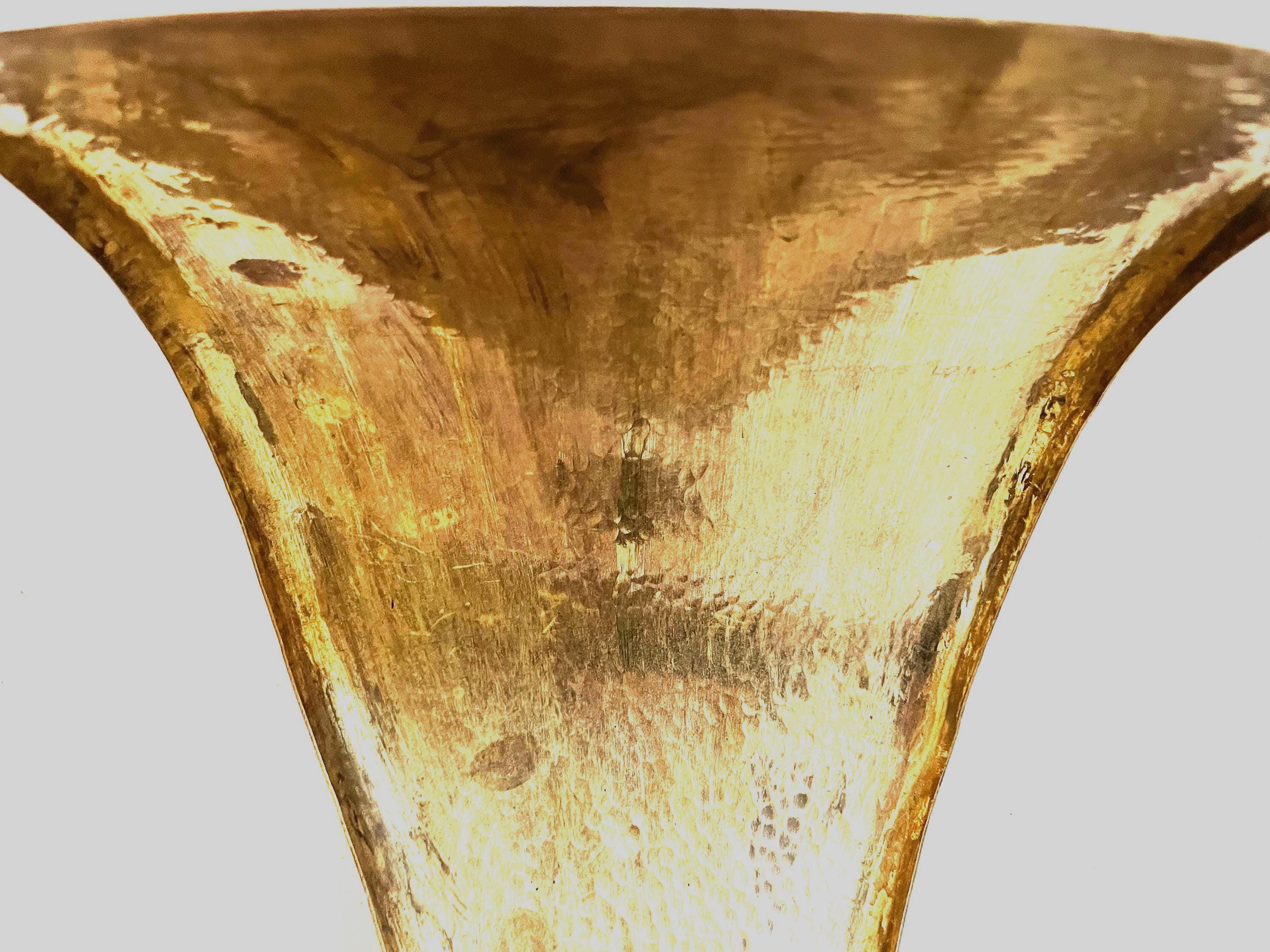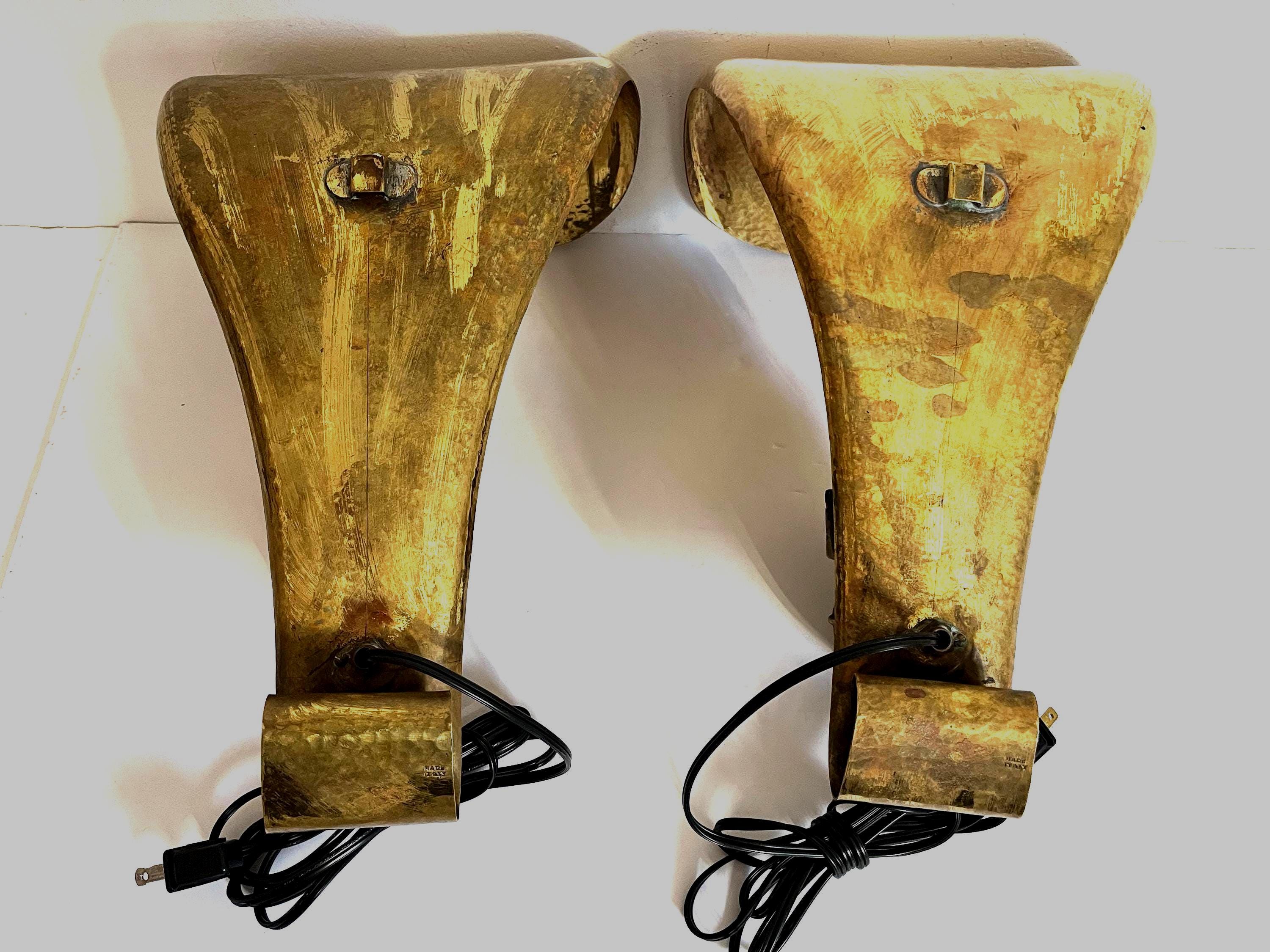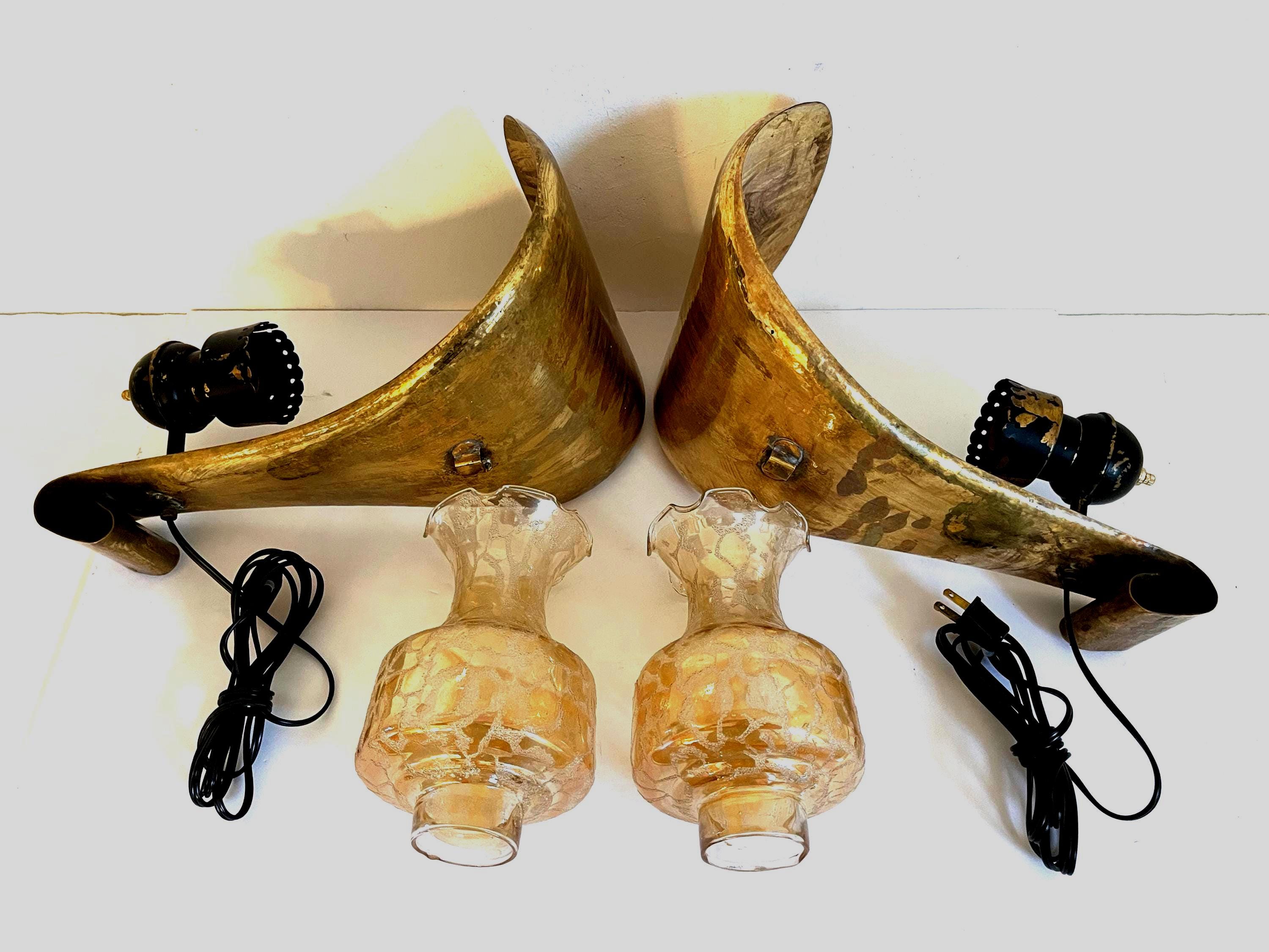 Stunning, huge pair of Italian modern hammered and hooded brass wall lights in the shape of leaves or flower petals with black metal arms and iridescent, beaded glass shades. Each light is marked, "Made Italy."