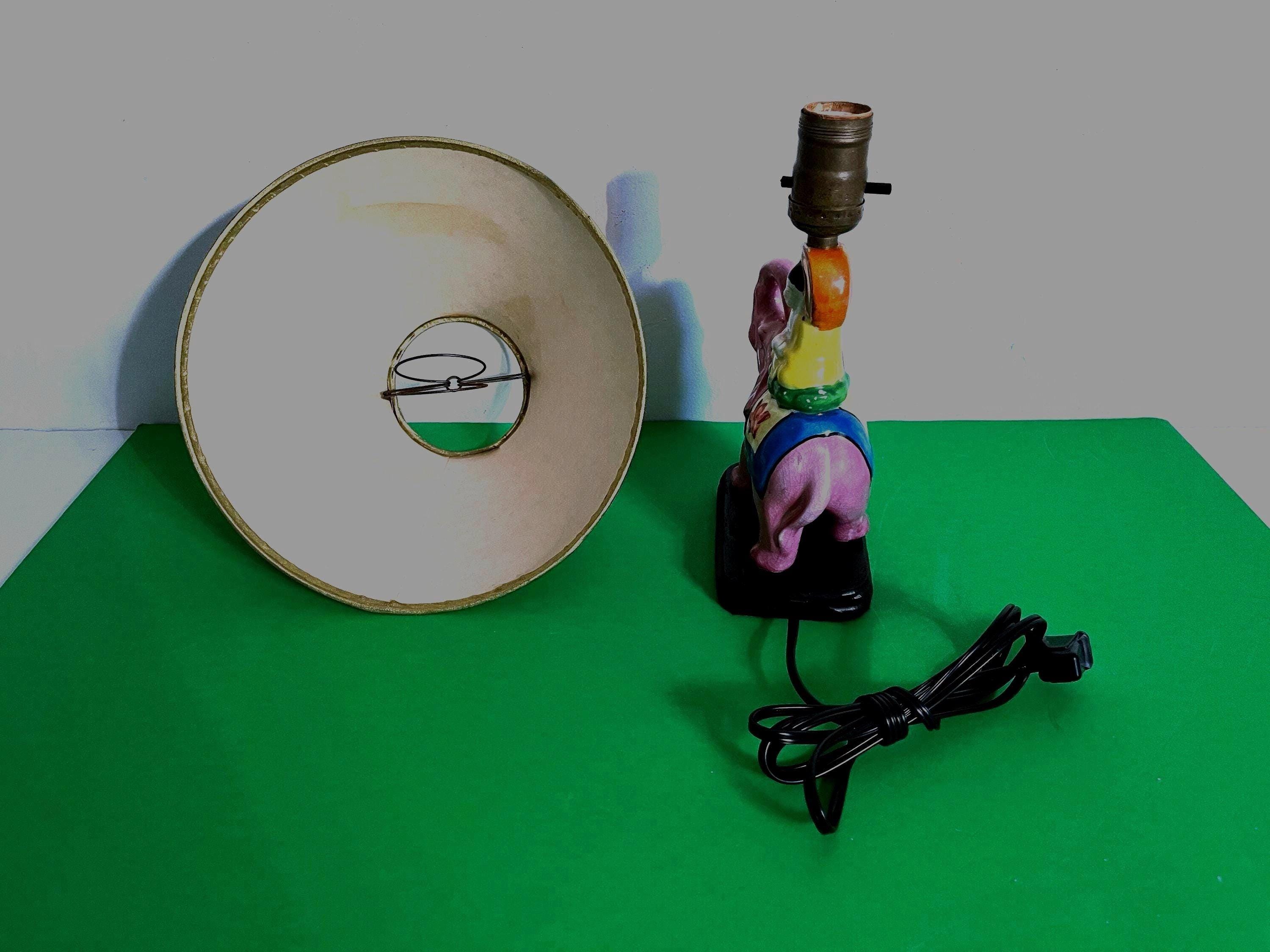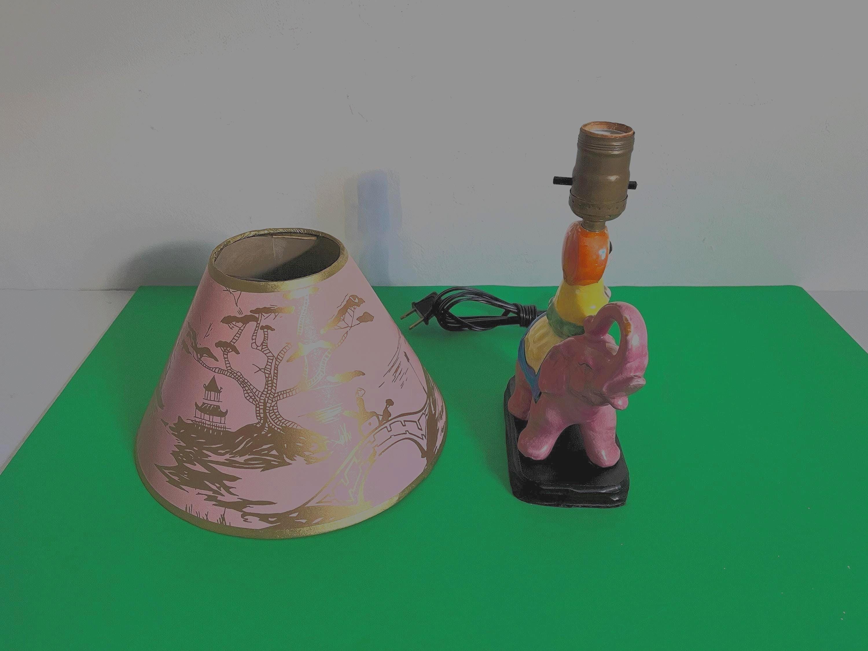 Darling Japanese crackle glazed porcelain lamp featuring a hand painted iridescent pink elephant with lucky upraised trunk, colorful blanket, and rider on a rectangular wood base. Marked, Hand Paint, Made in Japan. Fab vintage clip-on pink and gold chinoiserie toile paper shade included.