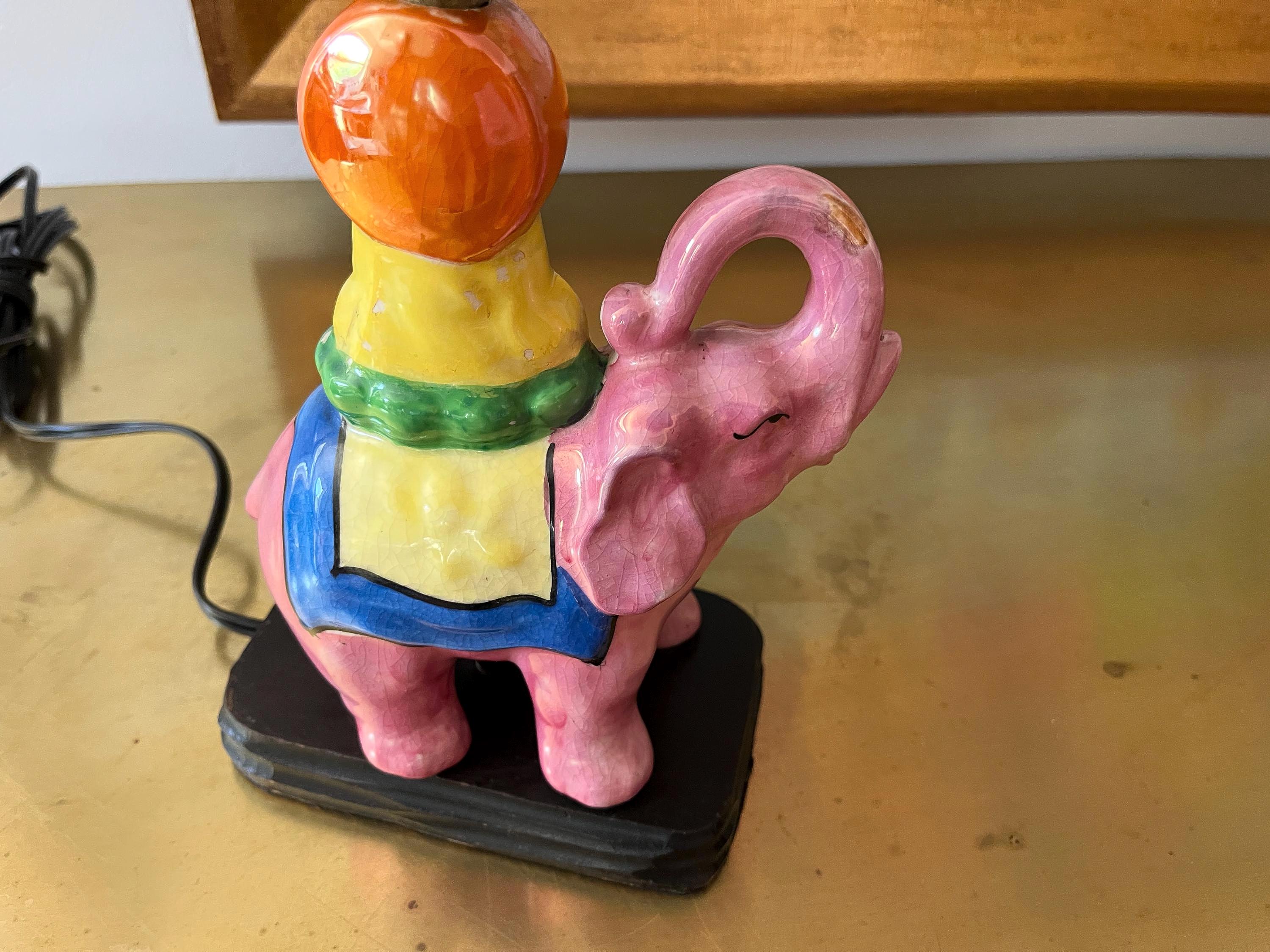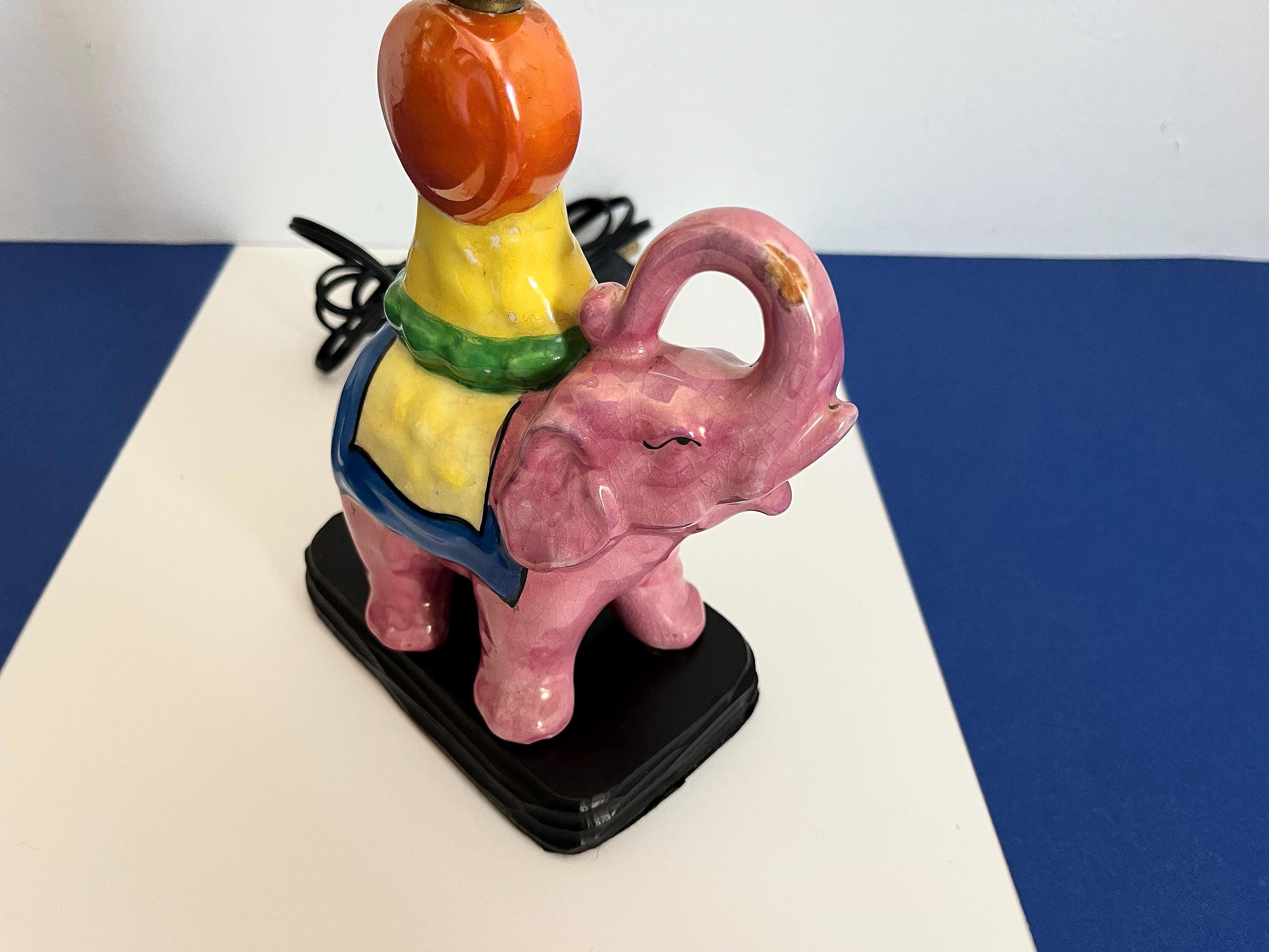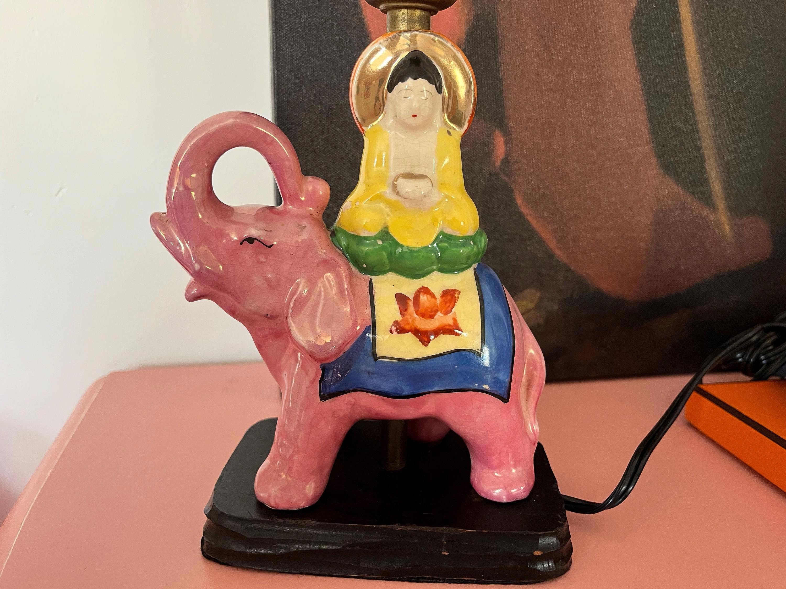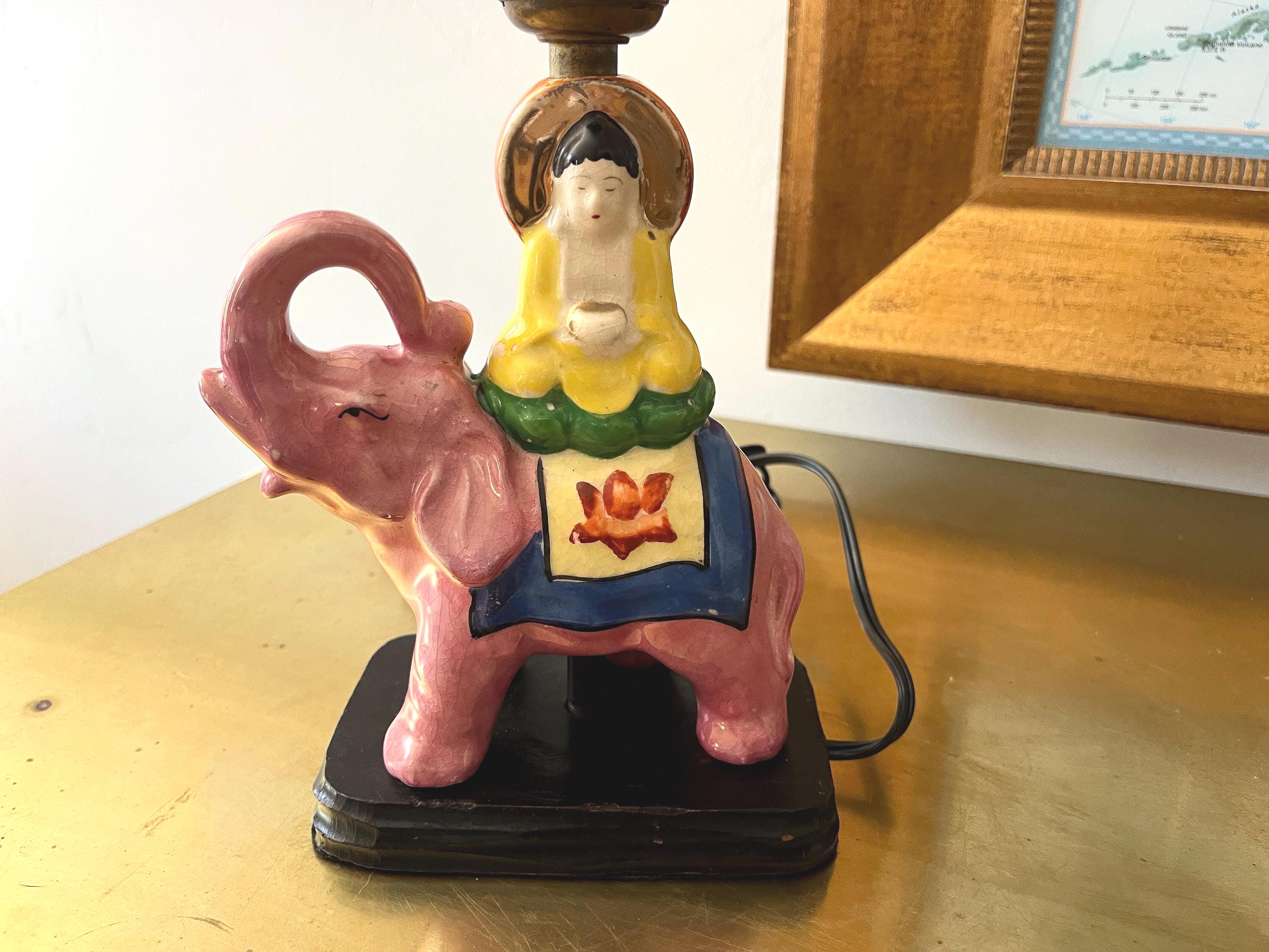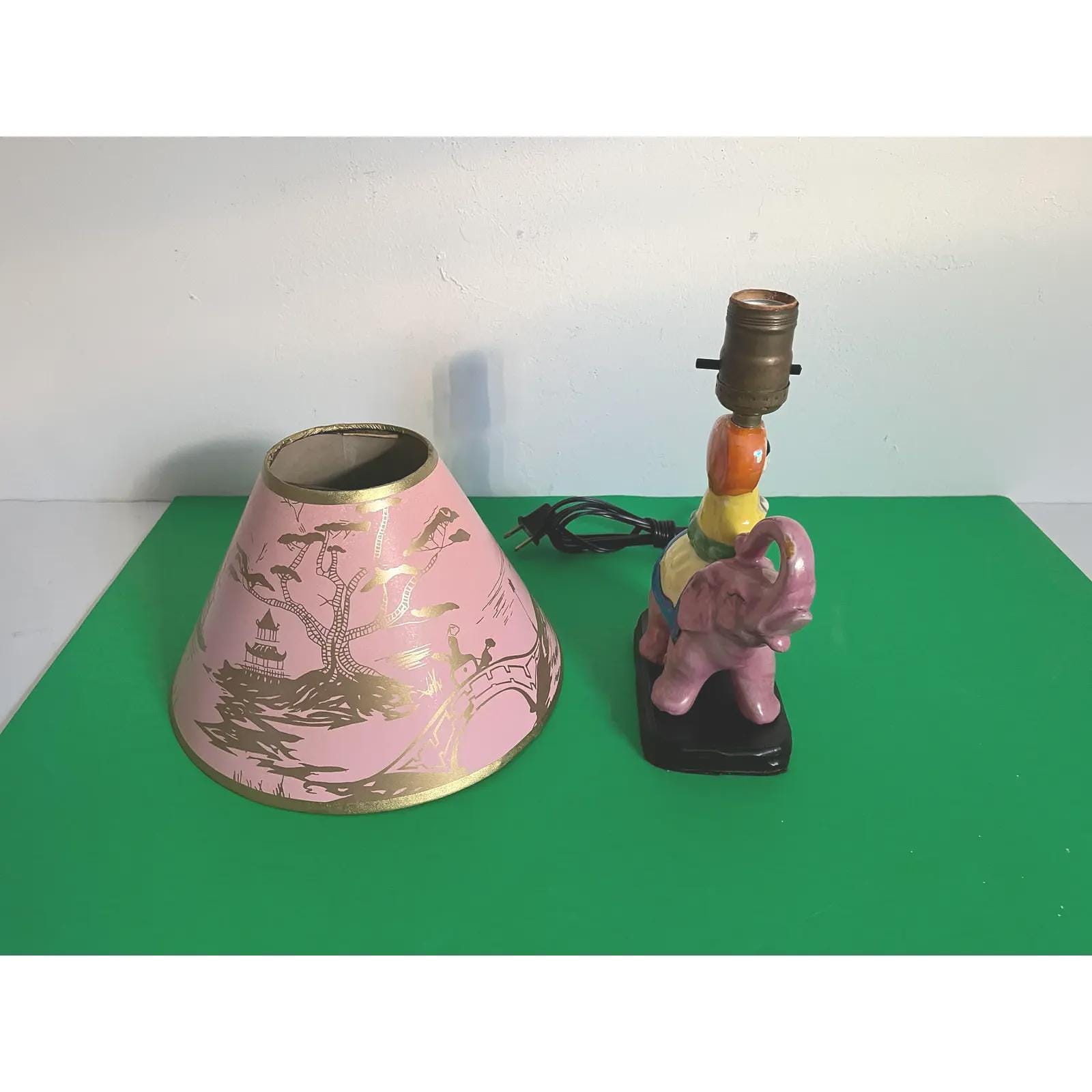 Darling Japanese crackle glazed pink porcelain elephant lamp hand painted with iridescent lucky upraised trunk, colorful blanket, and rider on a rectangular wood base. Marked, Hand Paint, Made in Japan. Gorgeous vintage pink and gold toile parchment lamp shade included.