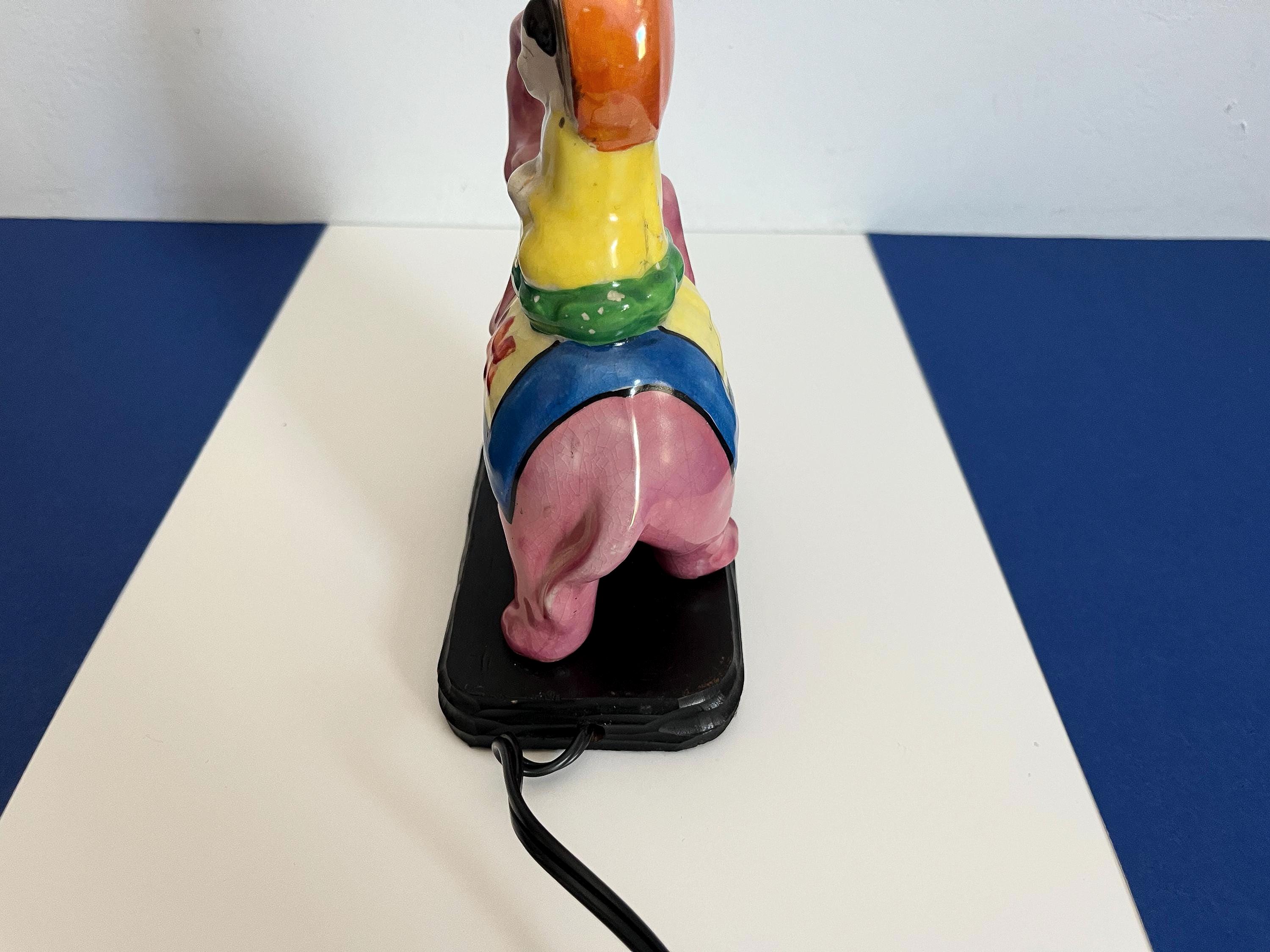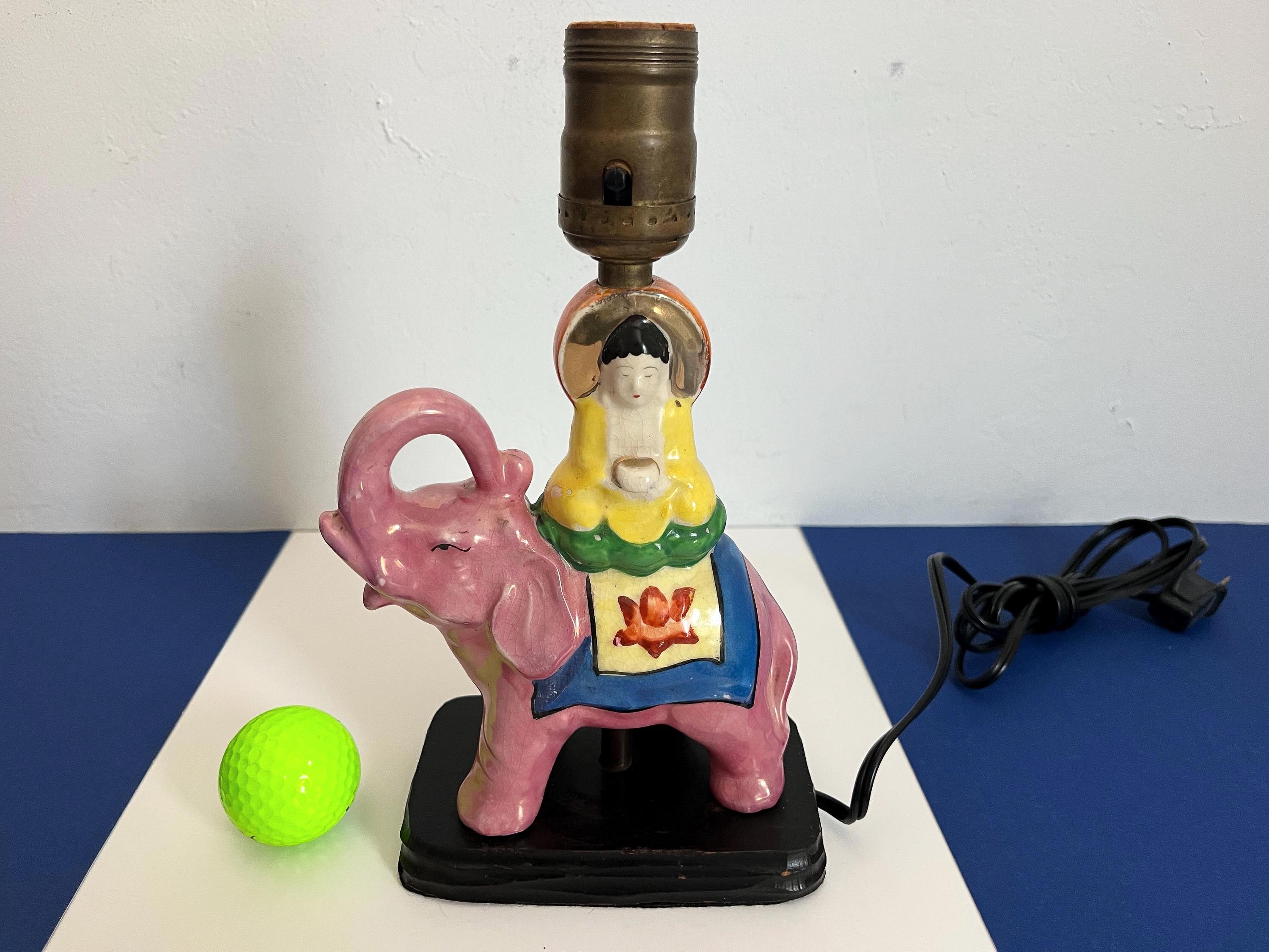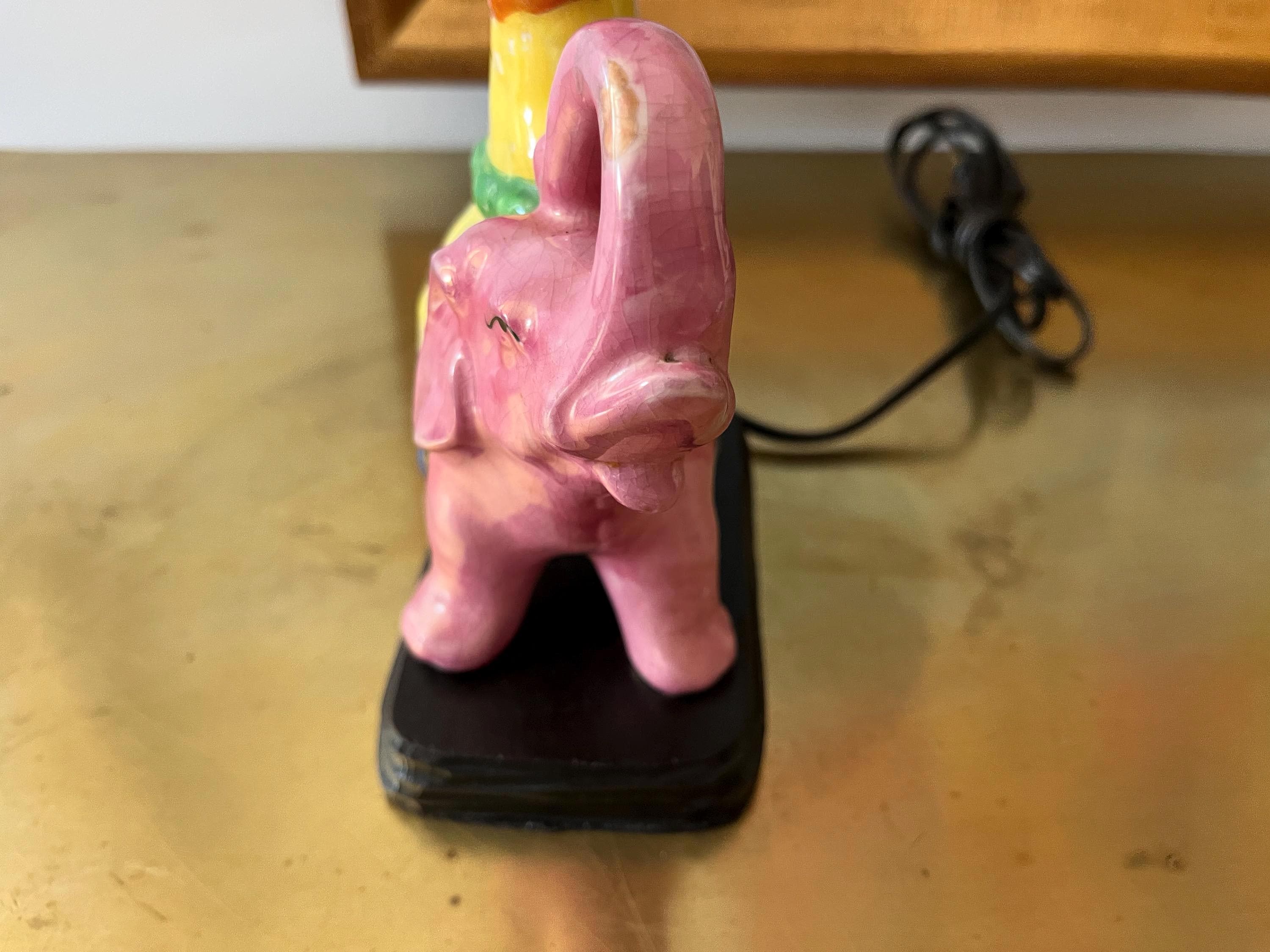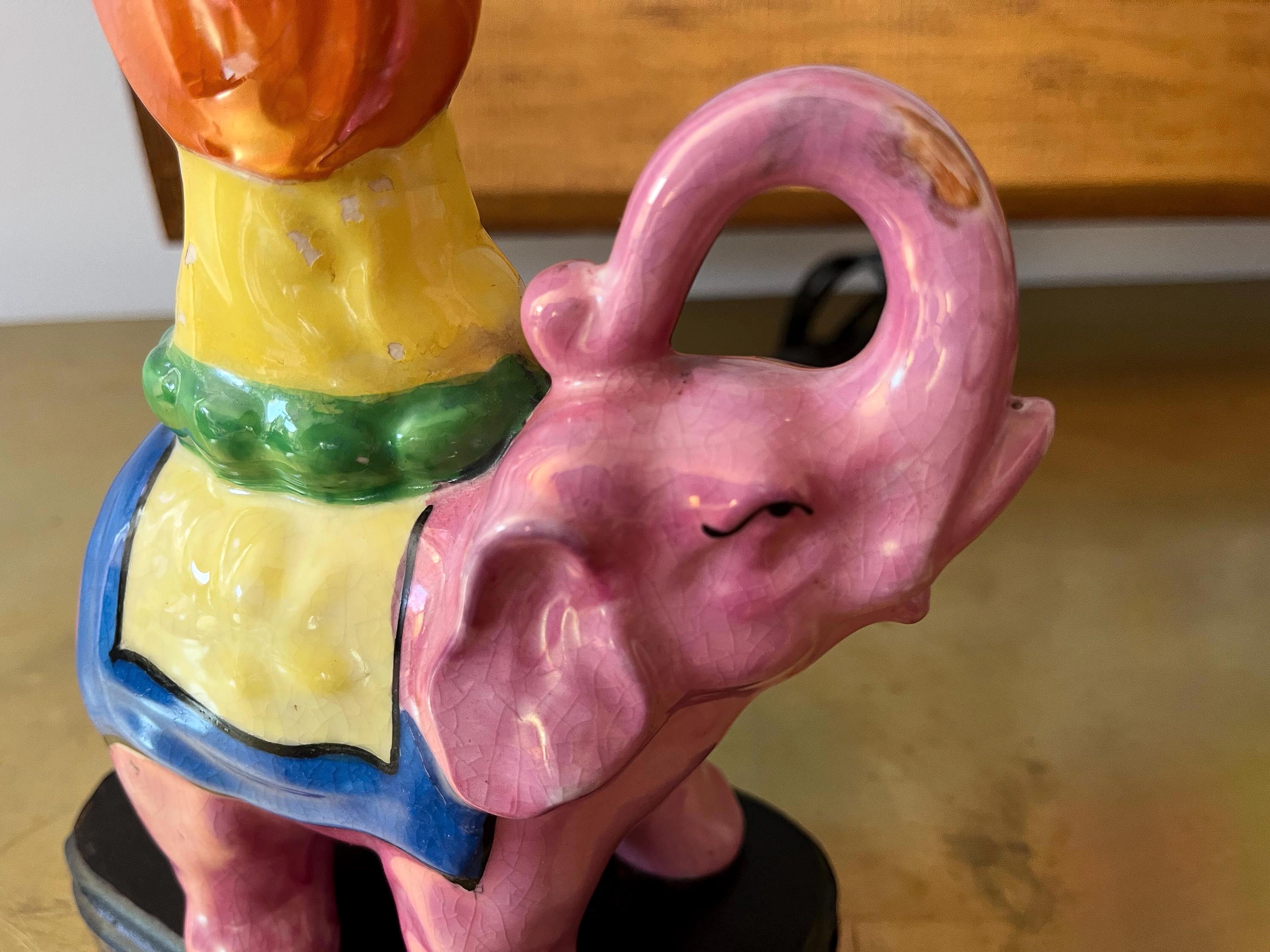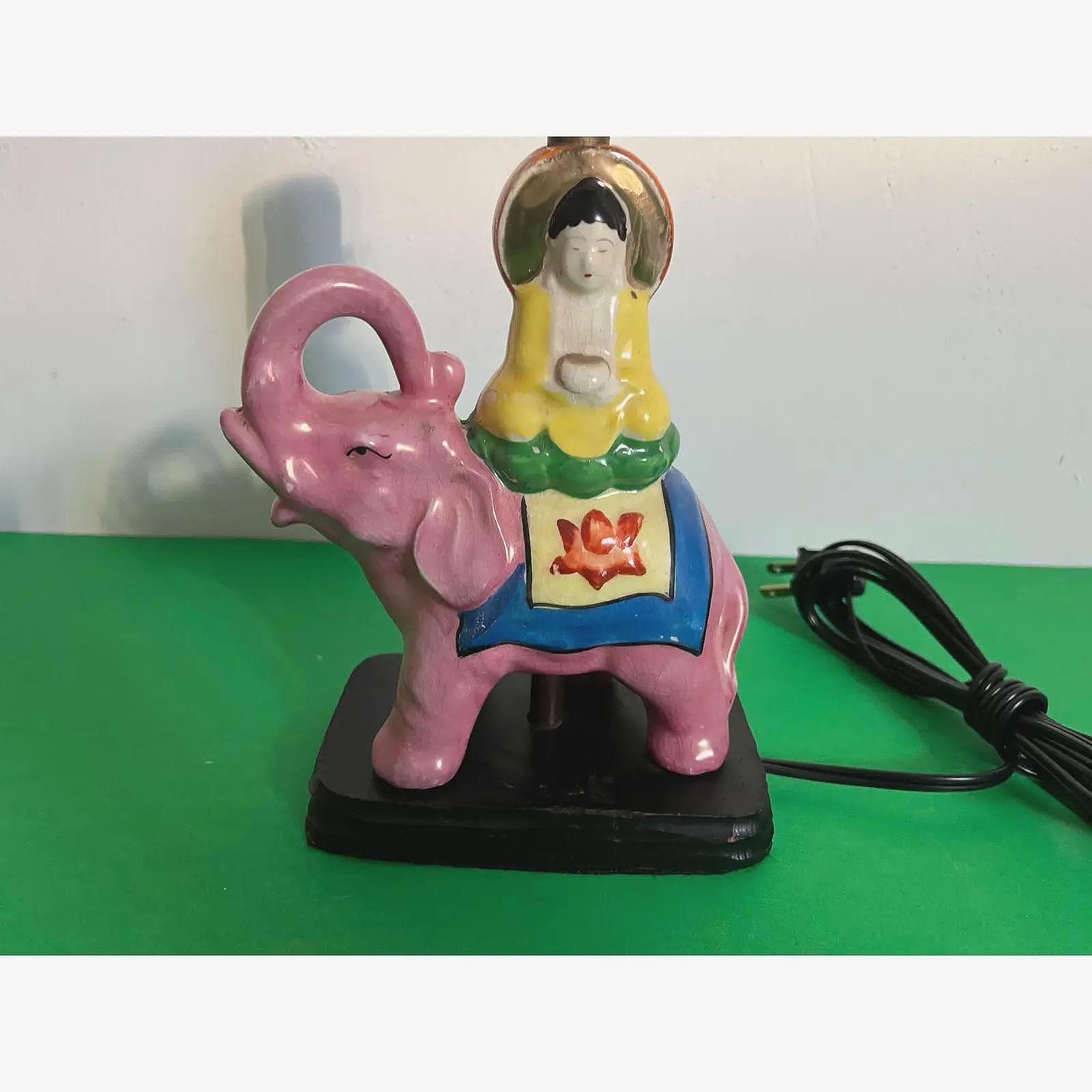 Darling Japanese crackle glazed pink porcelain elephant lamp hand painted with iridescent lucky upraised trunk, colorful blanket, and rider on a rectangular wood base. Marked, Hand Paint, Made in Japan. Gorgeous vintage pink and gold toile parchment lamp shade included.
