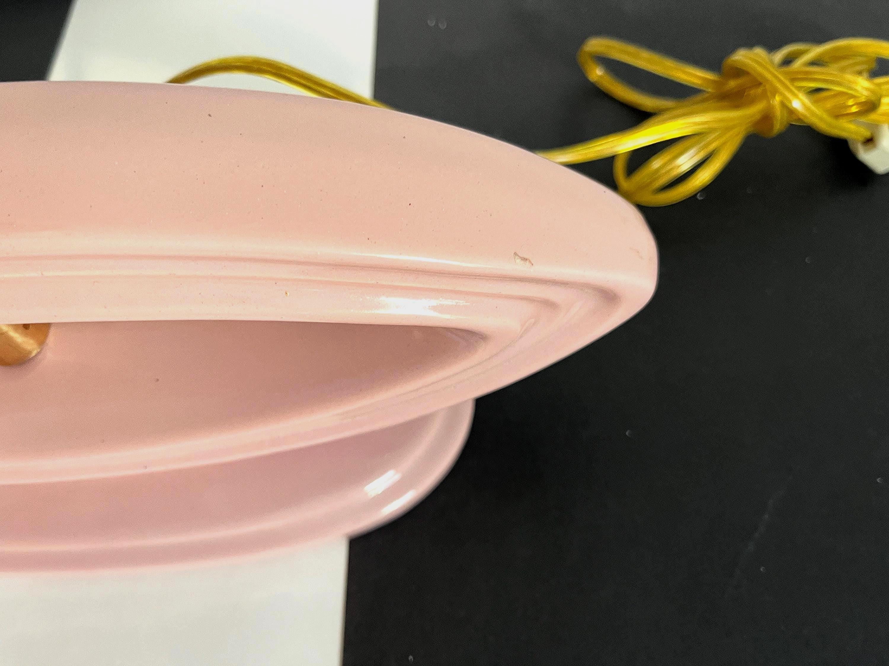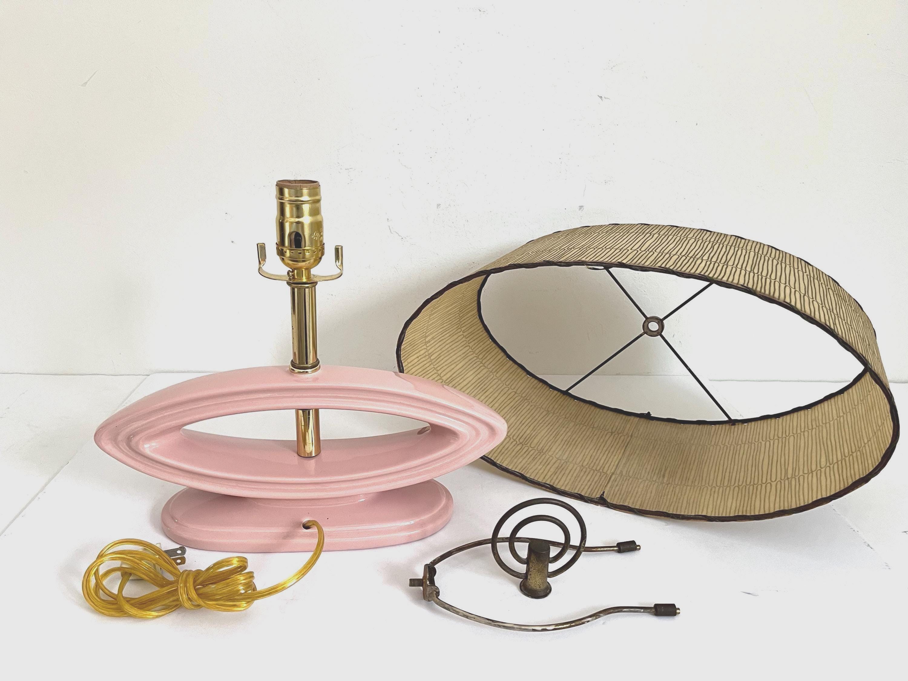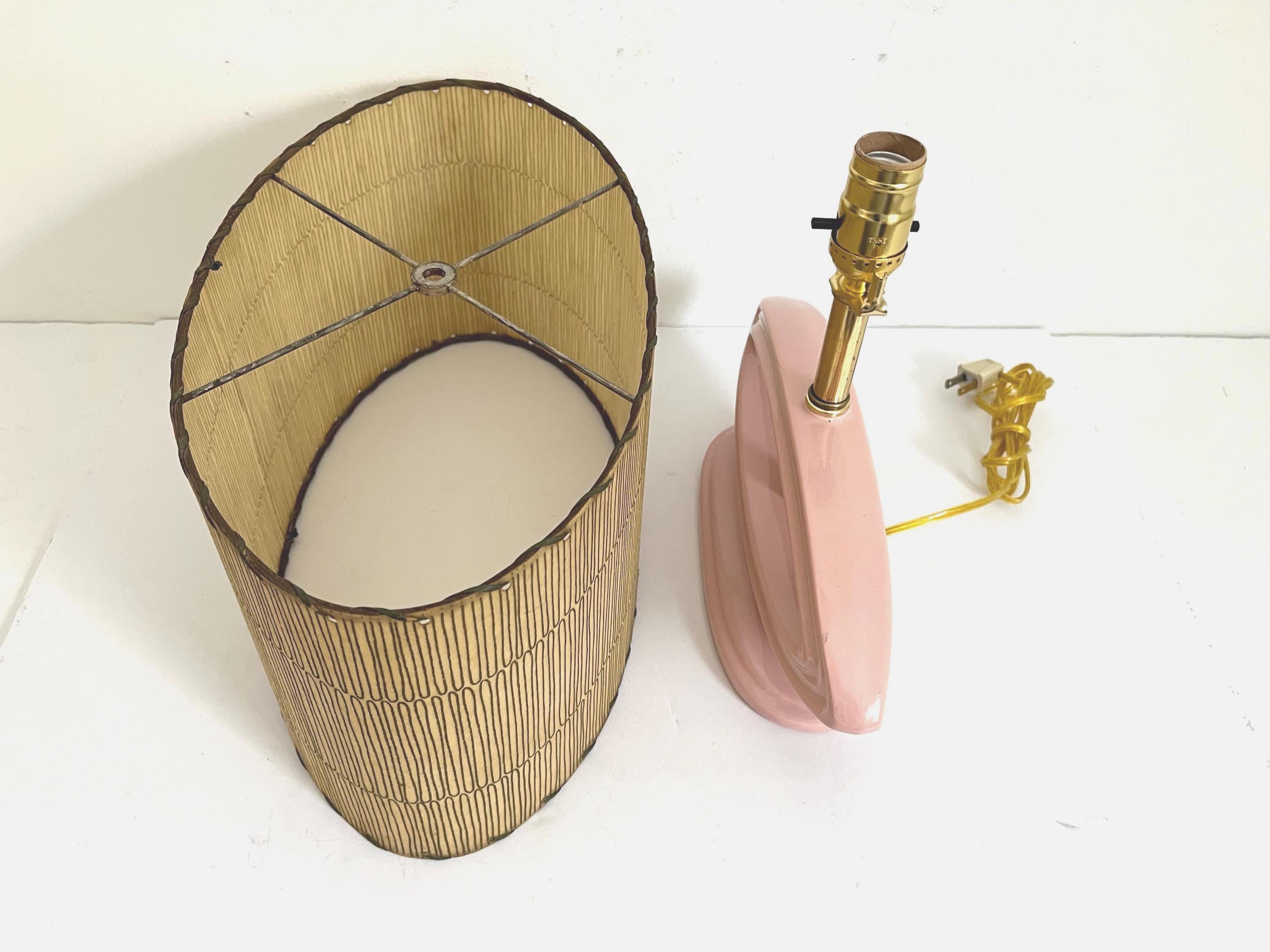 Chic modern open oval lamp of glazed dimensional blush pink ceramic with integrated base and original squiggle patterned fiberglass shade, harp, and open globe finial.