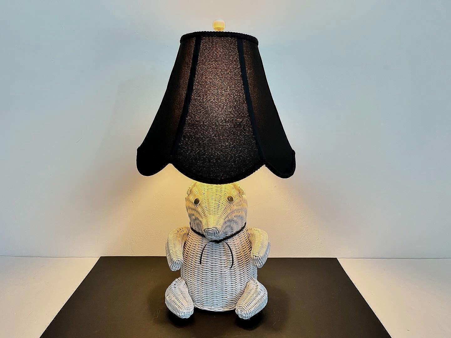 Adorable mid century white wicker seated upright teddy bear lamp complete with googly eyes, jaunty black ribbon, and round tail.