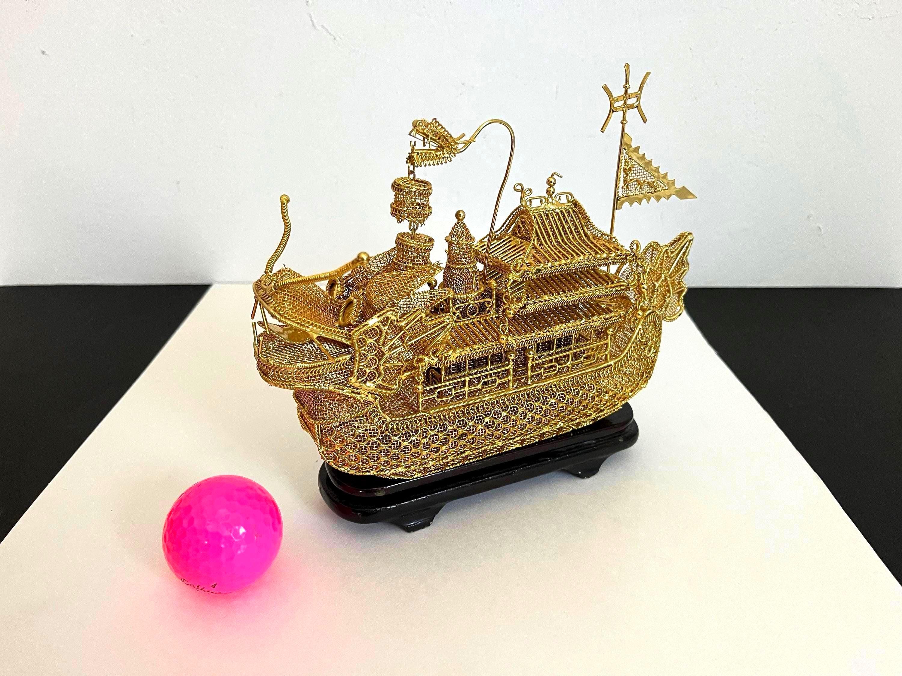 Stunning mid century dragon boat hand crafted of filigreed gold metal mesh with exceptional dimensional detailing throughout including scales, hanging layered bells, tiered pagoda roof, flags, and open-mouthed dragon complete with fangs, tongue, and coiled spring antennae on an oval tiered and footed lacquered wood stand.