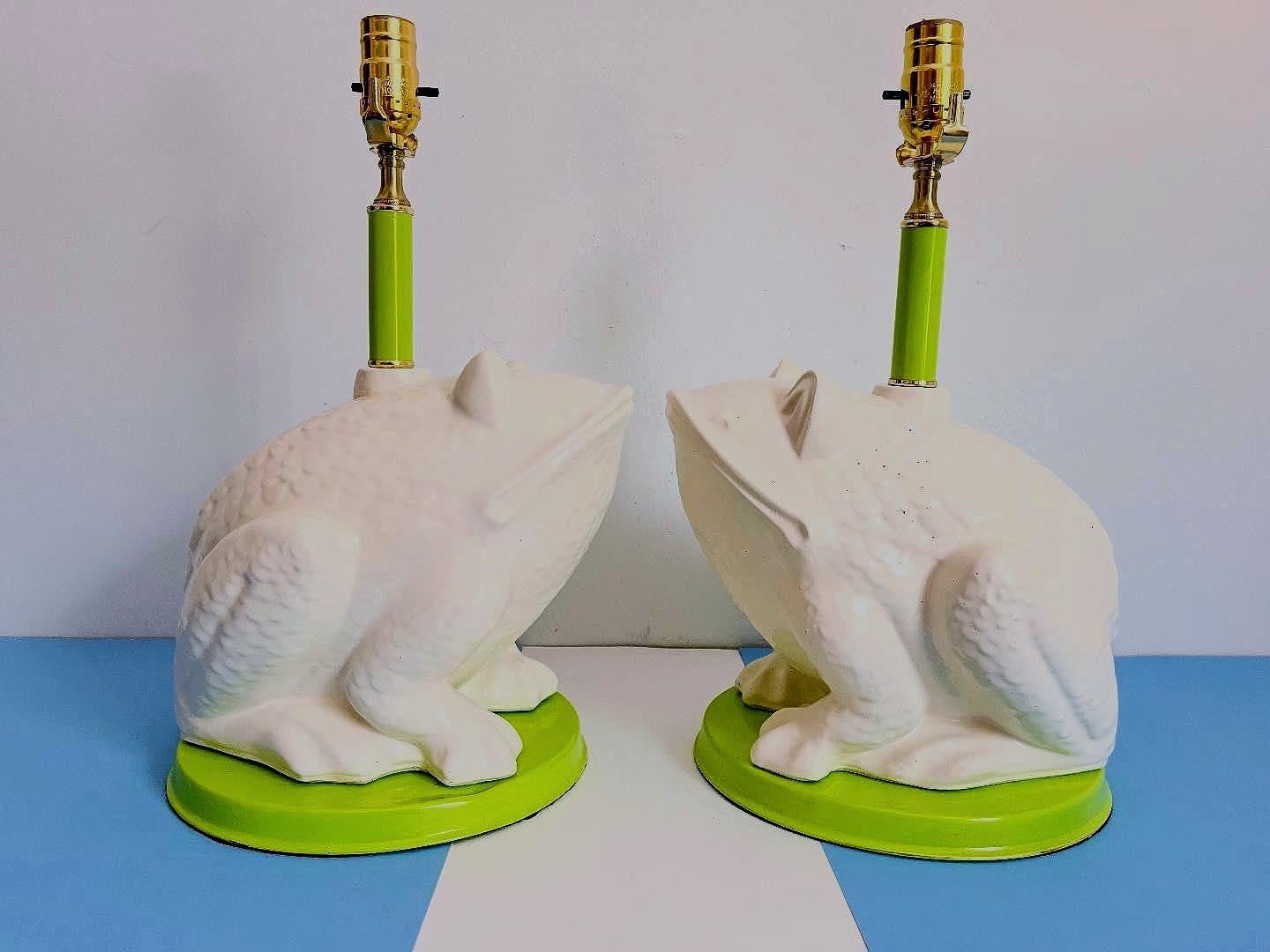 Huge happy pair of creamy white whimsical plaster frog lamps seated upright on lime green painted metal bases with adorable raised textured skin, bulging eyes, and webbed feet.