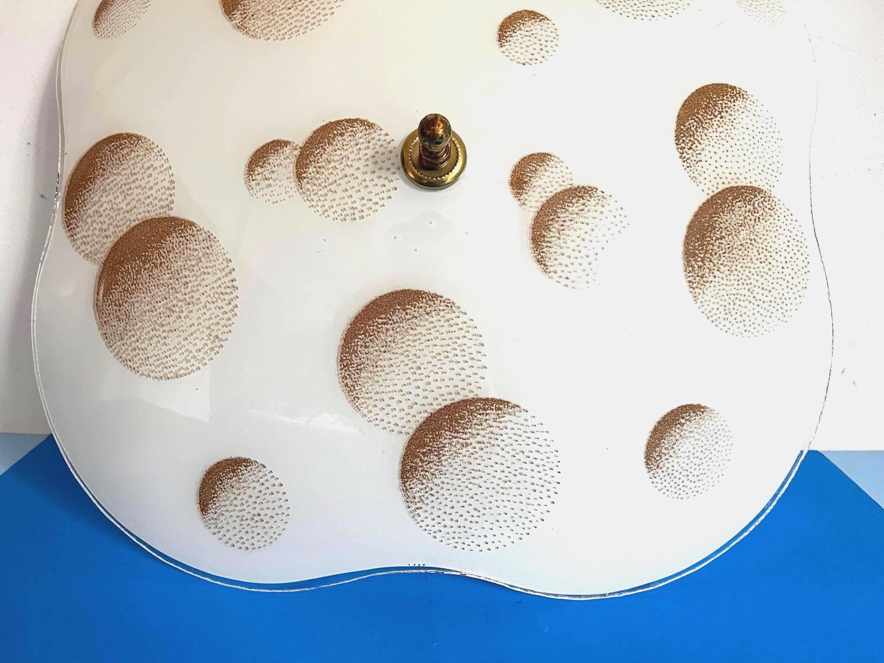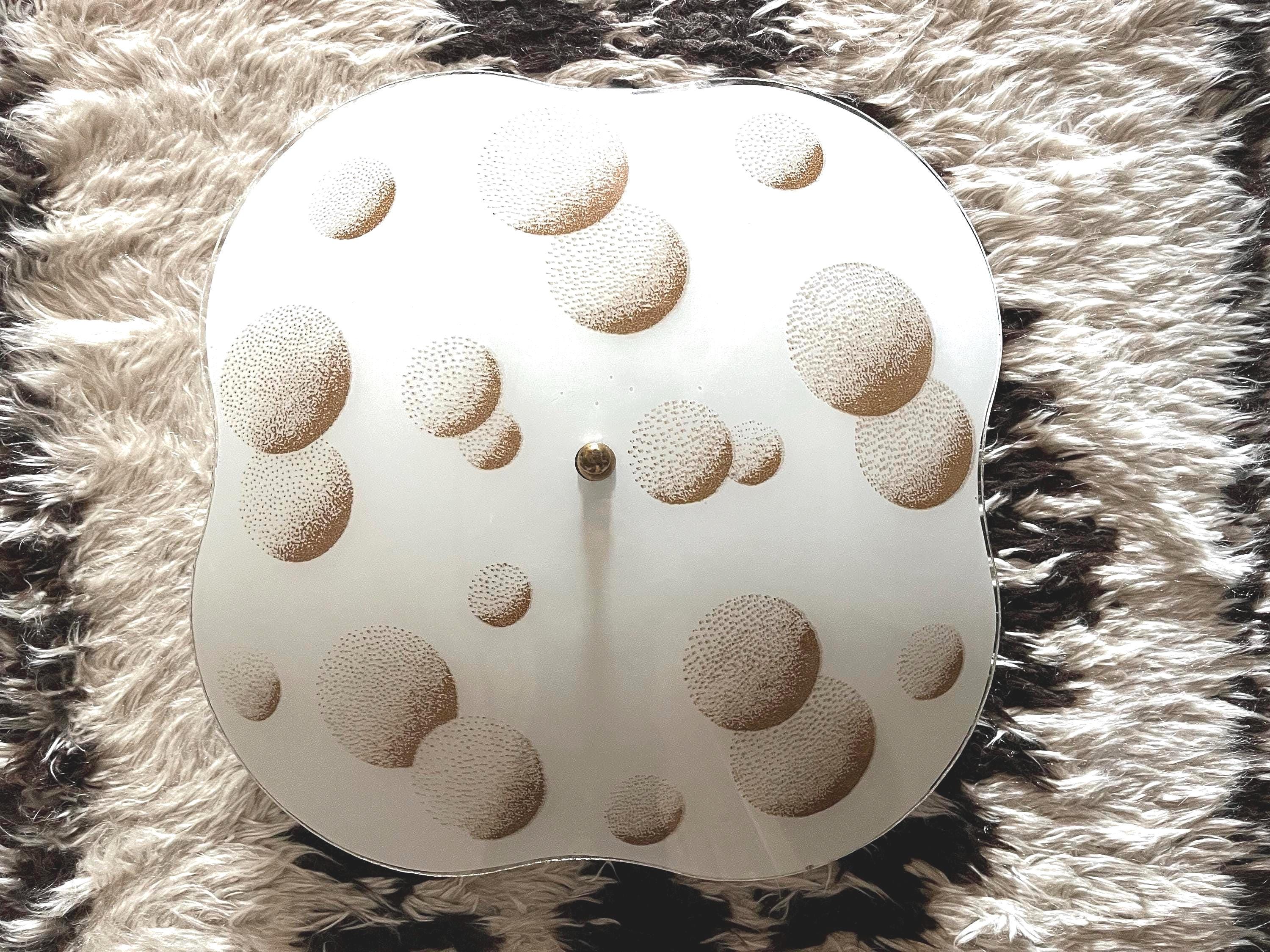 Magnificent large ceiling light of frosted glass in a rare clover shape with radiant raised chocolate moons, transparent border, and two lights.