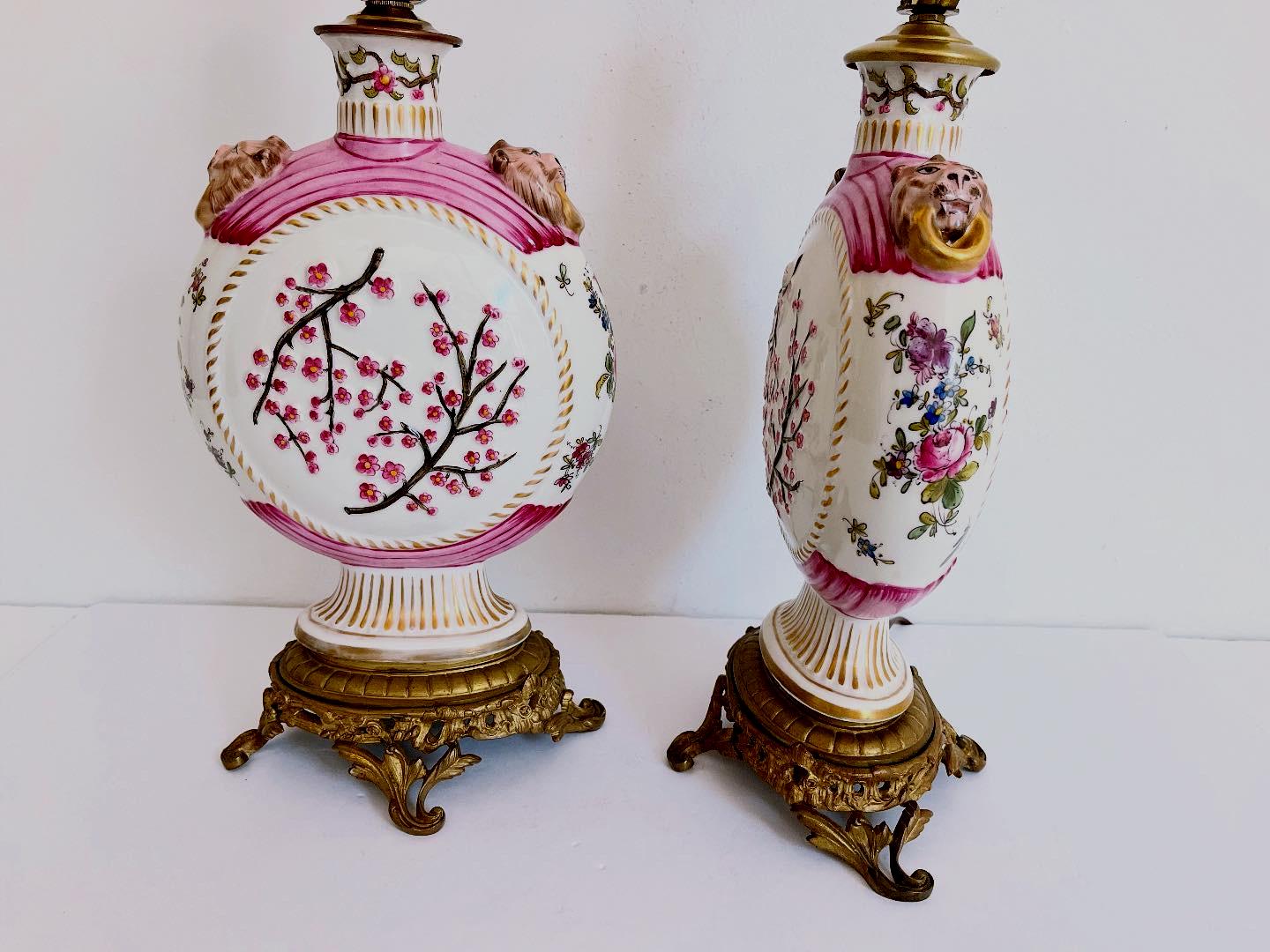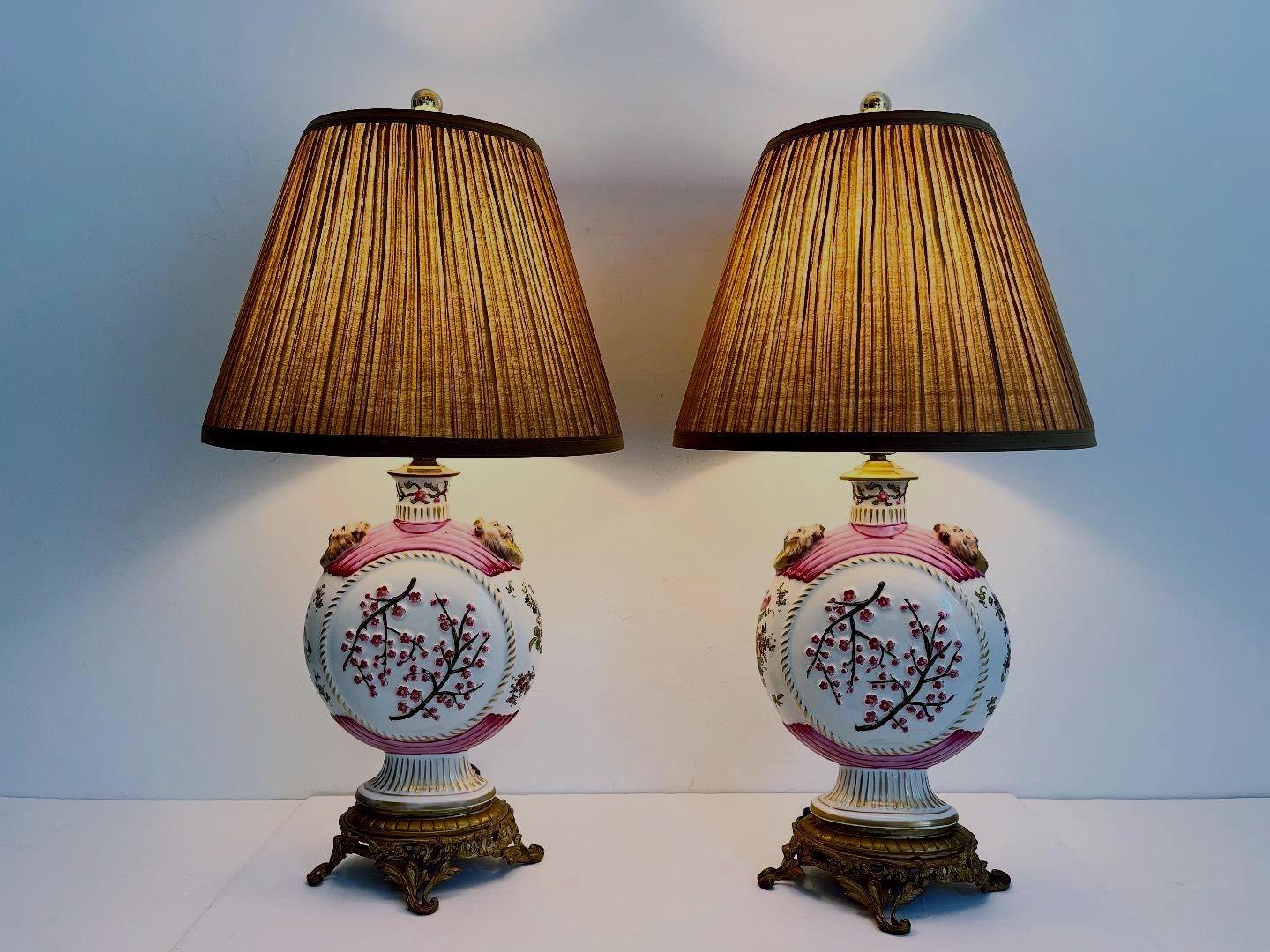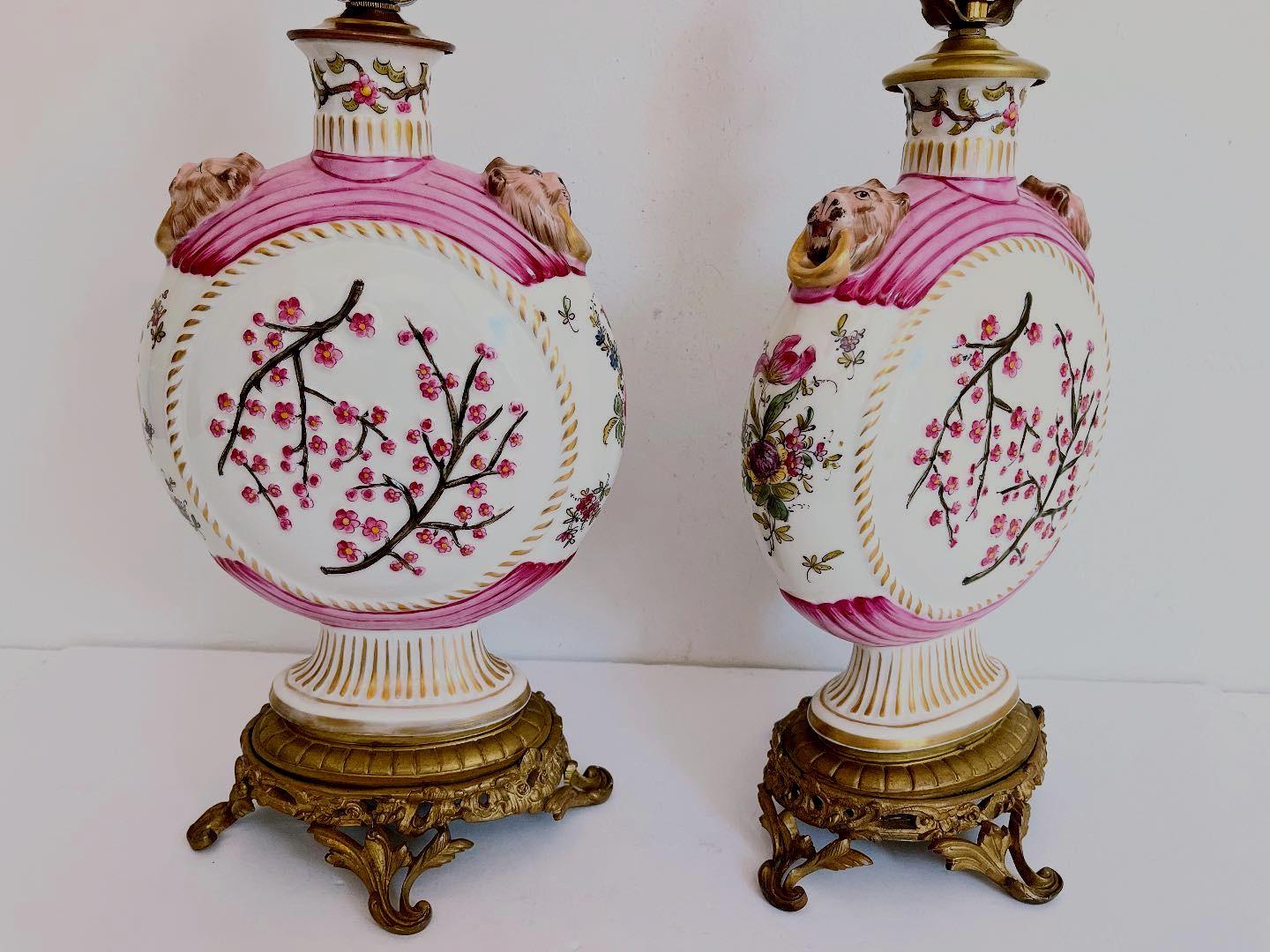 Stunning pair of glazed creamy white disc-shaped porcelain lamps hand painted with bright pink raised cherry blossom branches, rose bouquet borders, raised lion masks, and draped raised pink ribbon tops and bottoms with integrated striped oval bases all accented by 22K gold and set into ornate French footed ormolu bases.