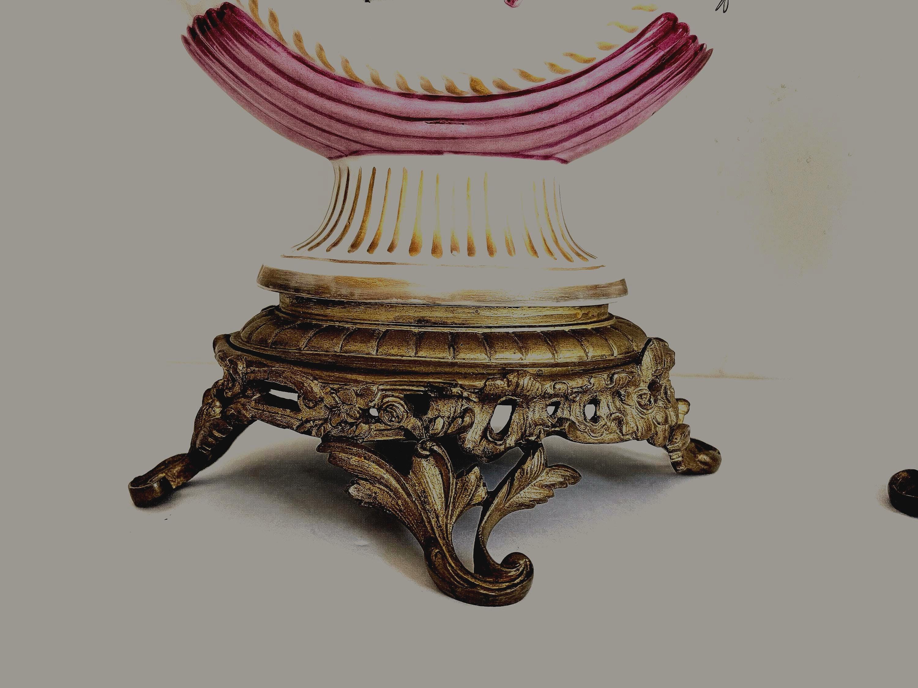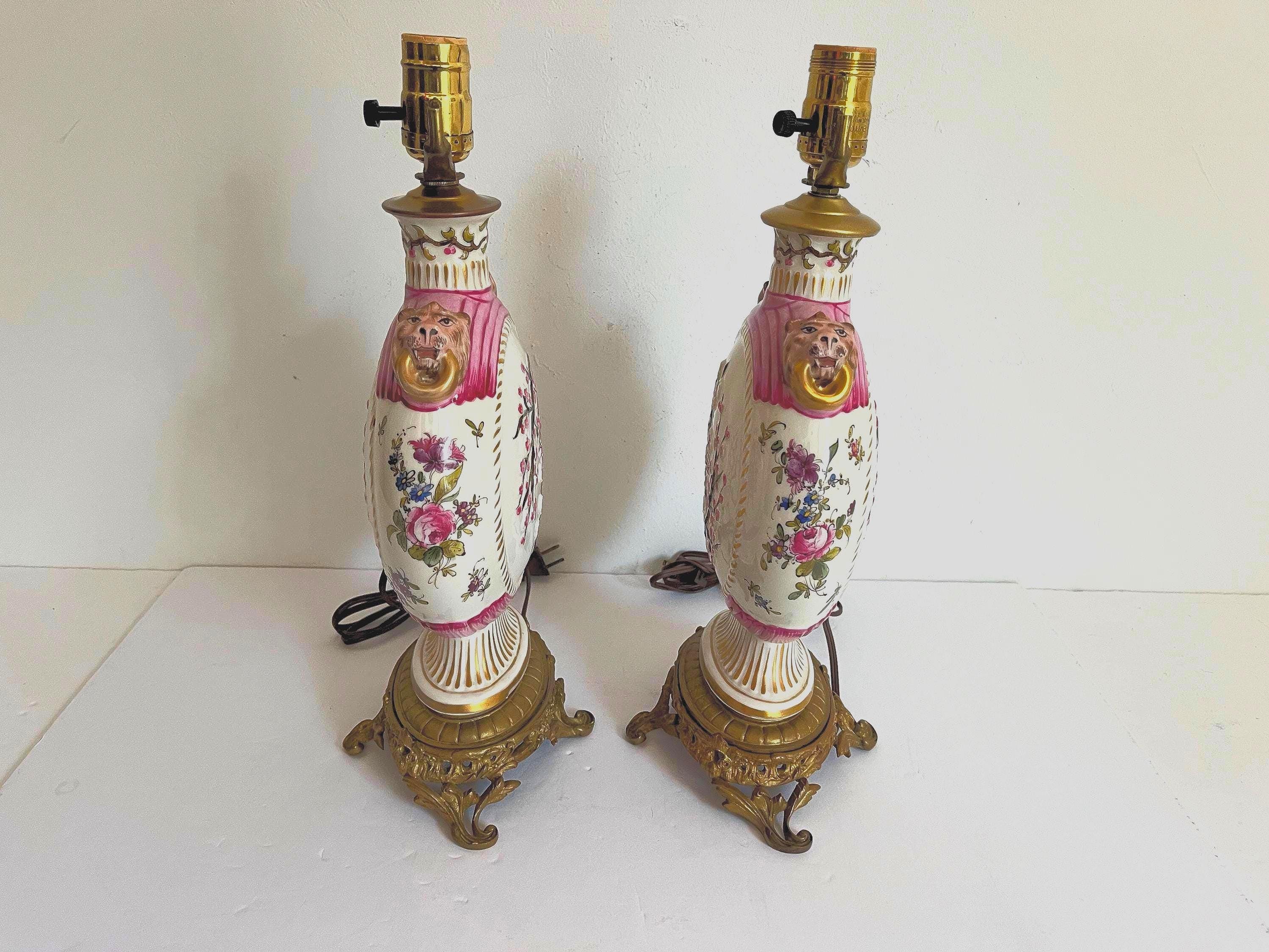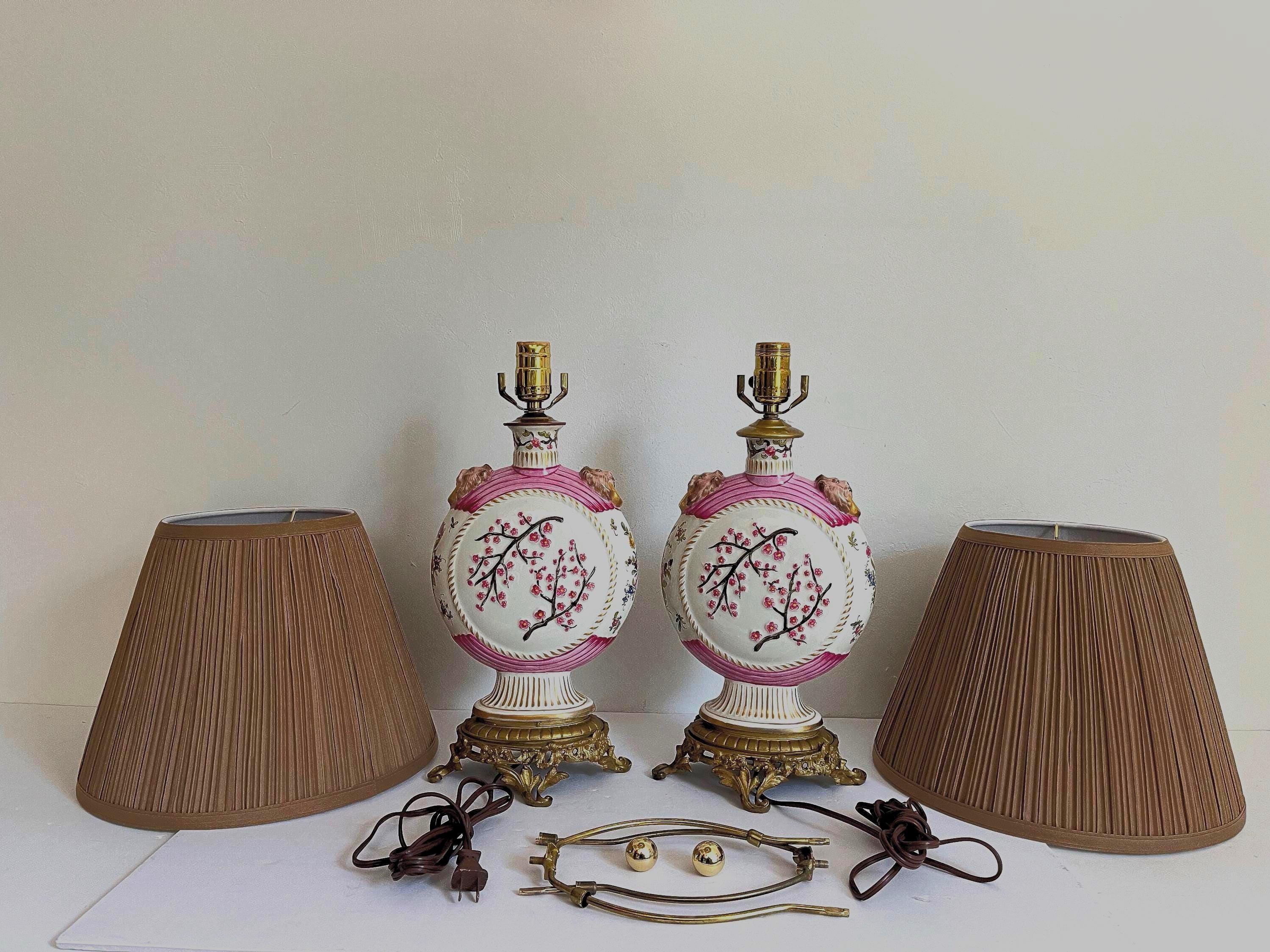 Stunning pair of glazed creamy white disc-shaped porcelain lamps hand painted with bright pink raised cherry blossom branches, rose bouquet borders, raised lion masks, and draped raised pink ribbon tops and bottoms with integrated striped oval bases all accented by 22K gold and set into ornate French footed ormolu bases.