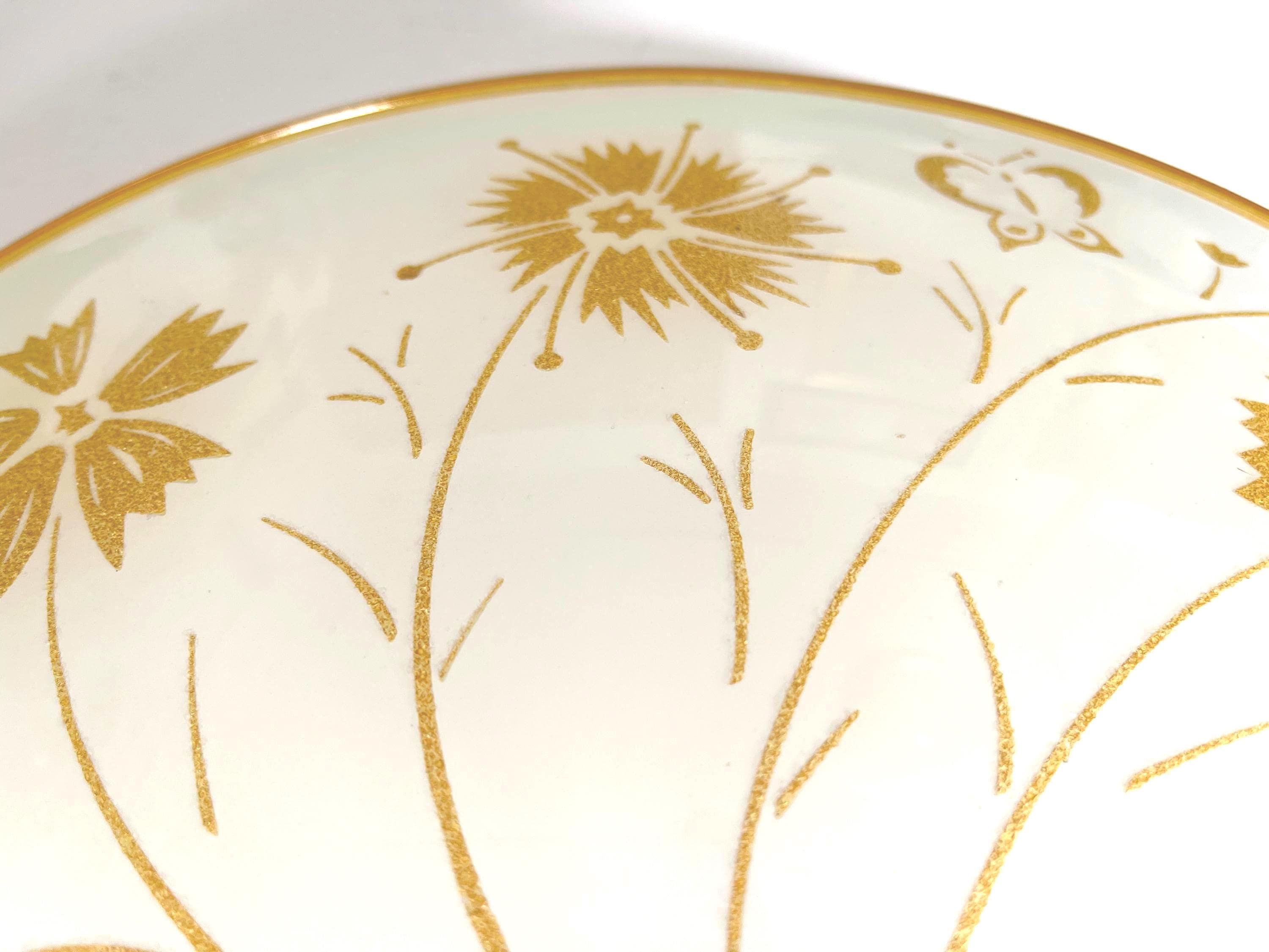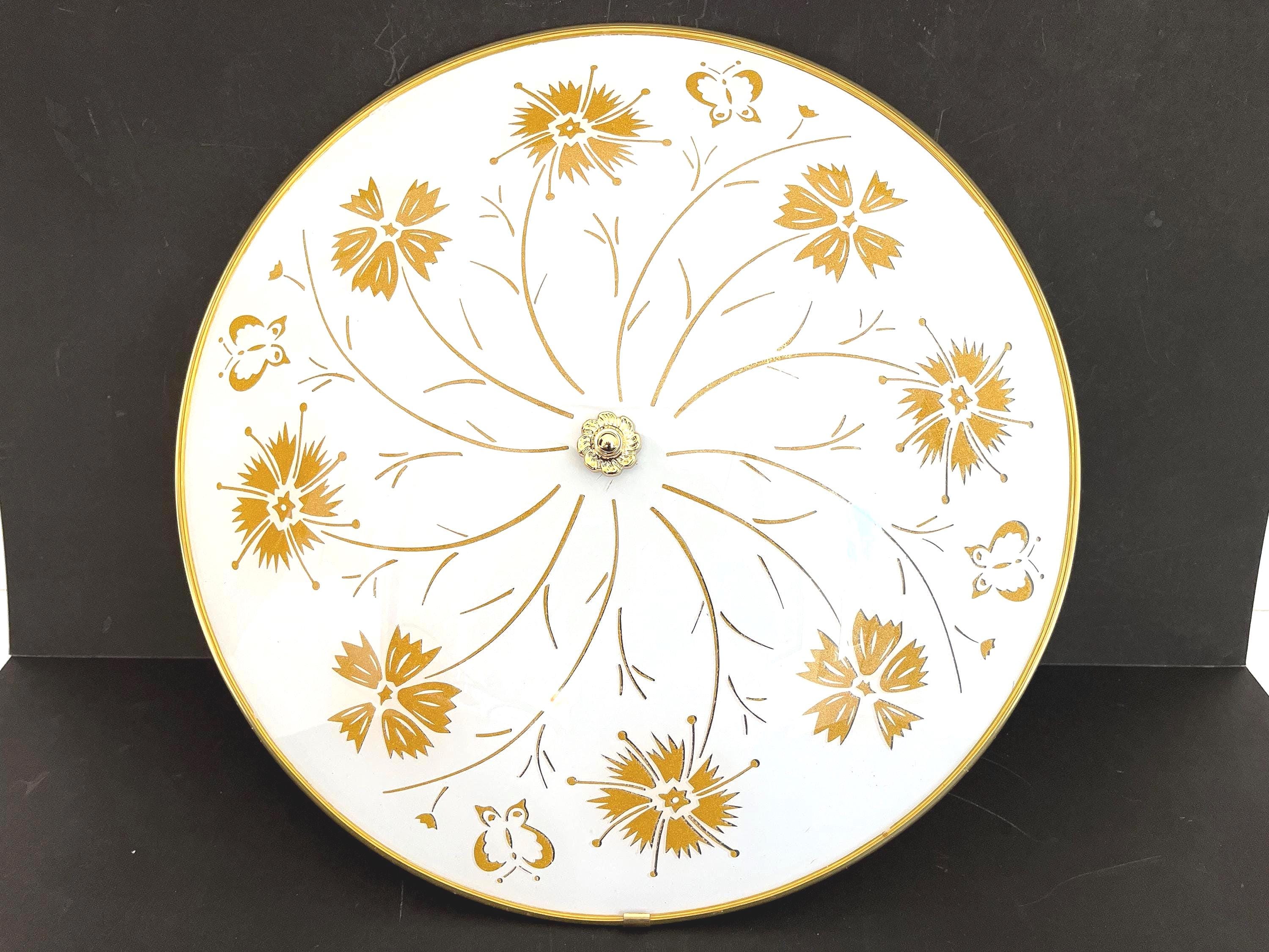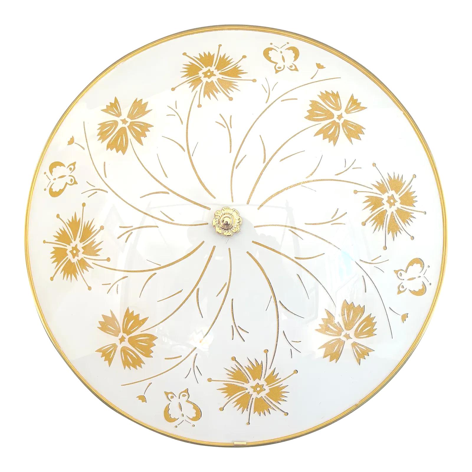 Lovely mid century frosted glass ceiling light with radiant central sunburst of flowers accented by fluttering gold butterflies, gold liner, and two lights. Underside of glass has dimensional gold beading which glows and adds movement.