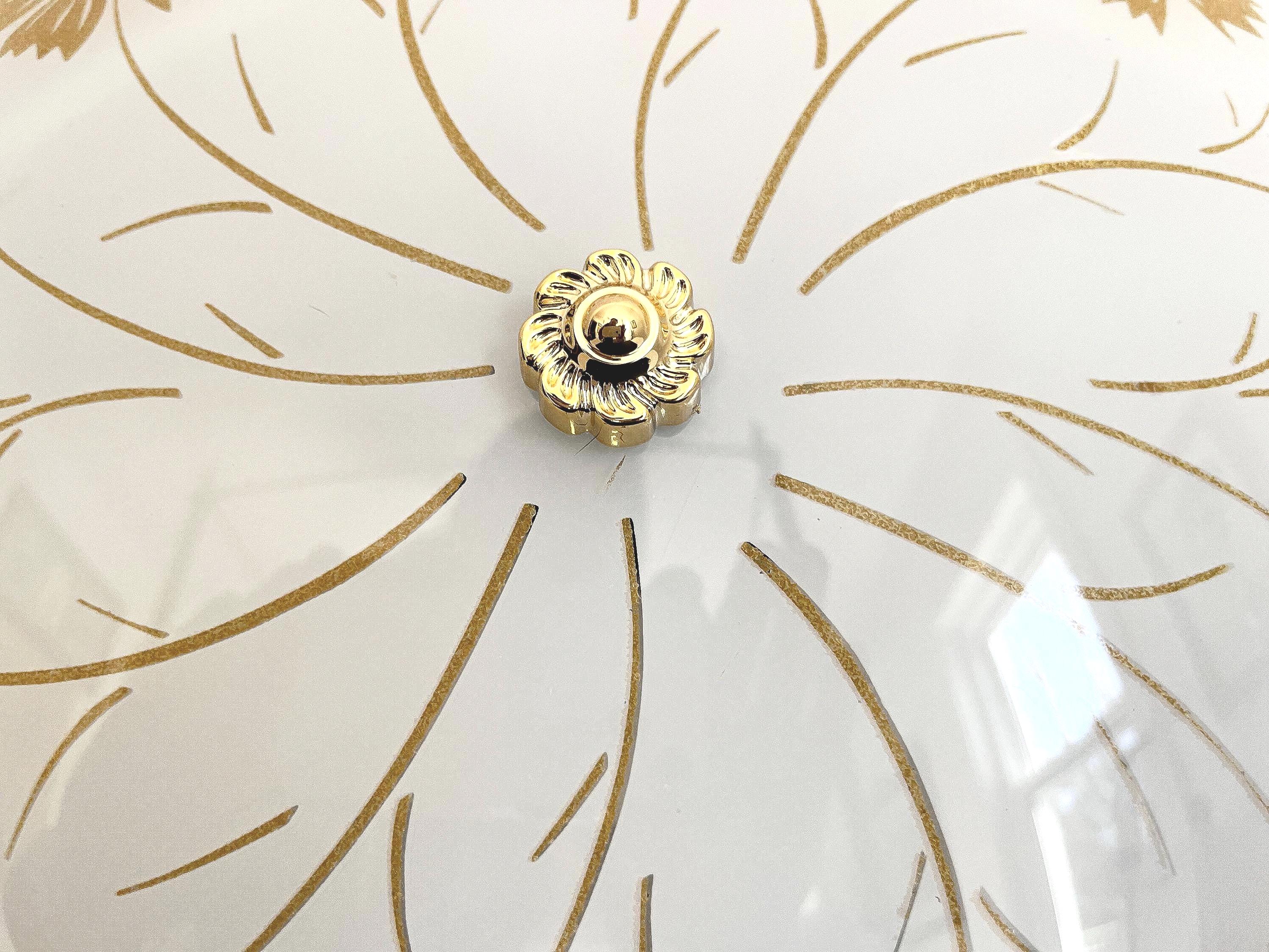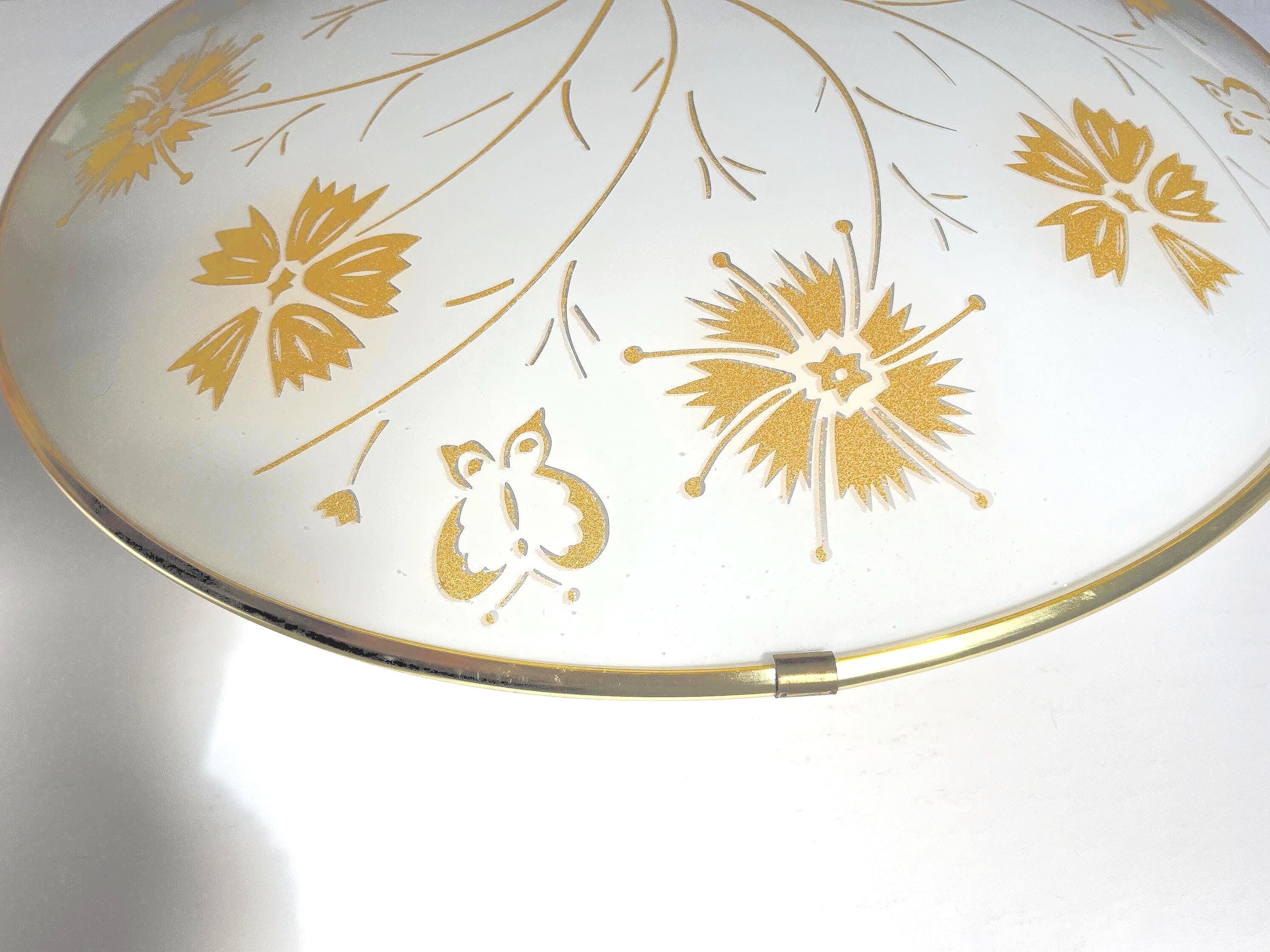 Lovely mid century frosted glass ceiling light featuring a radiant centerpiece of flowers accented by gold butterflies and gold liner with dimensional gold beaded underside and two lights.