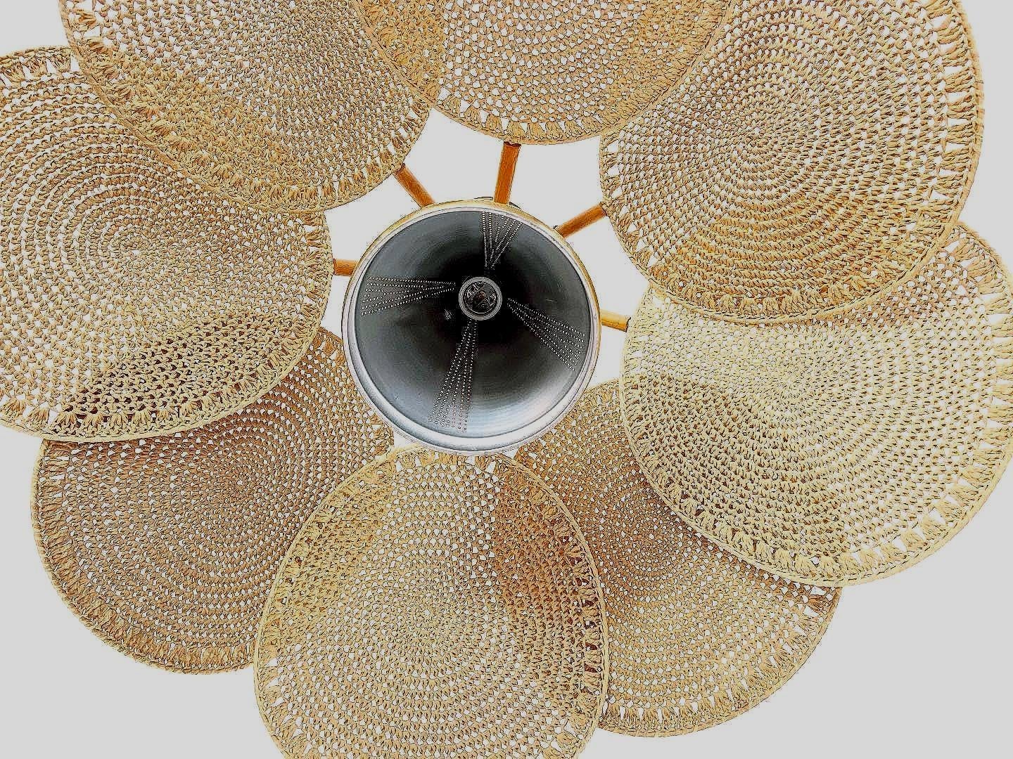 In amazing VINTAGE condition with patina, one palm leaf has some fraying at the top, and natural color, size variations to the wicker shades.