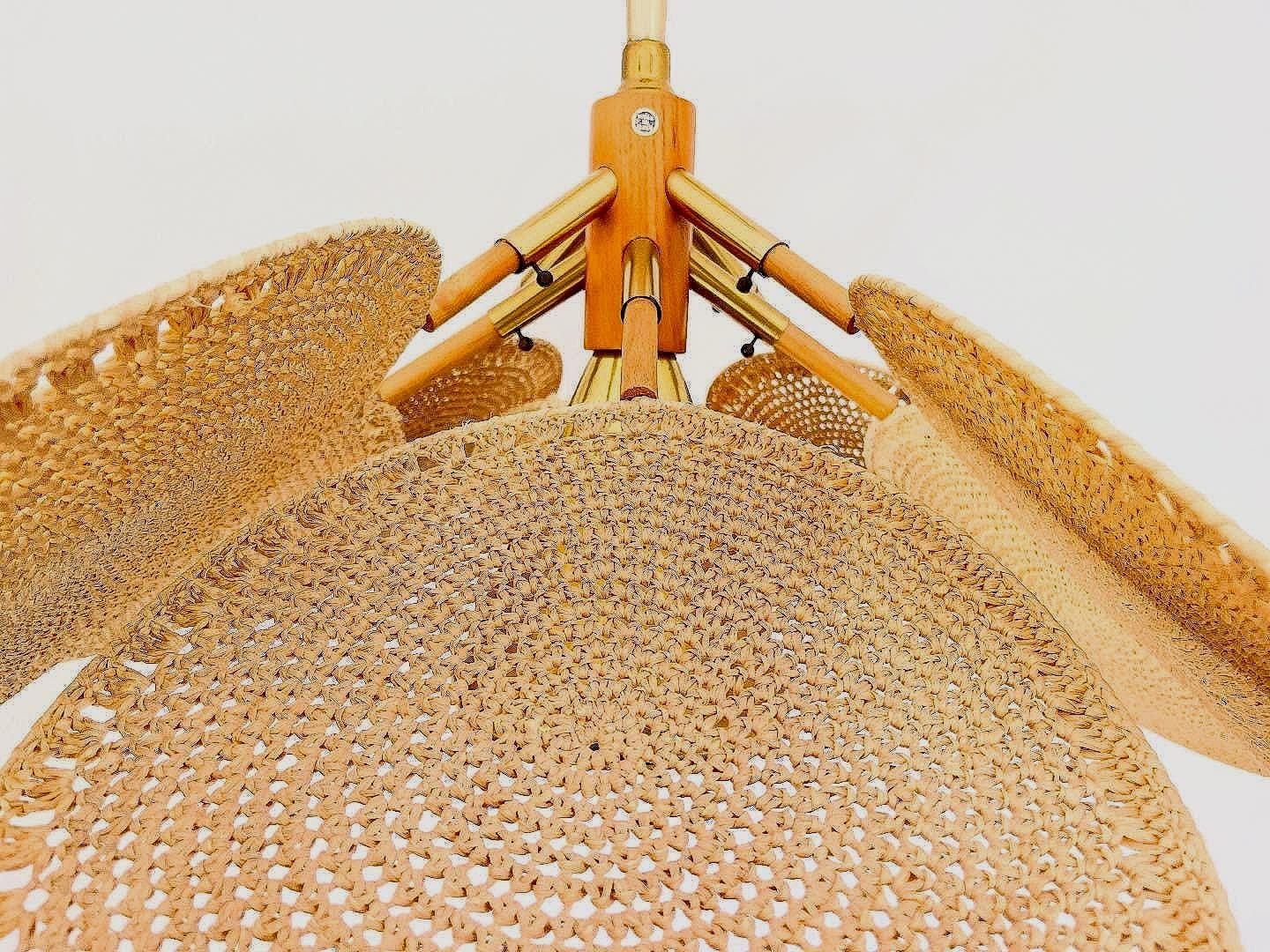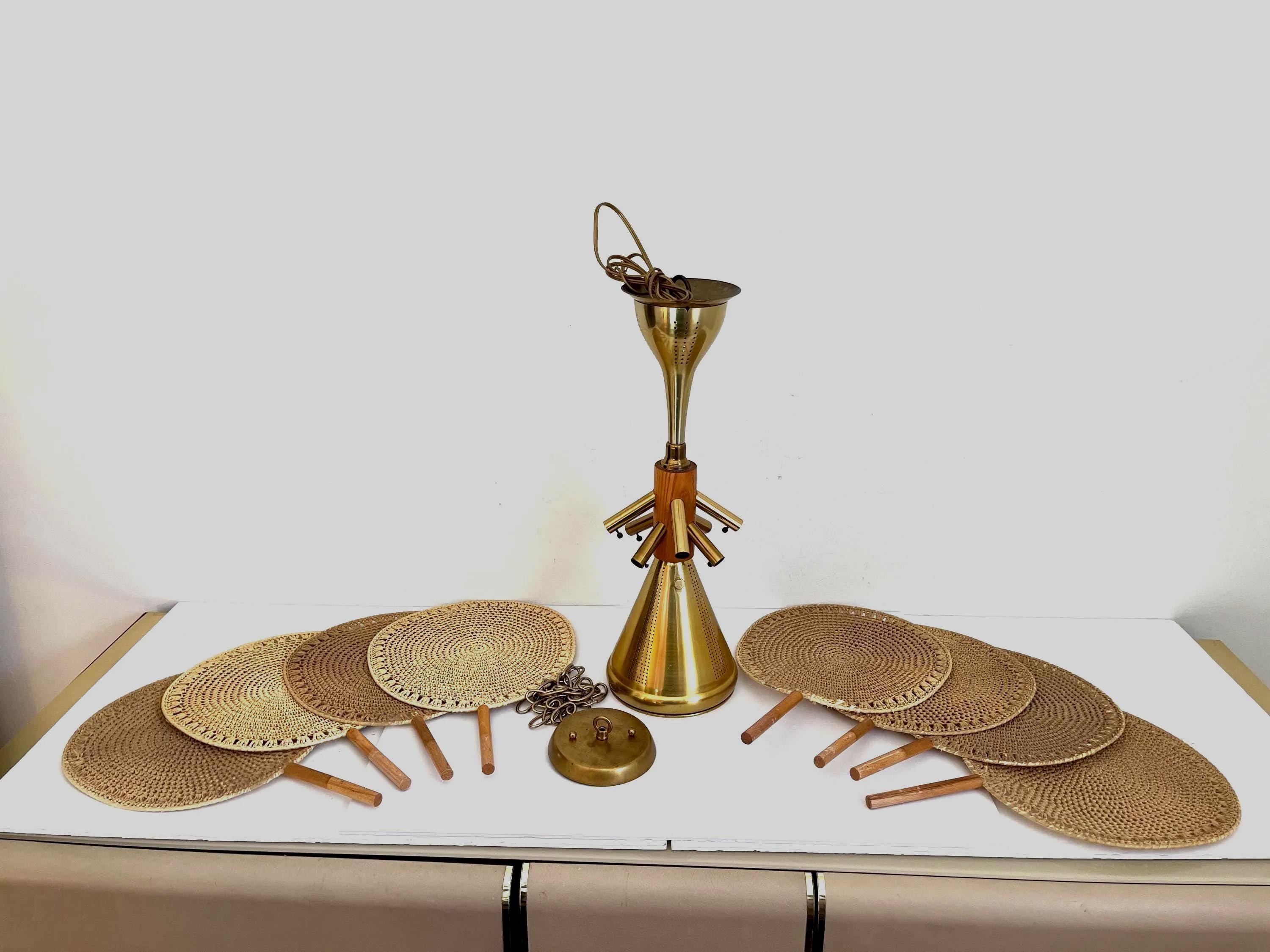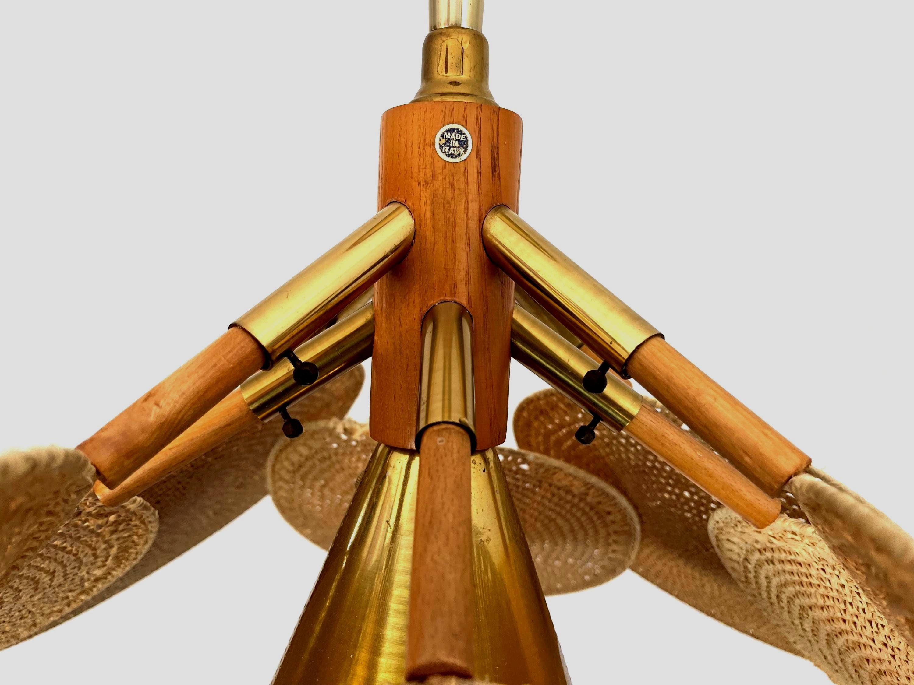 Incredible light and airy Italian palm light featuring a wood frame topped with a perforated gold metal cone finial, eight tiered gold metal sputnik style arms, and eight rounded wicker palm leaf shades with central perforated gold metal cone and single light. Palm leaves are hand woven with a natural straw-colored fiber in a circular pattern on metal frames and are adjustable from the frame with inset screws. Hand crafted and designed in the style of Raymor with Made in Italy label.