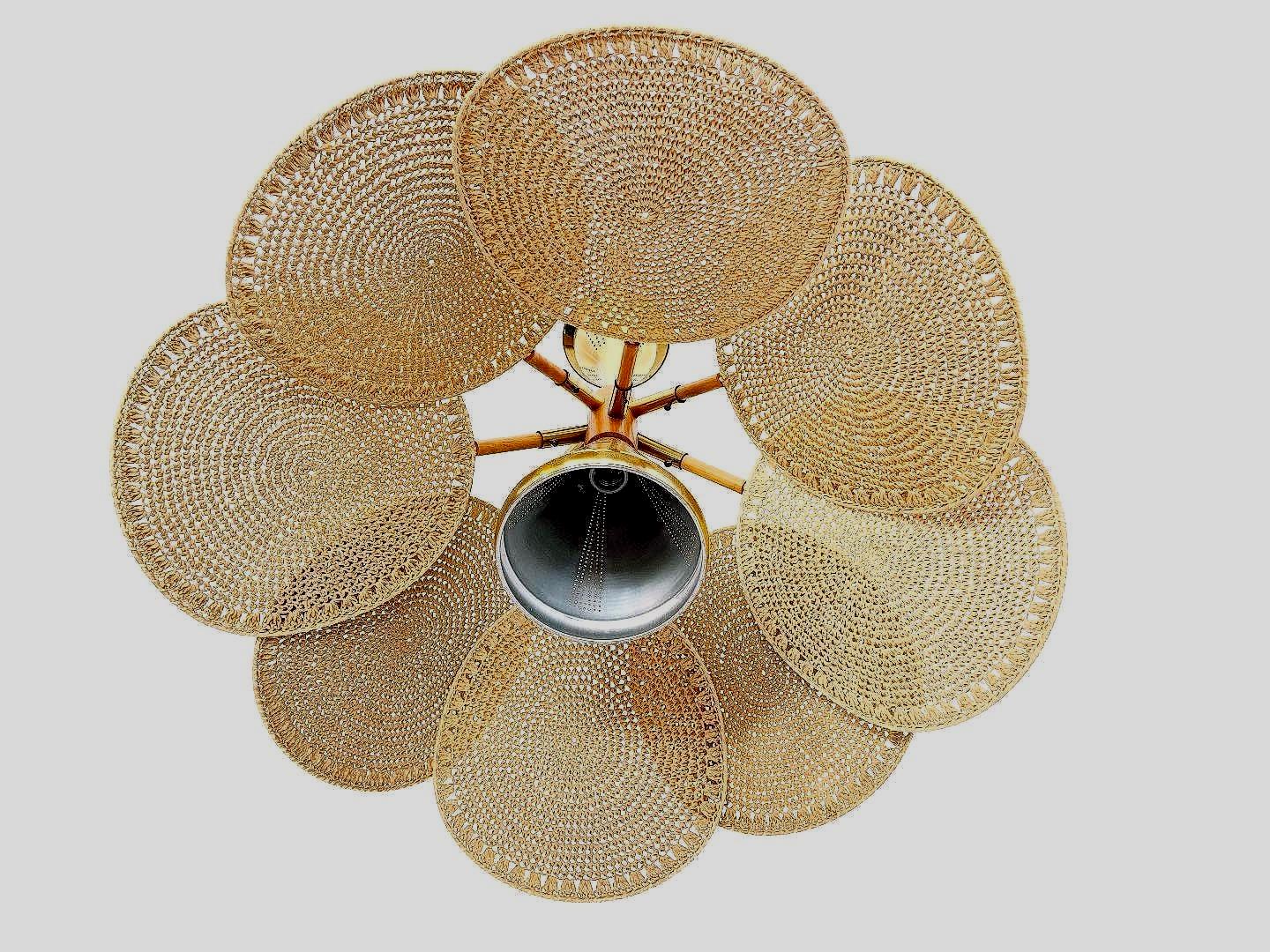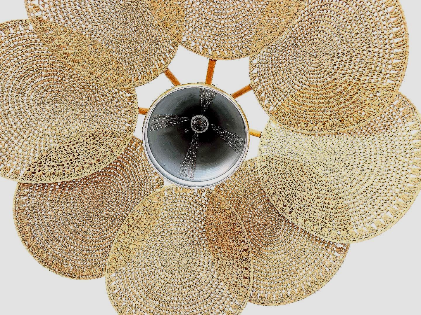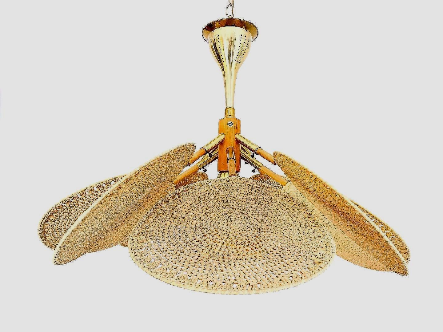 Incredible light and airy Italian palm light featuring a wood frame topped with a perforated gold metal cone finial, eight tiered gold metal sputnik style arms, and eight rounded wicker palm leaf shades with central perforated gold metal cone and single light. Palm leaves are hand woven with a natural straw-colored fiber in a circular pattern on metal frames and are adjustable from the frame with inset screws. Hand crafted and designed in the style of Raymor with Made in Italy label.