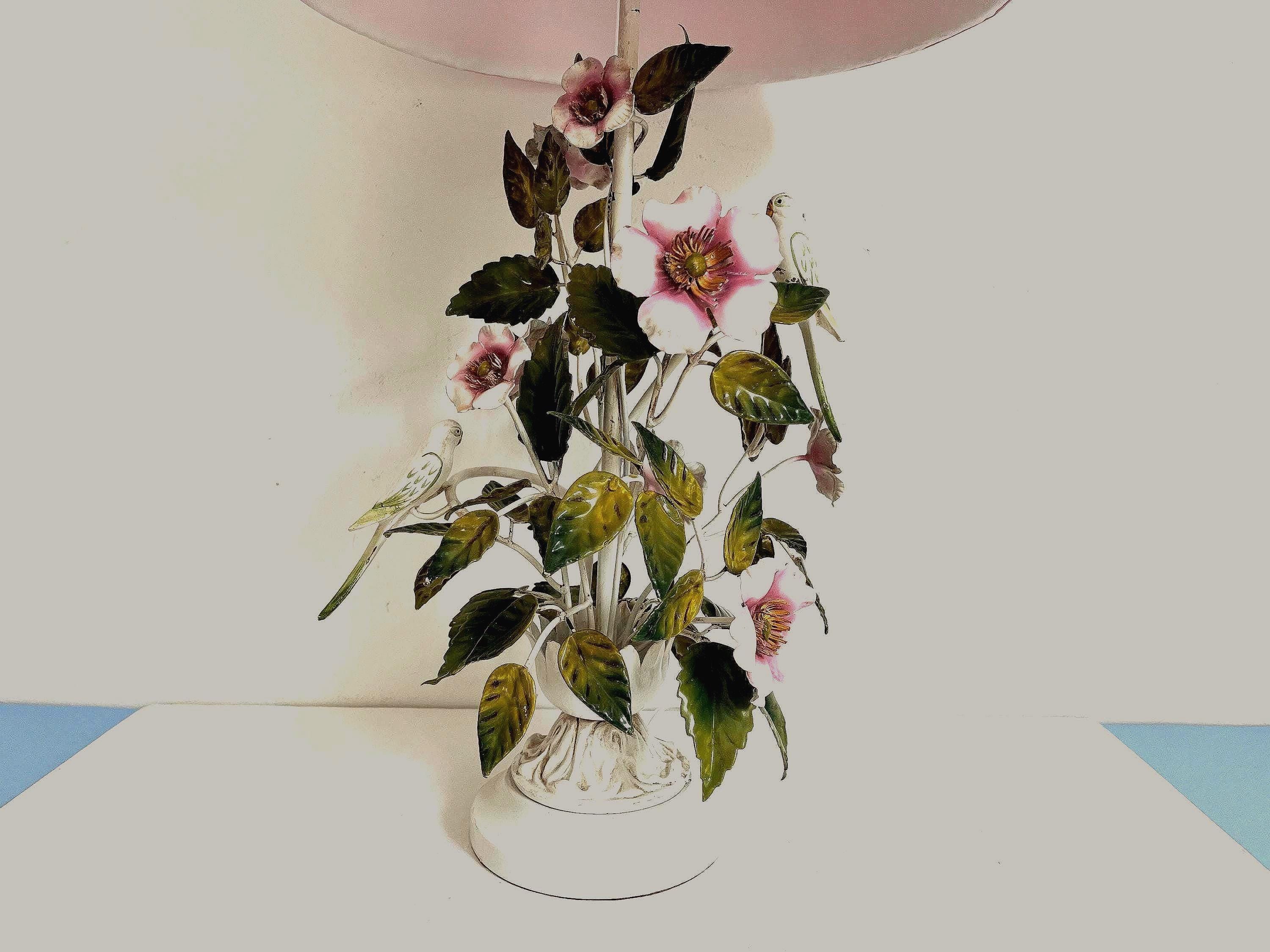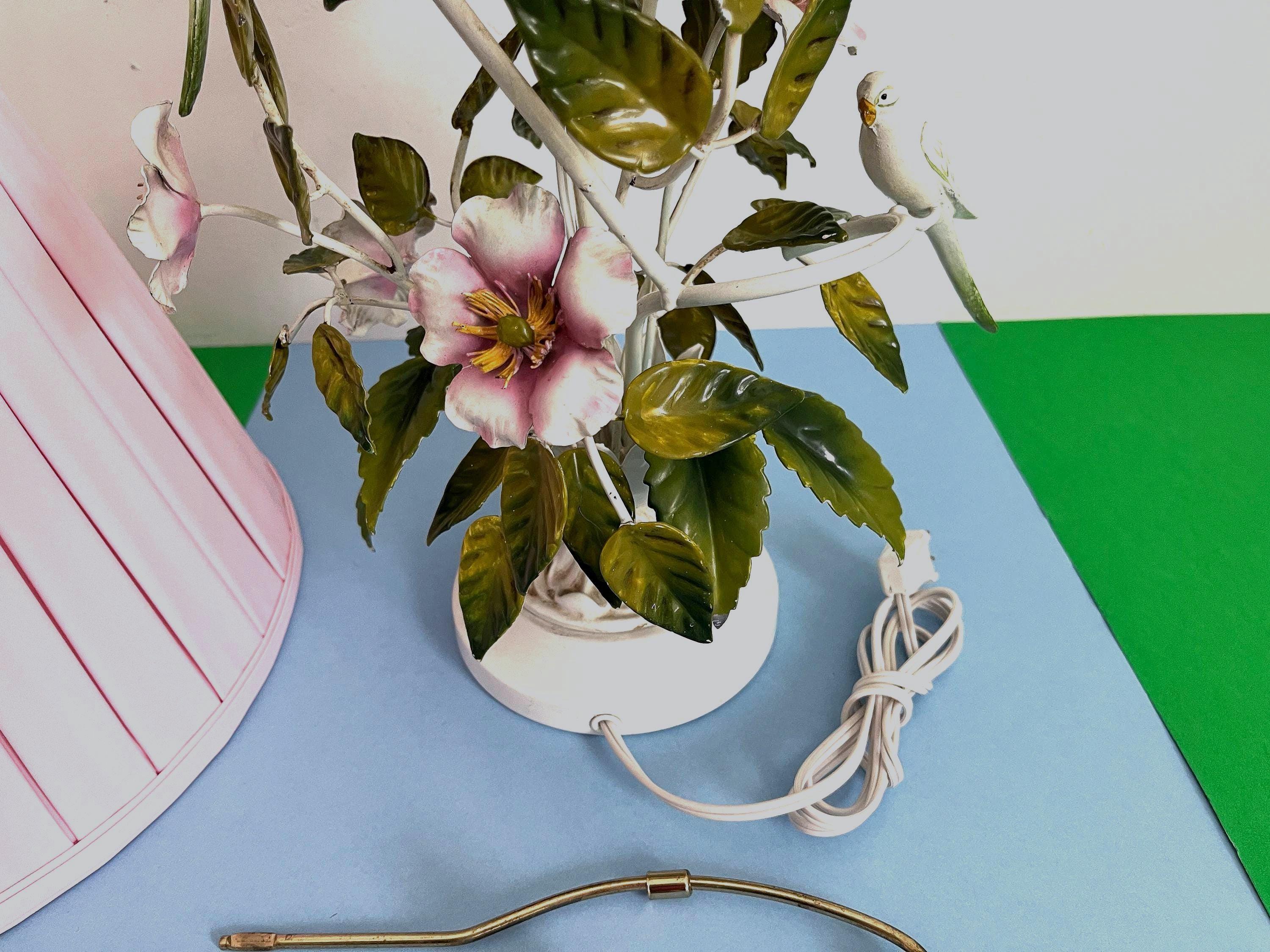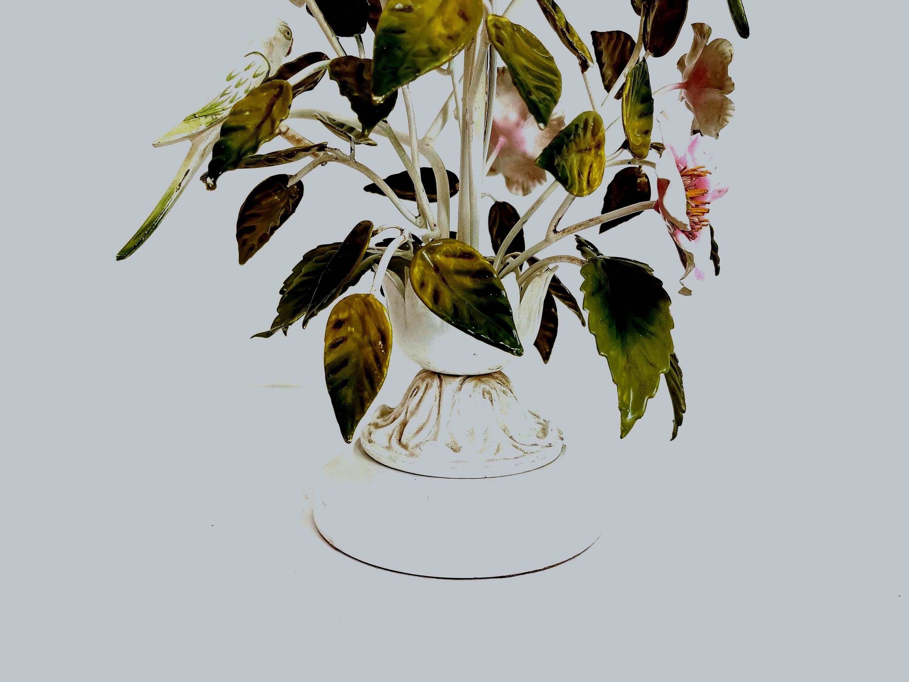 Lovely Italian tole topiary lamp hand painted with pink peonies, green leaves, and a pair of perky green and white parakeets in a scalloped pot set into a tiered metal base. Retains Made in Italy tag.