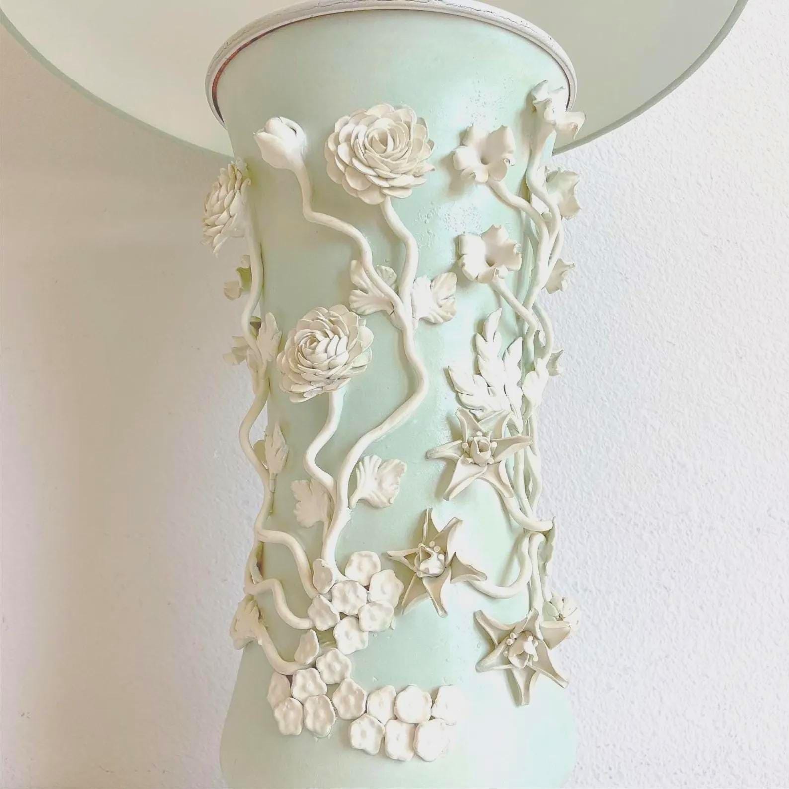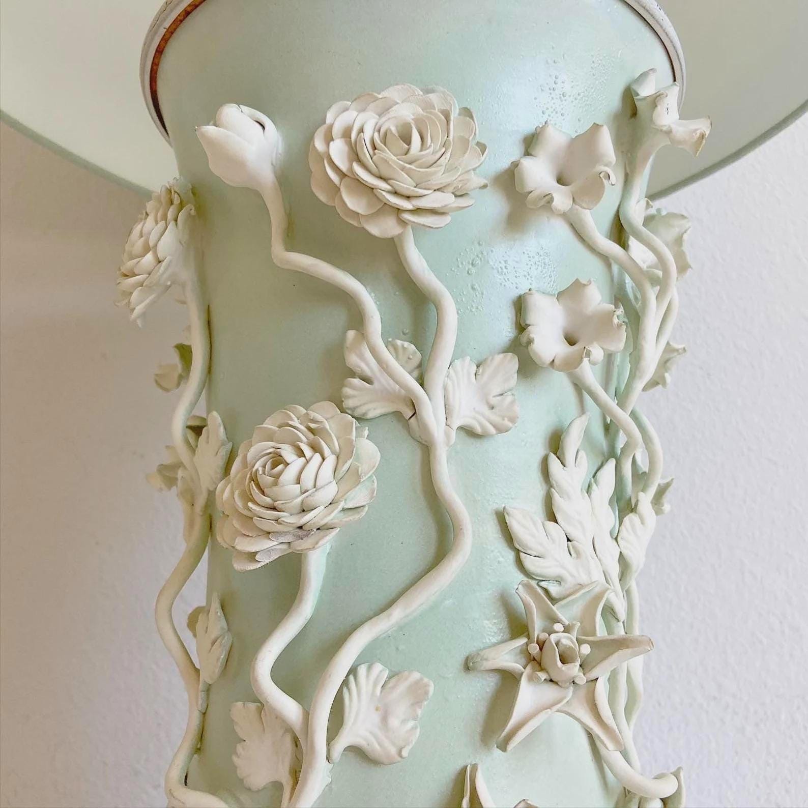 Gorgeous big Italian ceramic vase lamp hand glazed in matte sea foam green with applied creamy white flowers and vines finished on all sides with ringed metal top on a round wood base. Marked Made in Italy.