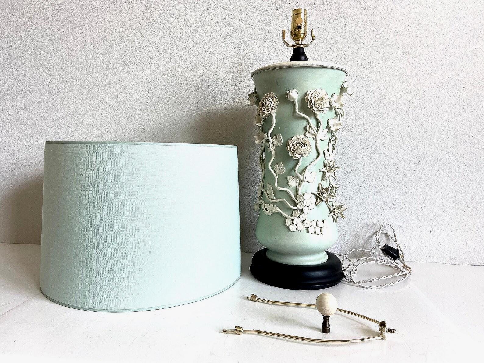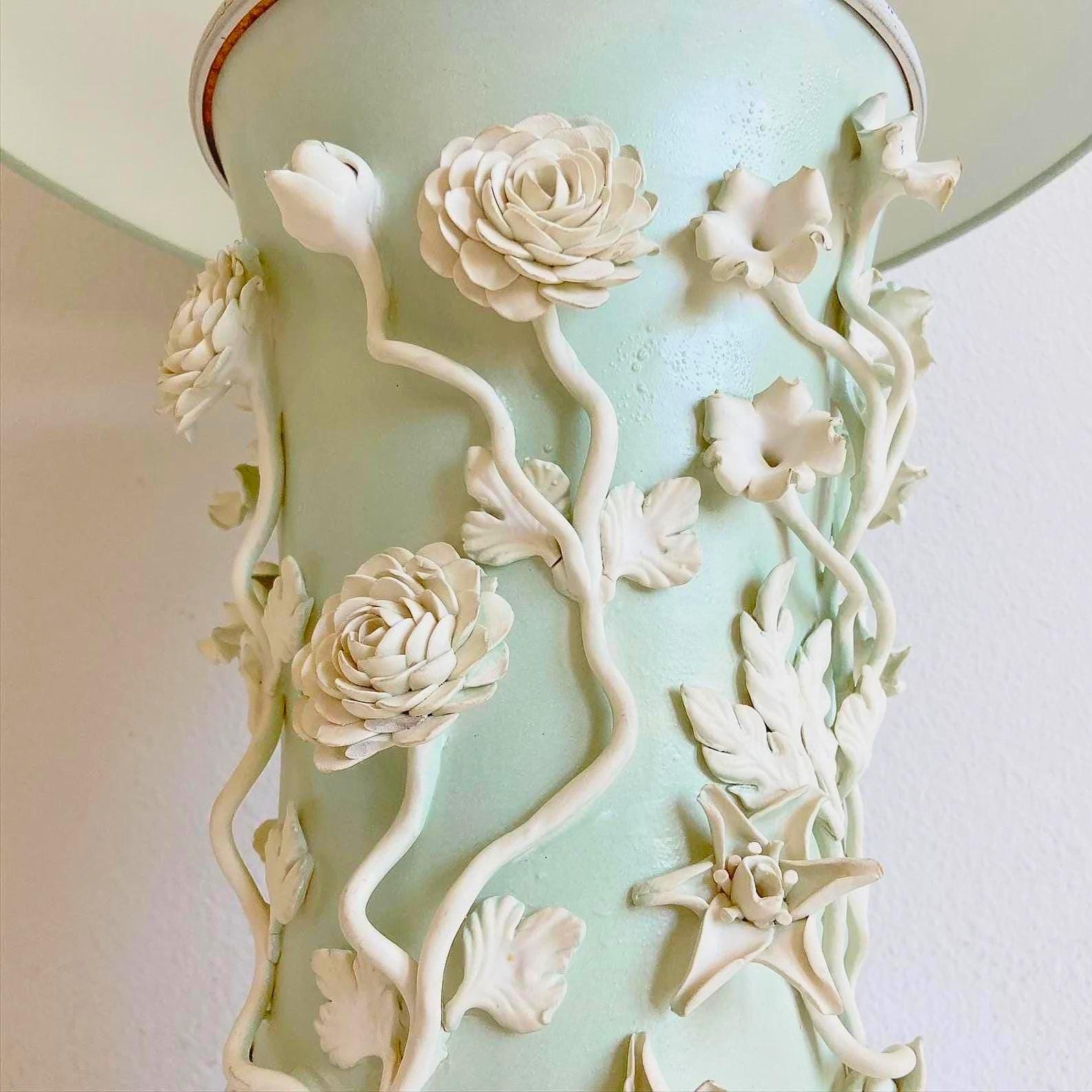 Gorgeous big Italian ceramic vase lamp hand glazed in matte sea foam green with applied creamy white flowers and vines finished on all sides with ringed metal top on a round wood base. Marked Made in Italy.