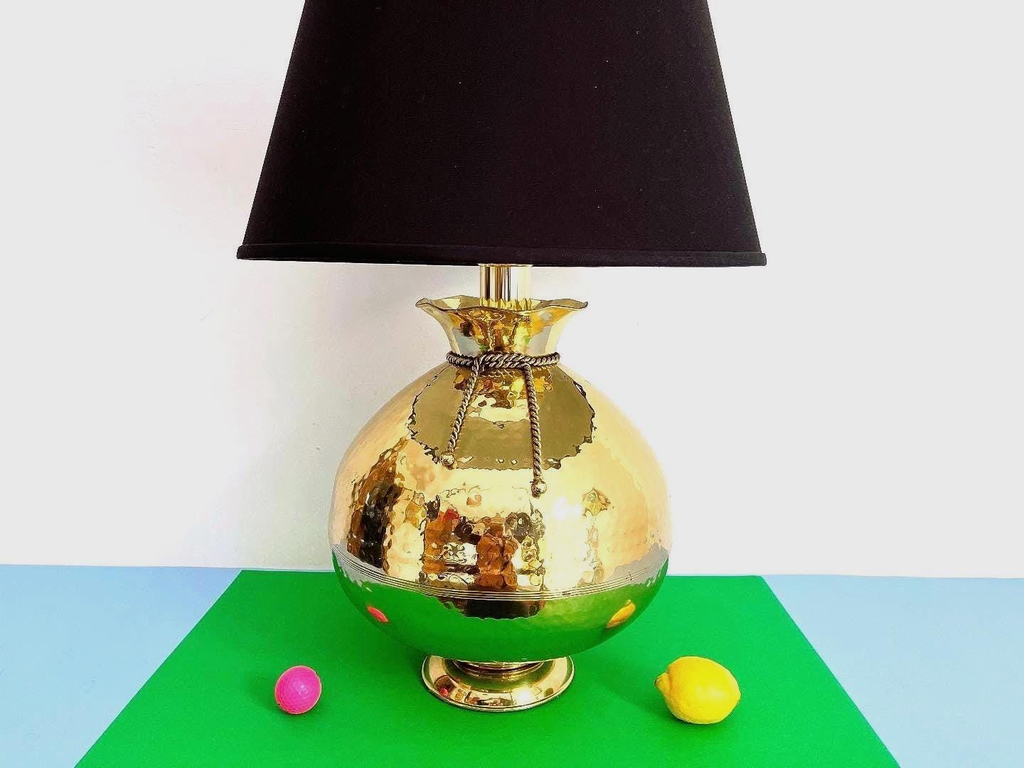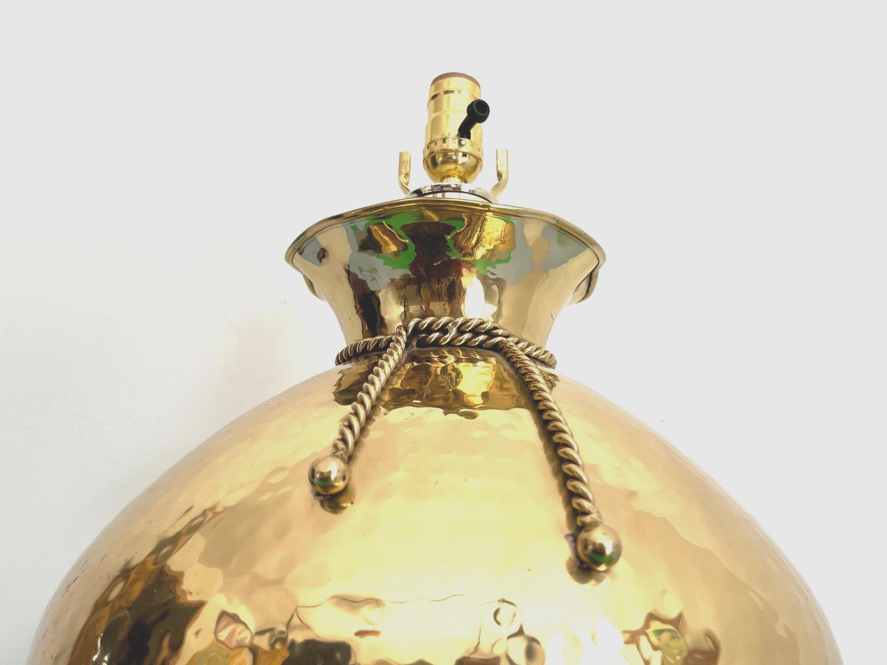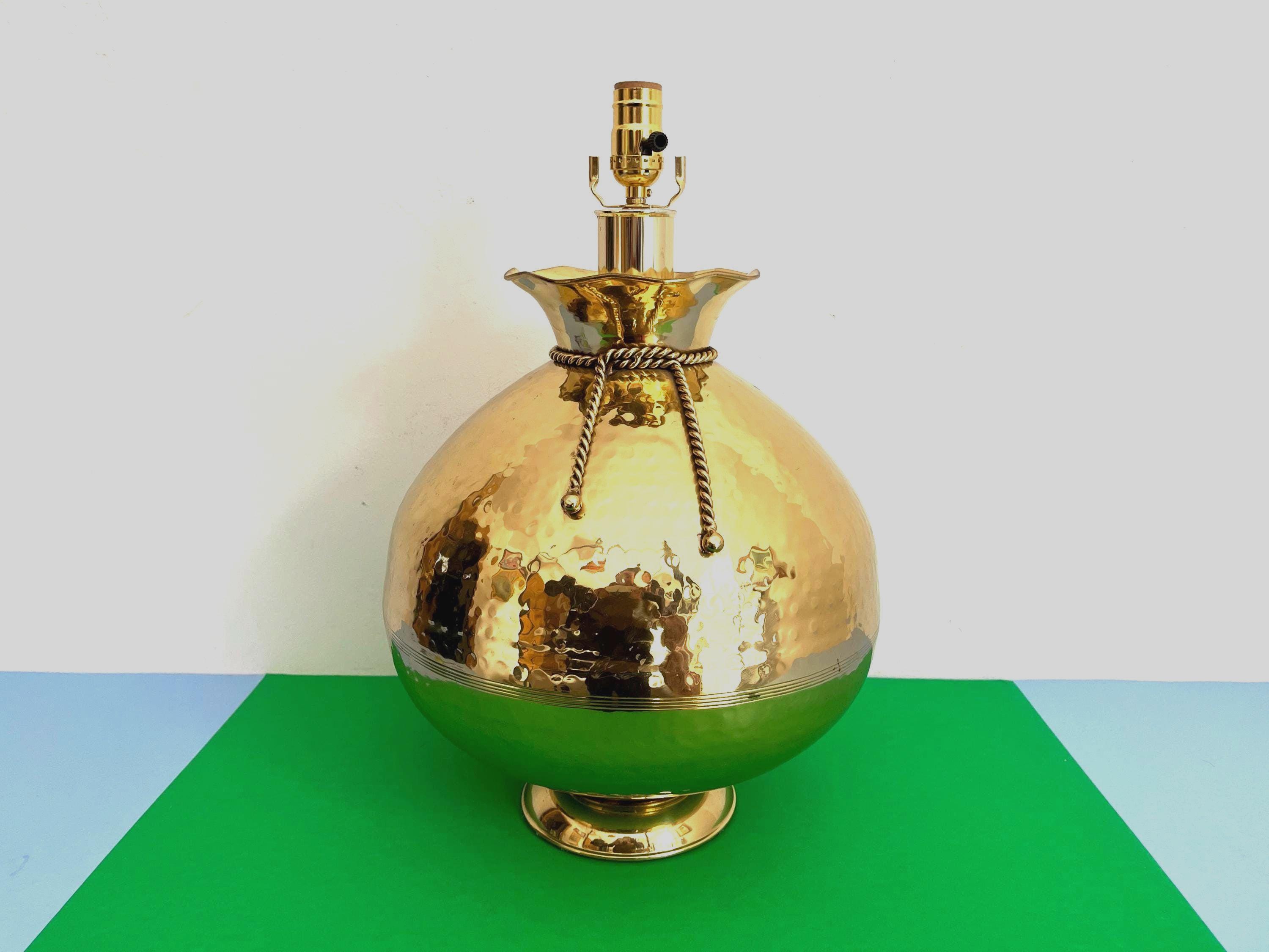 Huge hammered brass lamp from the seventies in the shape of a cinched bag with scored center, applied rope style sash, and ruffled top. Marked: solid brass, Korea.
