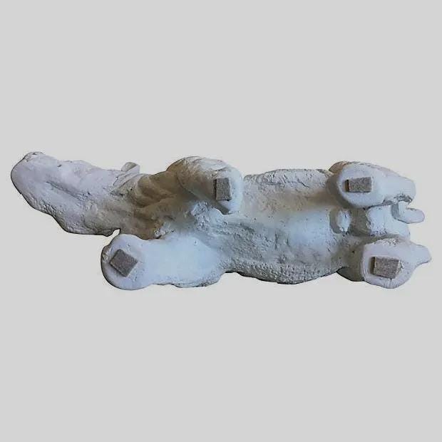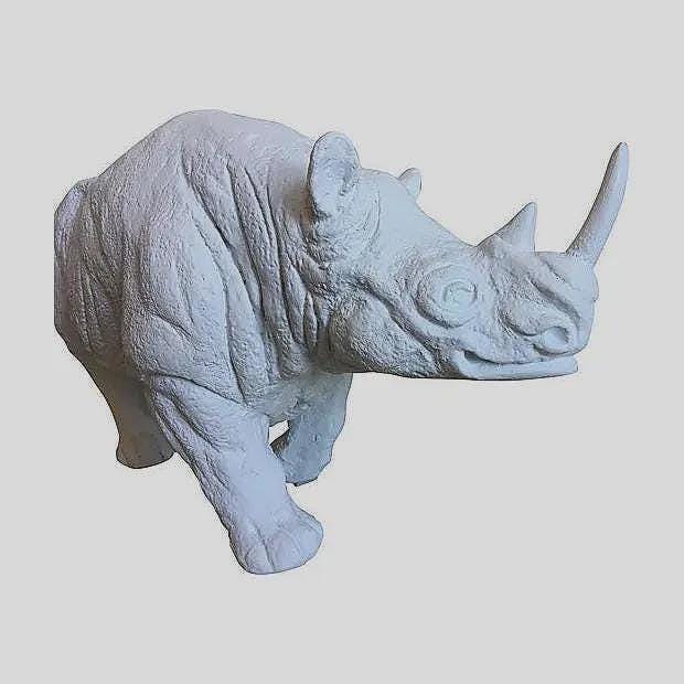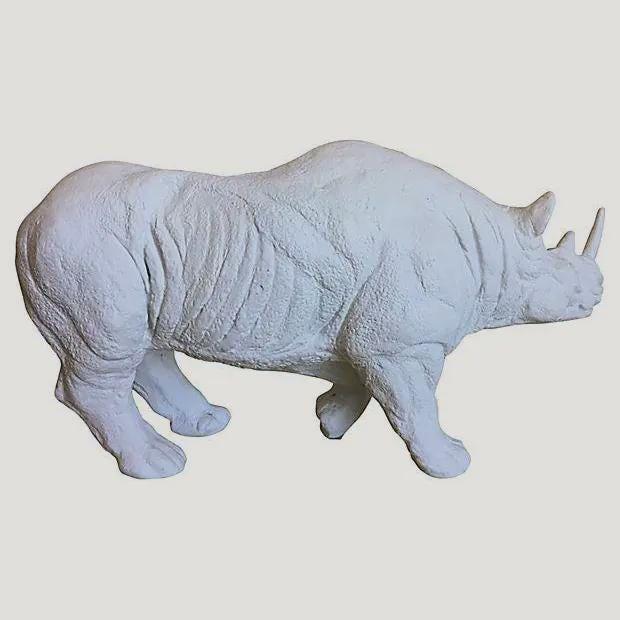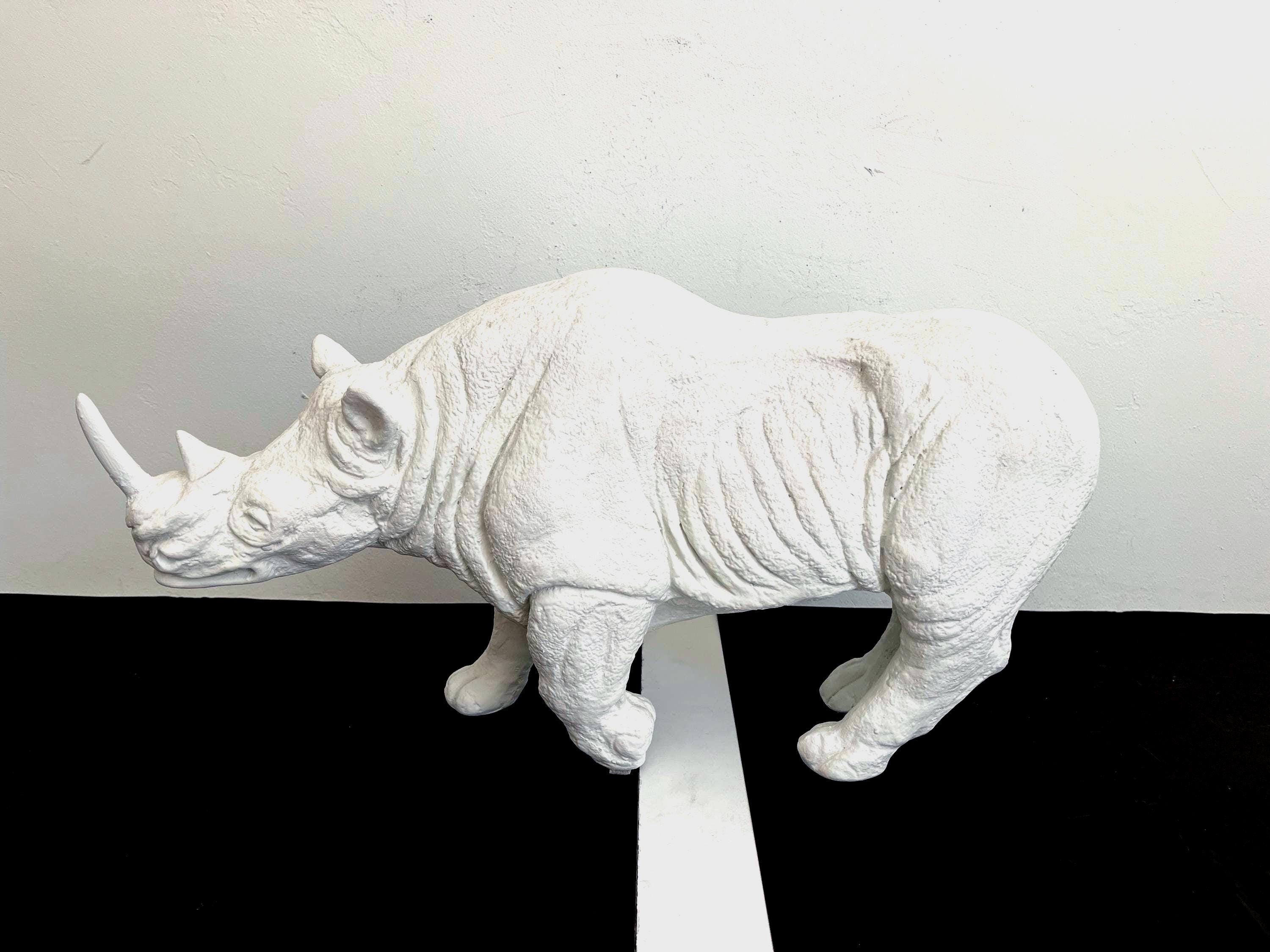 Huge modern plaster sculpture of a white rhinoceros in walking pose with lifelike incised detailing in a matte white finish. Heavy piece at twenty pounds with as found pads under feet.