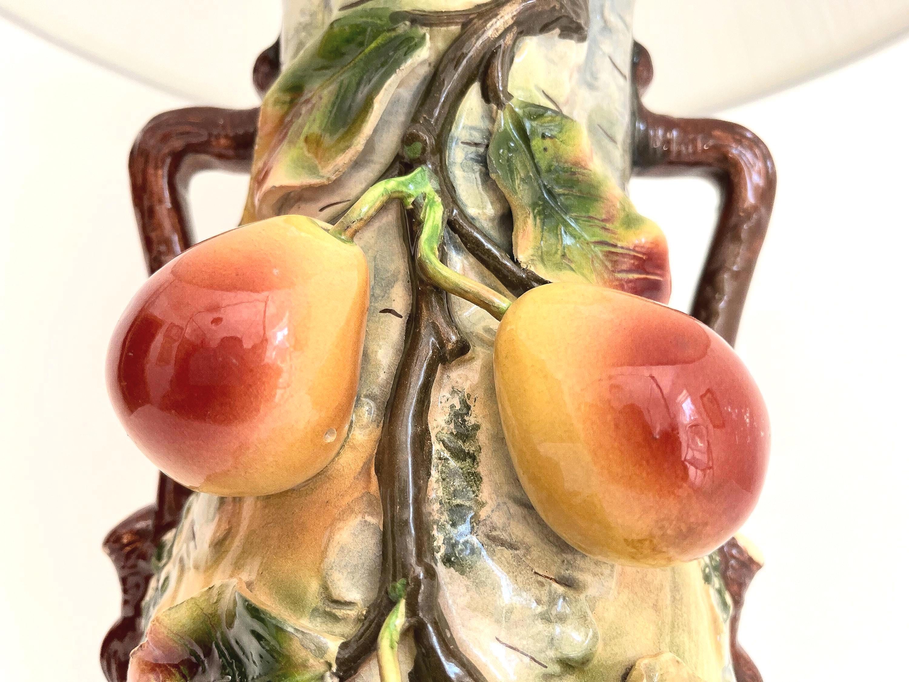 Gorgeous glazed ceramic majolica pear tree espalier lamp with large dimensional and applied pears, leaves, faux bois body, and tree branch handles set into a tiered gold metal base.
